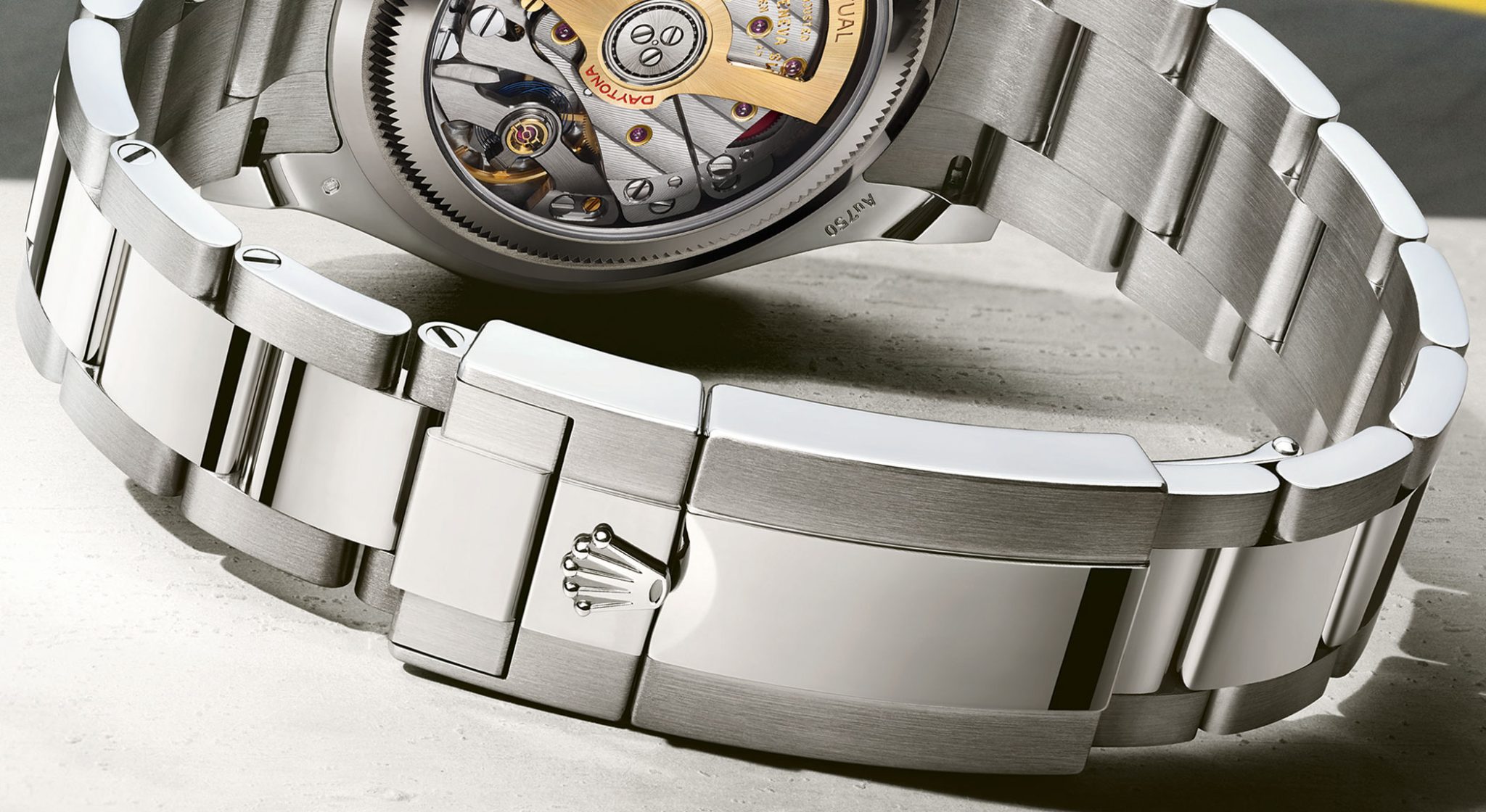 Scratch-resistant and anti-reflective sapphire crystal protects the sensitive movement on the front and back of the case. As a result, the sapphire crystal, framed by fluted metal, makes up the fully visible caseback and offers deep insights into the mechanisms of the ornate movement. The entire caseback has been firmly screwed down with a special key, and only authorized watchmakers can open it. In addition to the sealed caseback, the pushers and the 18-carat white gold triplock winding crown can also be screwed down. The latter possesses a triple sealing system and additional protection against water is provided by cams in the middle section. All these elements ensure that the Oyster Perpetual Cosmograph Daytona is completely waterproof up to a depth of 100 m.
