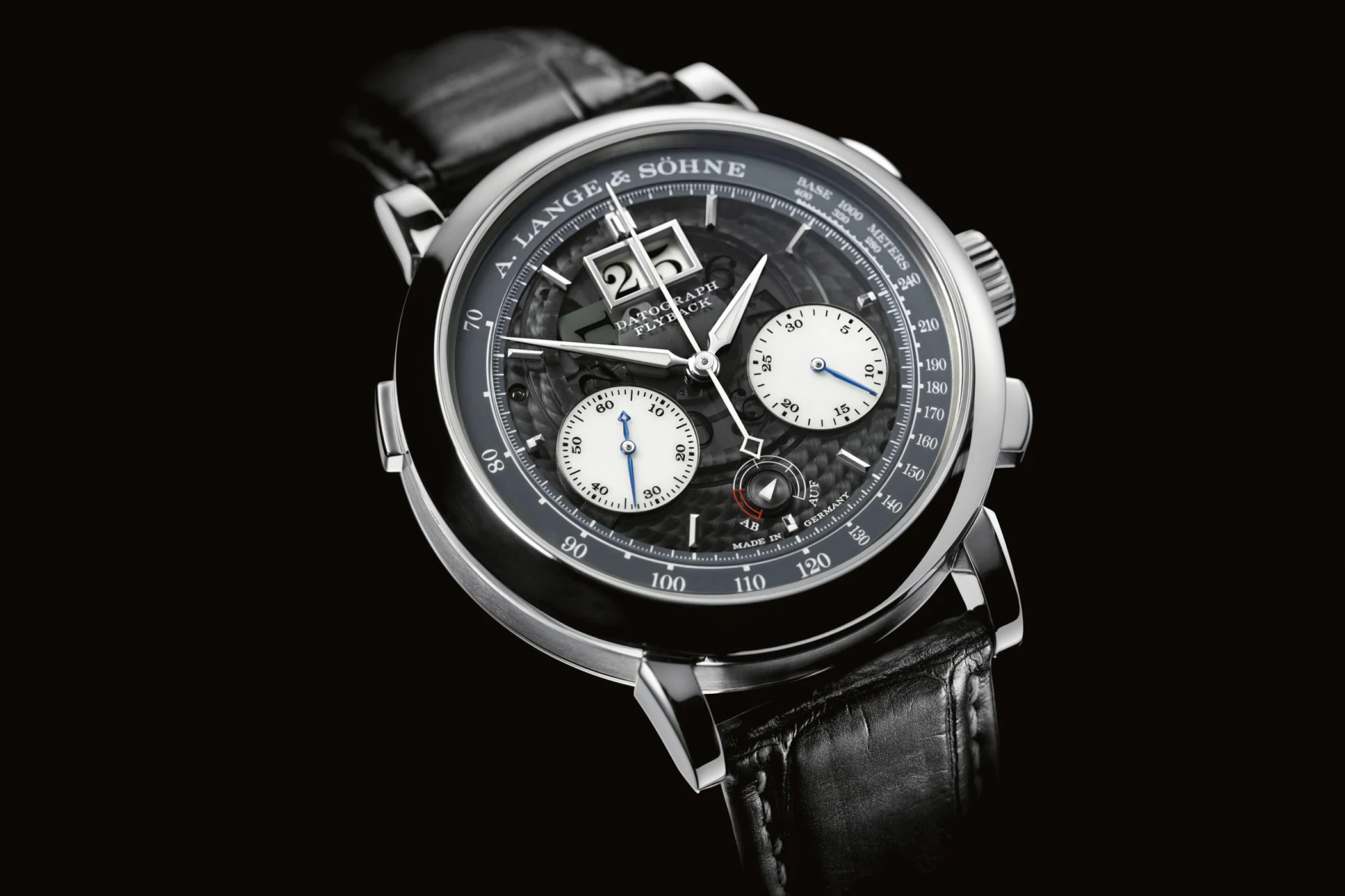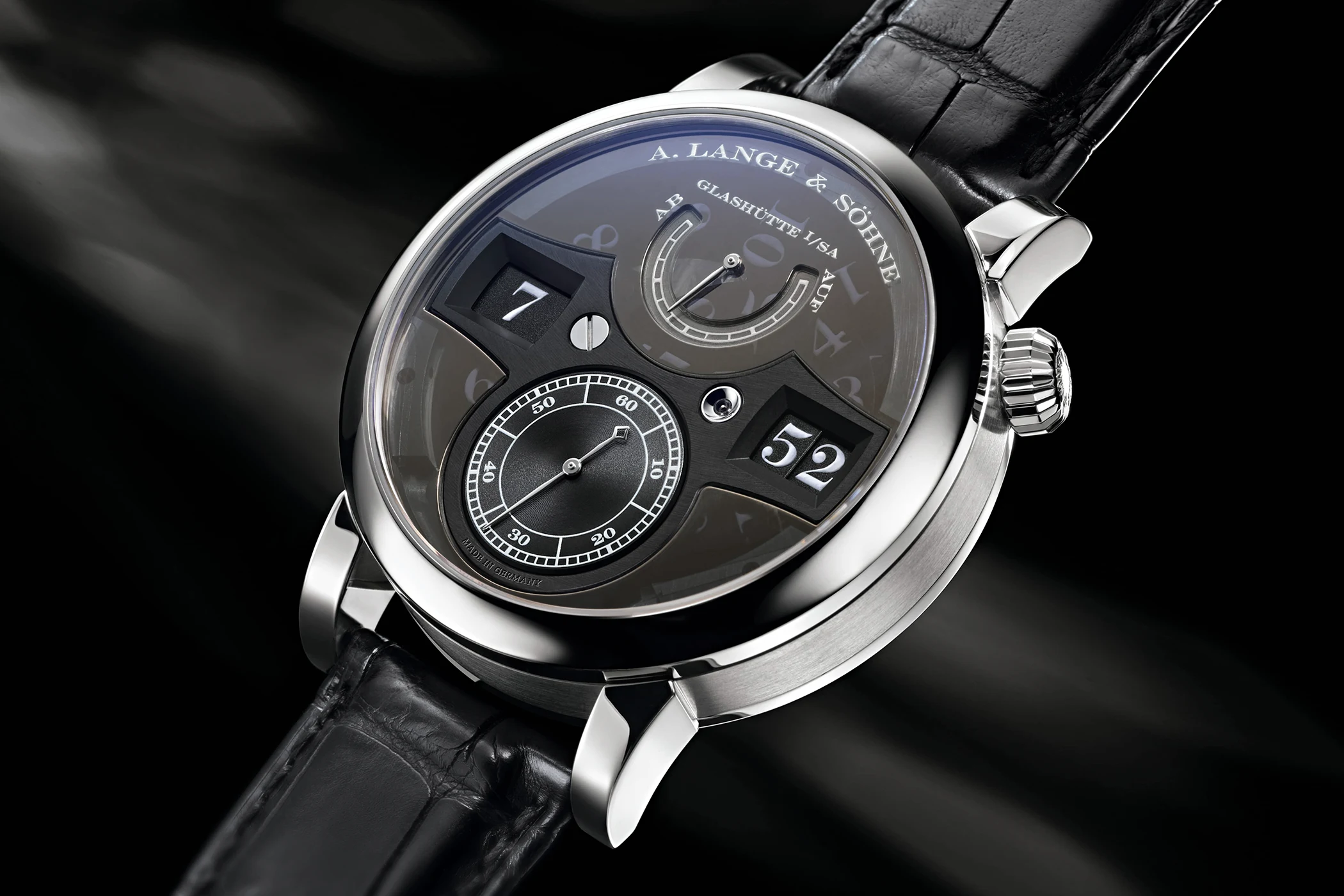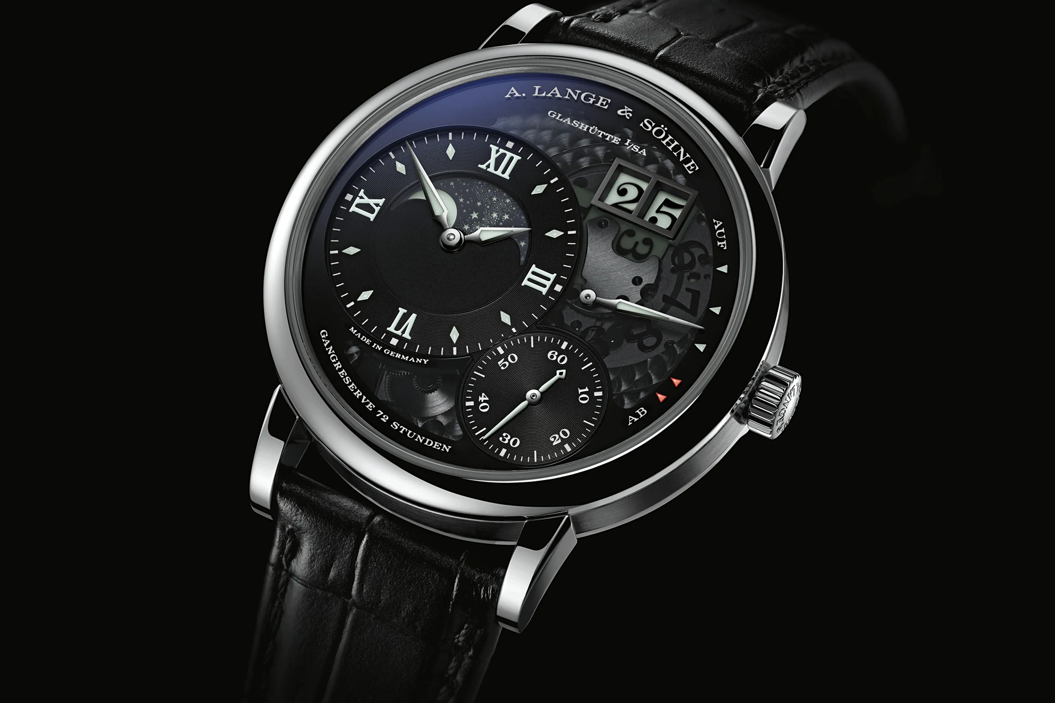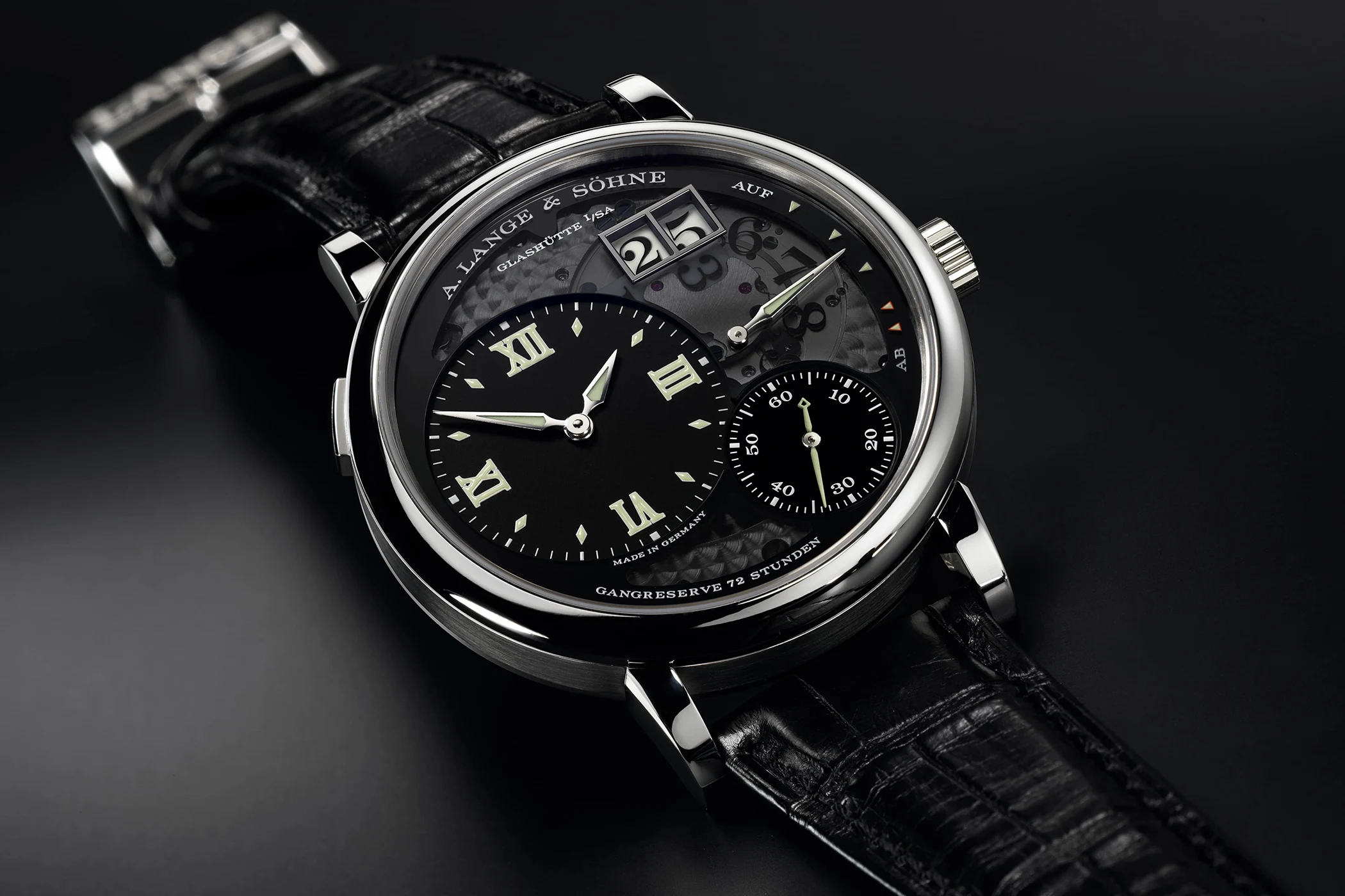 In terms of design, Lange has consistently focused on the contrast between light and dark in this model. The polished platinum case contrasts with the dark dial and the black alligator leather strap, which is hand-stitched. Rhodium-plated gold hands and white hour markers stand out clearly against the background, enhancing legibility.