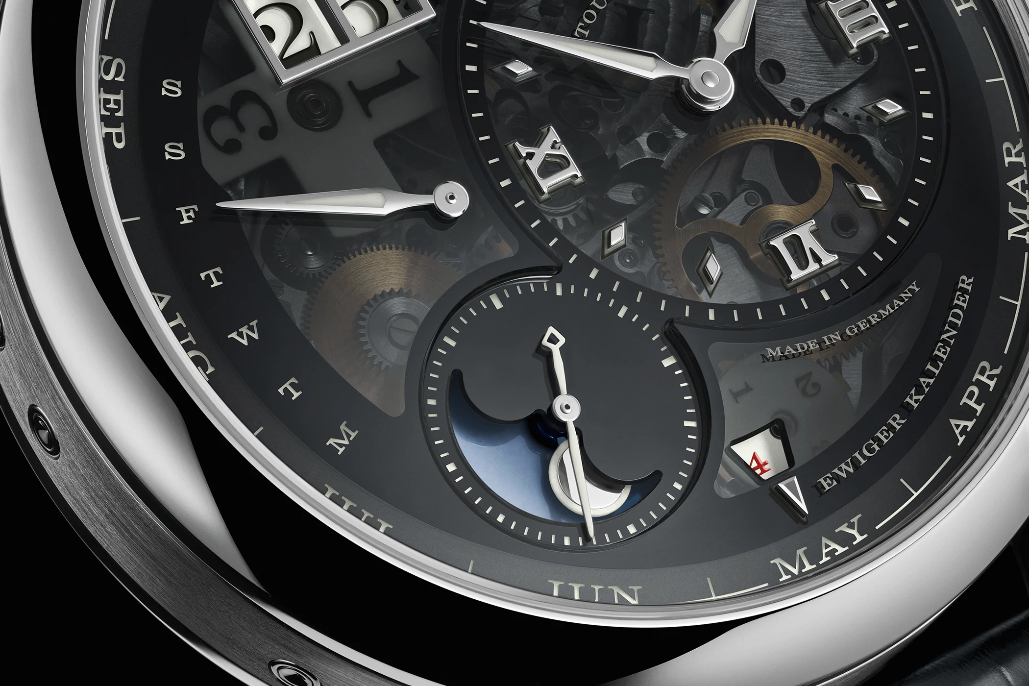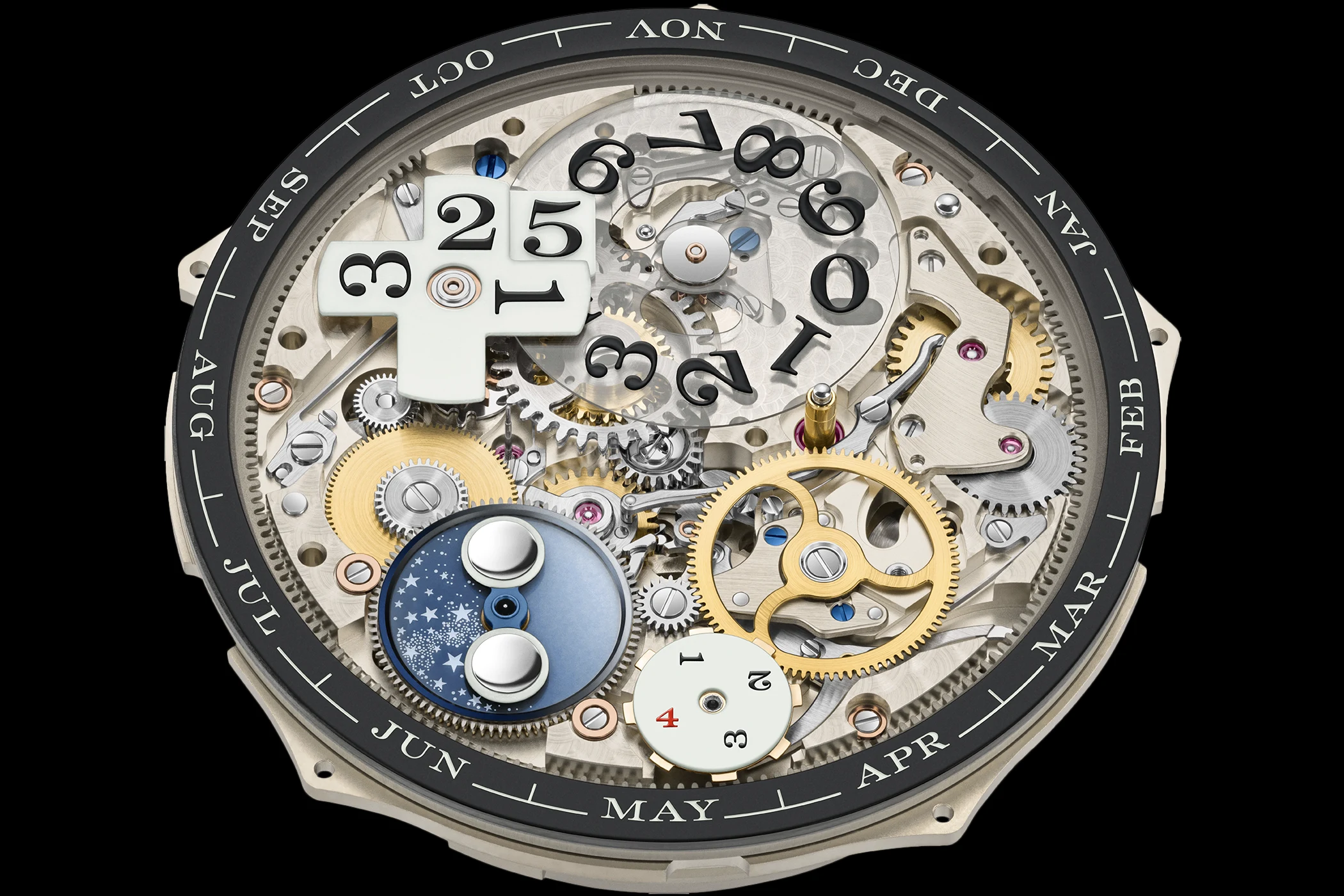 This design was the only way to incorporate the perpetual calendar into the asymmetrical layout of the Lange 1 without compromising the non-overlapping arrangement of the displays. The challenge: the month ring must jump 30 degrees at each change of month, a considerably greater distance than the 7.5 degrees covered by a conventional programme wheel. The switching energy is therefore accumulated throughout the day in two separate mainsprings. One drives the daily changes of the date, day of the week and moon phase, whilst the other drives the monthly advancement of the ring and the four-year disc.