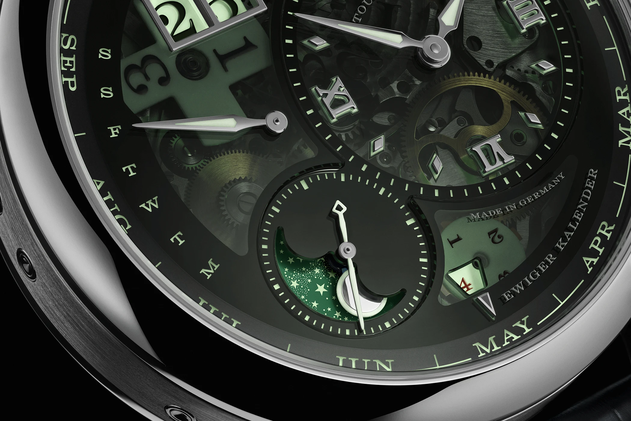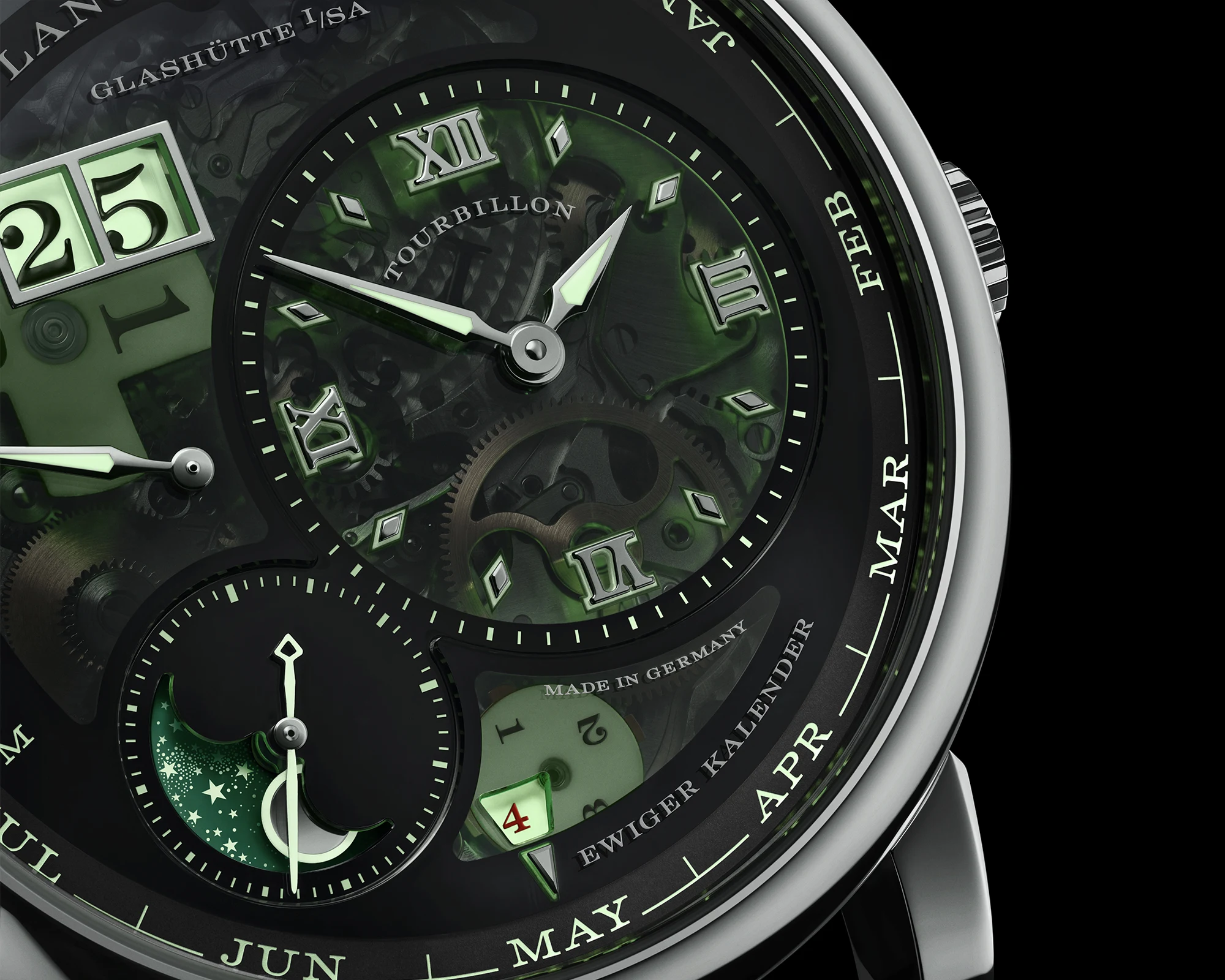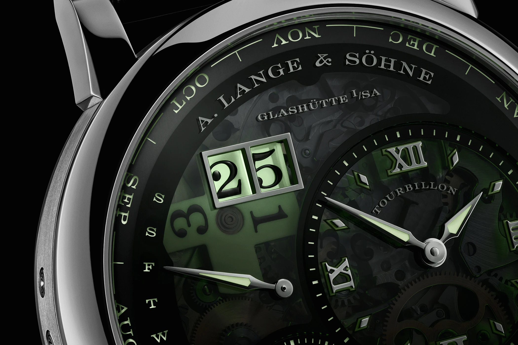 With the Lange 1 Tourbillon Perpetual Calendar “Lumen”, Glashütte’s most famous watch manufacturer presents the seventh model in its luminescent series. It all began in 2010 with the Zeitwerk “Luminous”, which was a real gamble at the time but proved to be a resounding success. This was followed by the Grande Lange 1 “Lumen” (2013), the Grande Lange 1 Moon Phase “Lumen” (2016), the Datograph Up/Down “Lumen” (2018), the Zeitwerk Honeygold “Lumen” (2021) and the Datograph Perpetual Tourbillon Honeygold “Lumen” (2024).