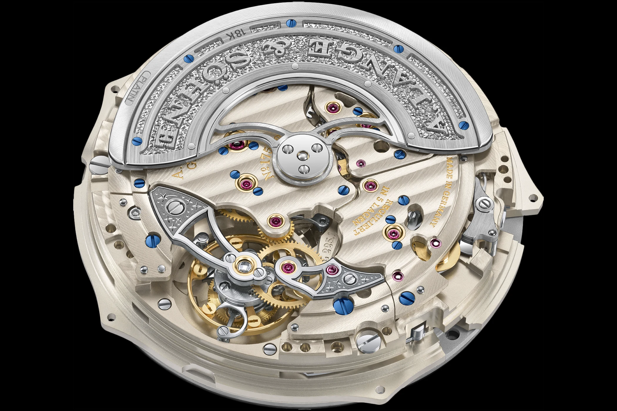 The automatic in-house calibre L225.1 is a completely new design. Its 685 components, 74 jewels and six gold chatons make it one of the most complex movements in the Lange portfolio. An eccentric balance wheel with an in-house balance spring serves as the rate regulator, operating at a frequency of 21,600 vibrations per hour. Winding is provided by a central rotor in white gold, whose outer oscillating weight in platinum delivers the necessary torque. The full power reserve is 50 hours.