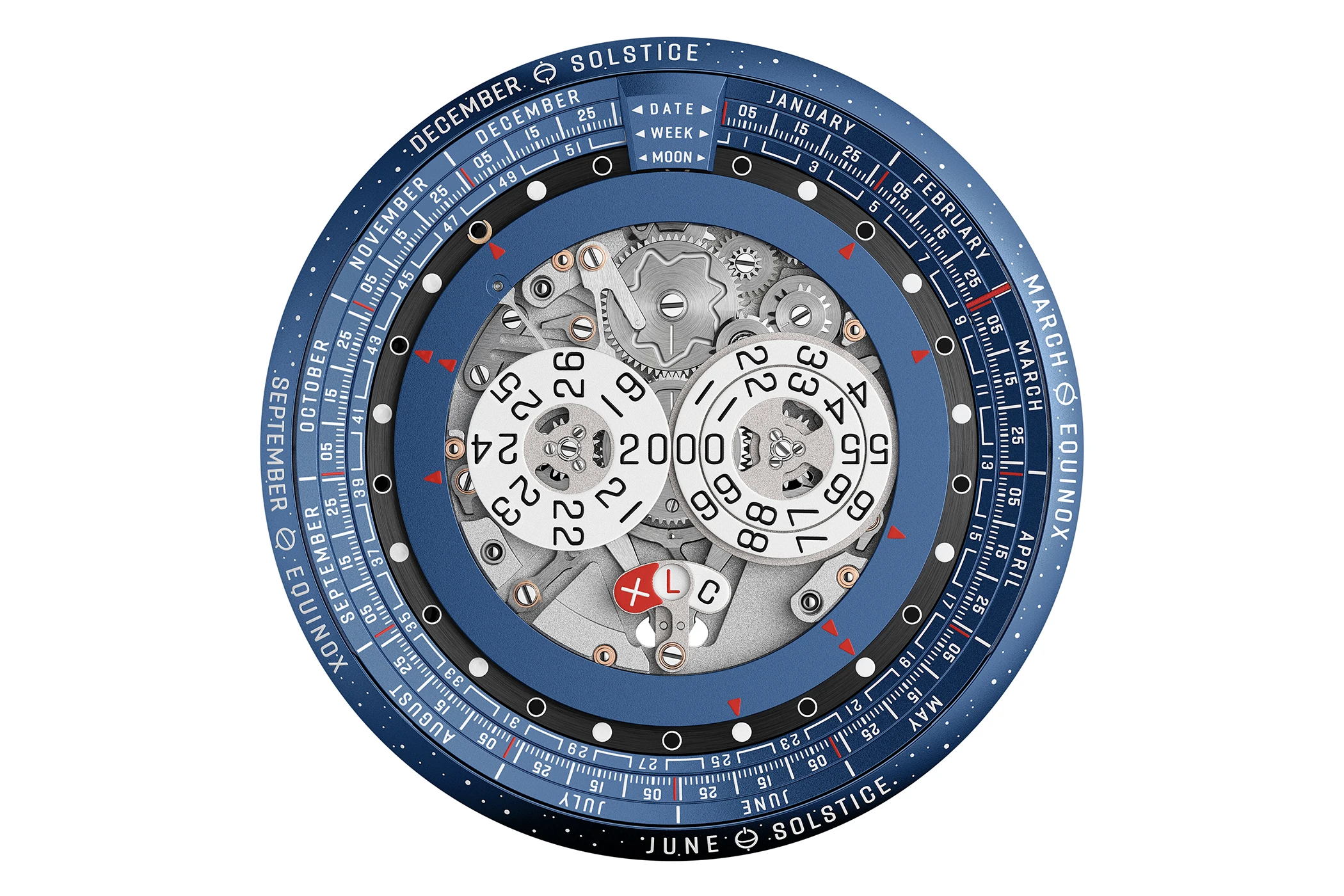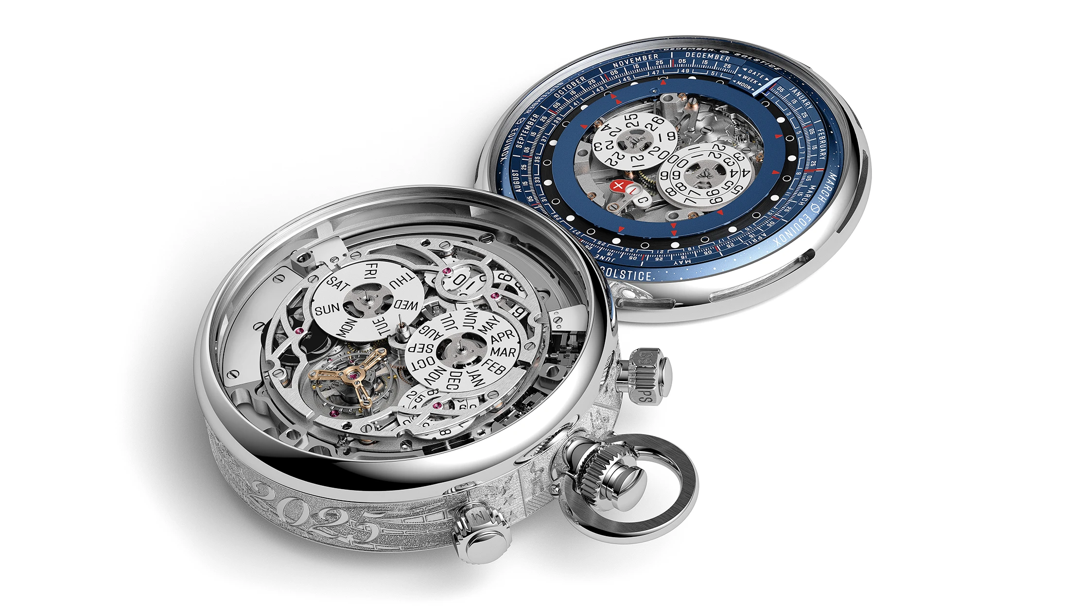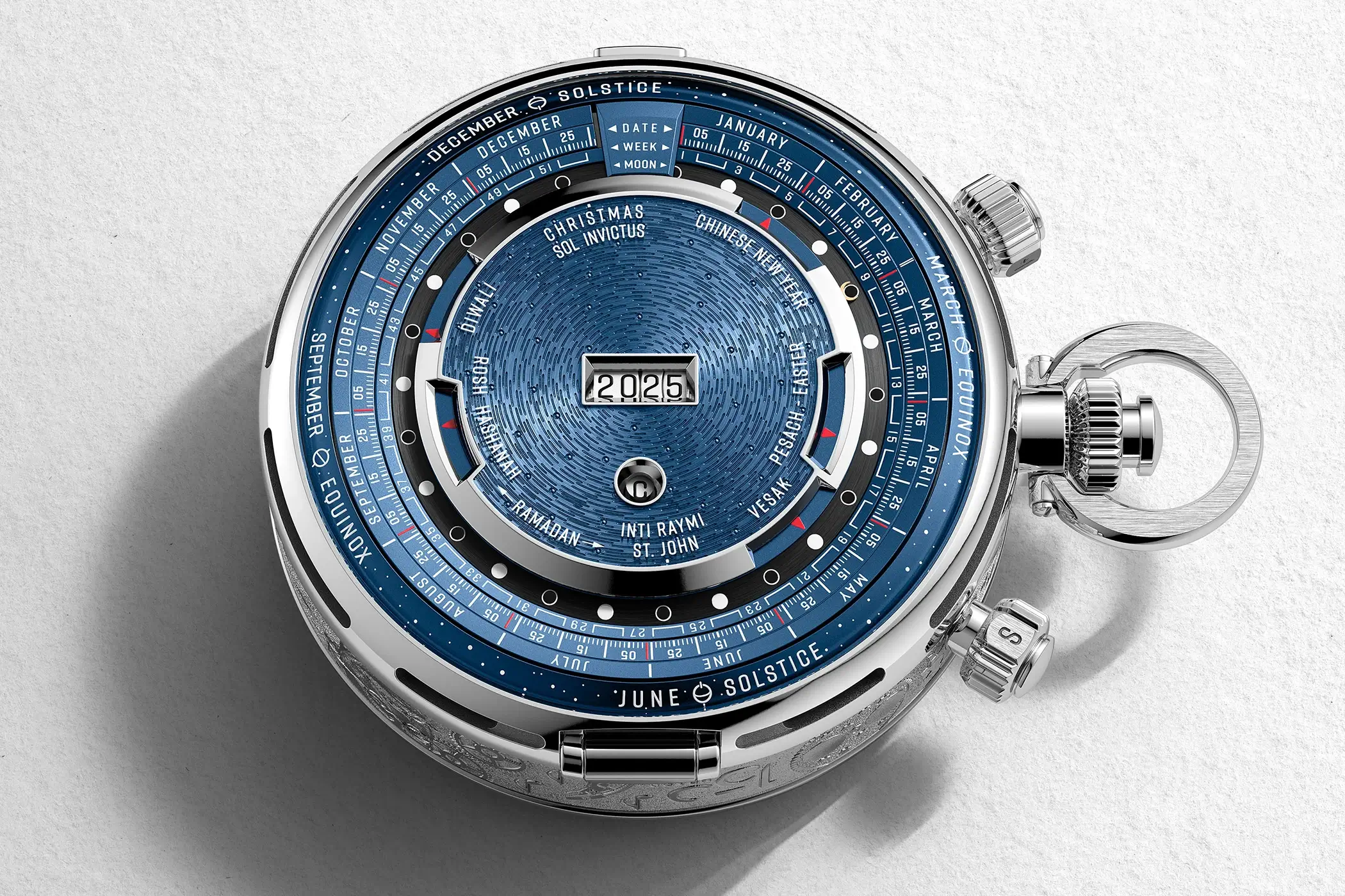 A total of 1,140 components are required to achieve this, and the result is impressive: among other things, the watch combines a grande sonnerie and minute repeater, a semi-Gregorian perpetual calendar, a split-seconds chronograph and a flying tourbillon. The universal calendar displays the solar and lunar cycles as well as the lunisolar cycle associated with both. Holidays closely linked to the solar calendar, such as Christmas, Easter, Ramadan, Rosh Hashanah and Chinese New Year, are also displayed.