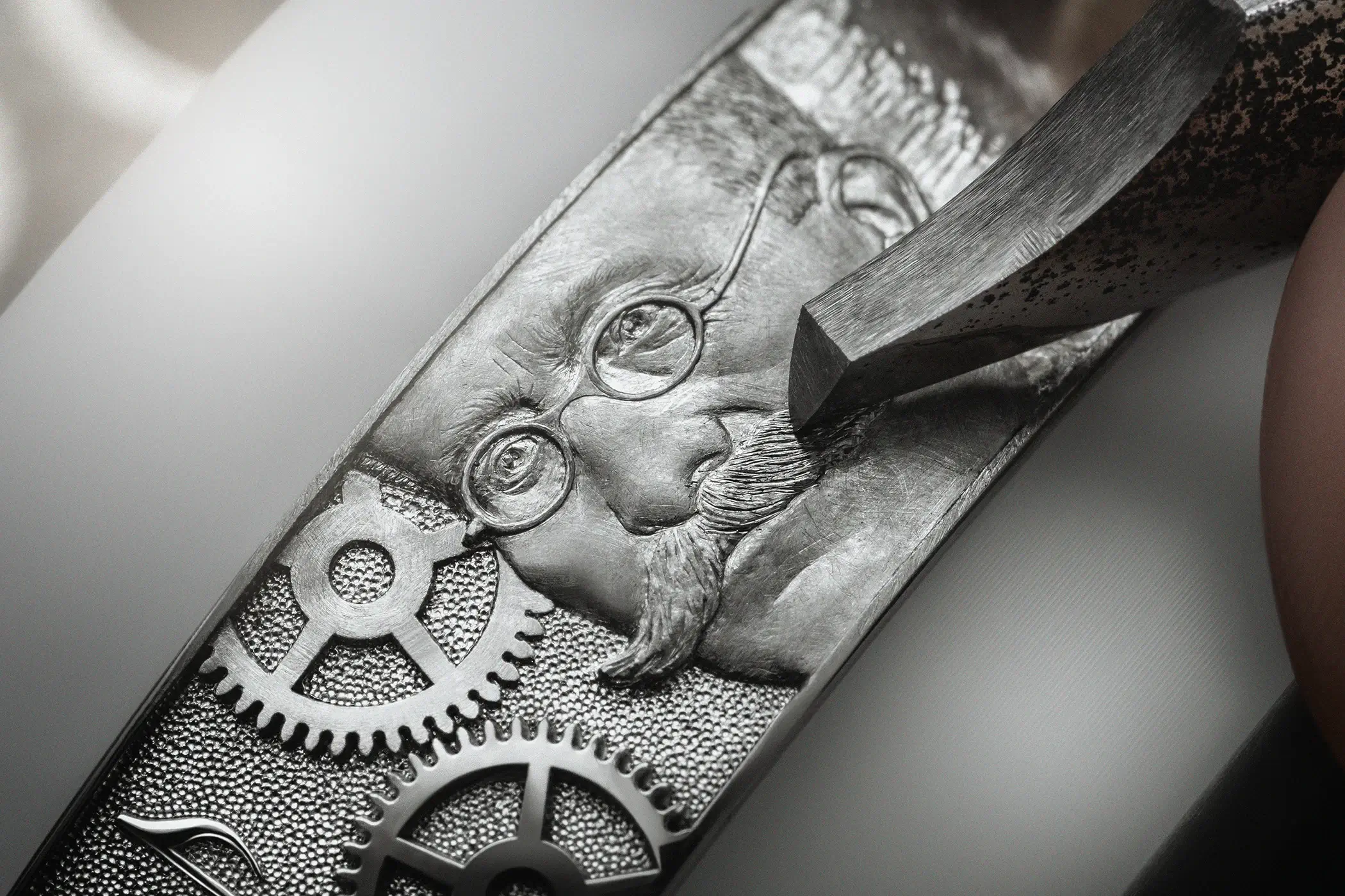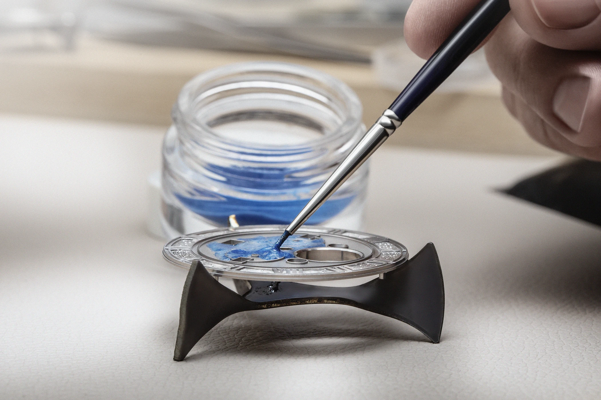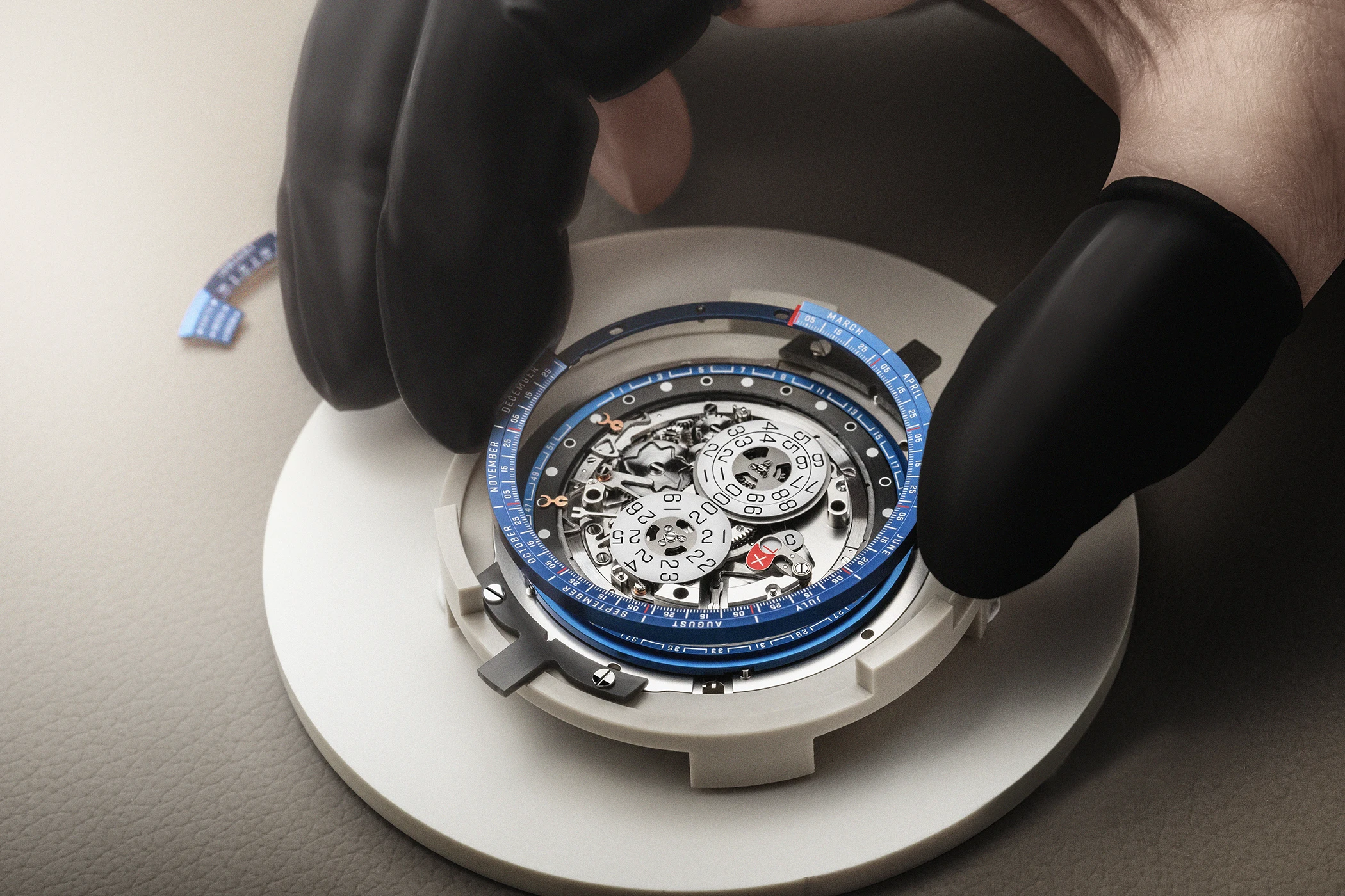 In keeping with the standards of this strictly limited masterpiece, the case and dials are also crafted from the finest materials: the platinum case is engraved by hand, the hands are made of blue Grand Feu enamel and the white gold numerals are also hand-engraved.