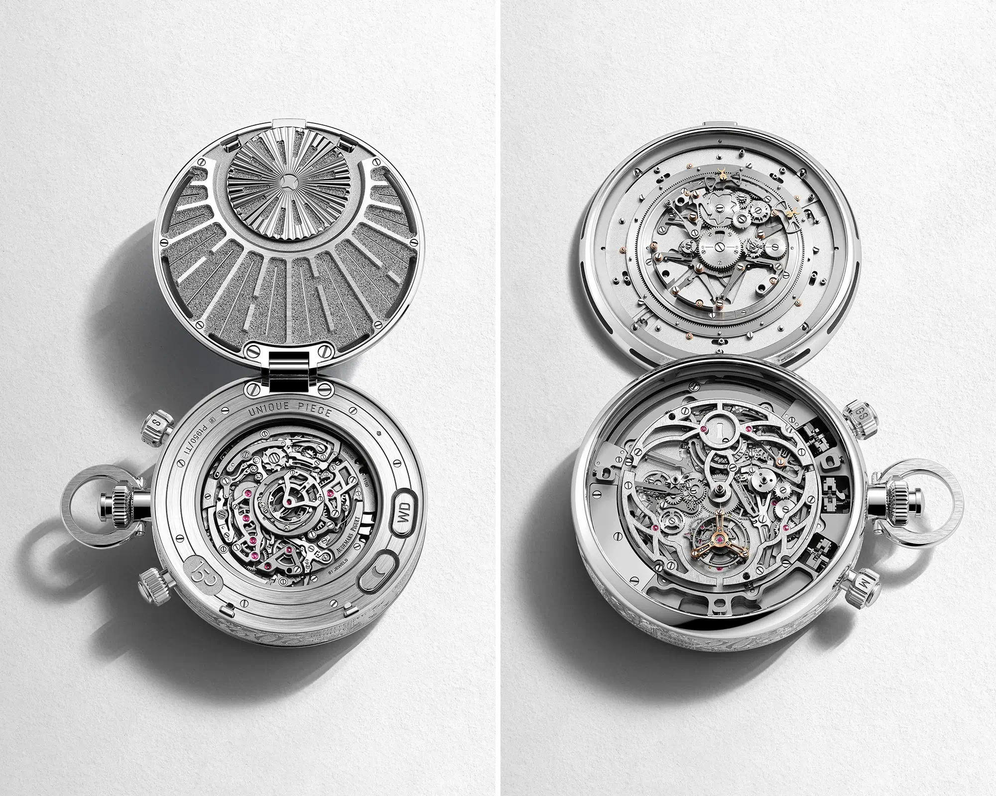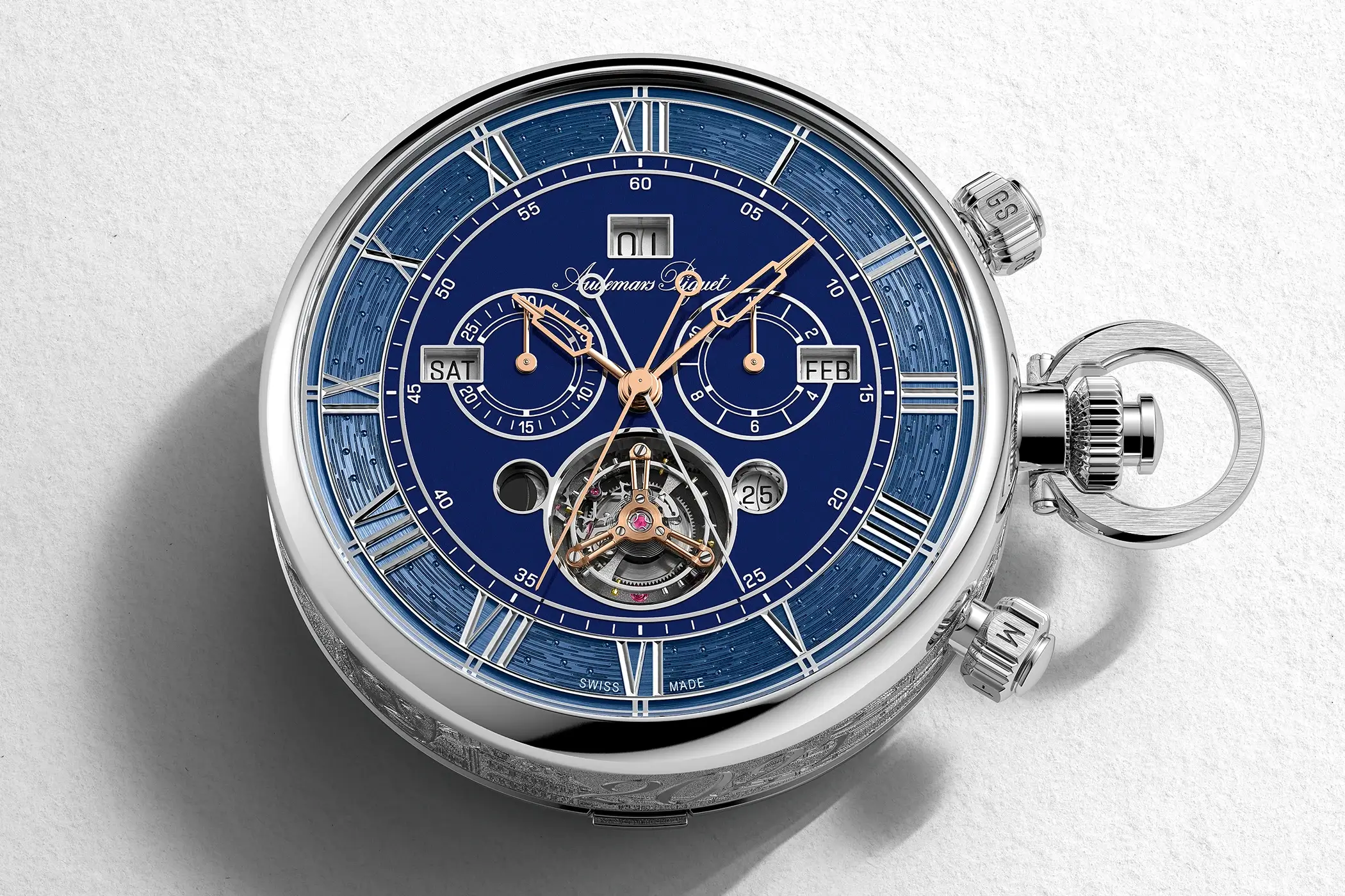 The platinum pocket watch follows in the tradition of its predecessors, such as the ‘L’Universelle’ from 1899 and ‘La Grosse Pièce’ from 1921, and is based on the automatic calibre 1000 from 2023. Now designed as a hand-wound model, the new calibre 1150 officially combines a total of 47 functions and 30 complications, although Audemars Piguet points out that this is a conservative count. Taking a more generous view, one could also arrive at 60 functions.