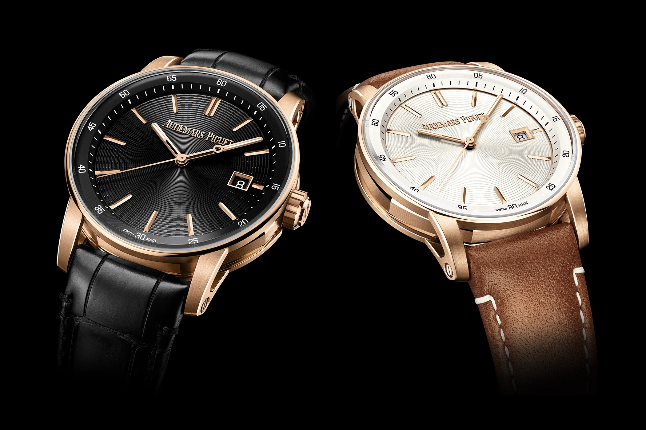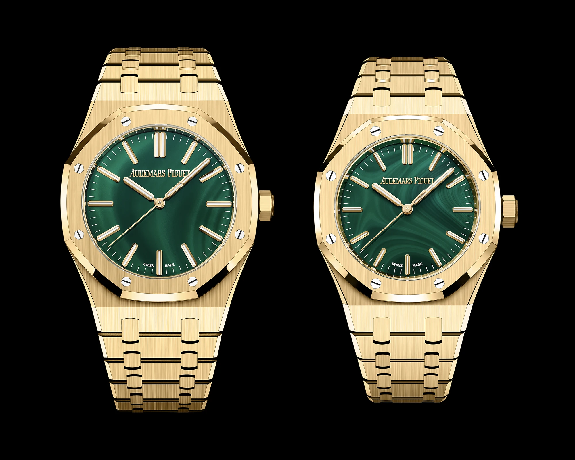 Two versions of the classic three-hand Royal Oak in yellow gold, with a choice of 41 or 37 millimetre diameters (references 15513BA.OO.1320BA.01 and 15552BA.OO. 1356BA.04) with stone dials made of malachite. The combination of yellow gold and dark green is a perennial favourite among collectors for good reason – and it works here too.