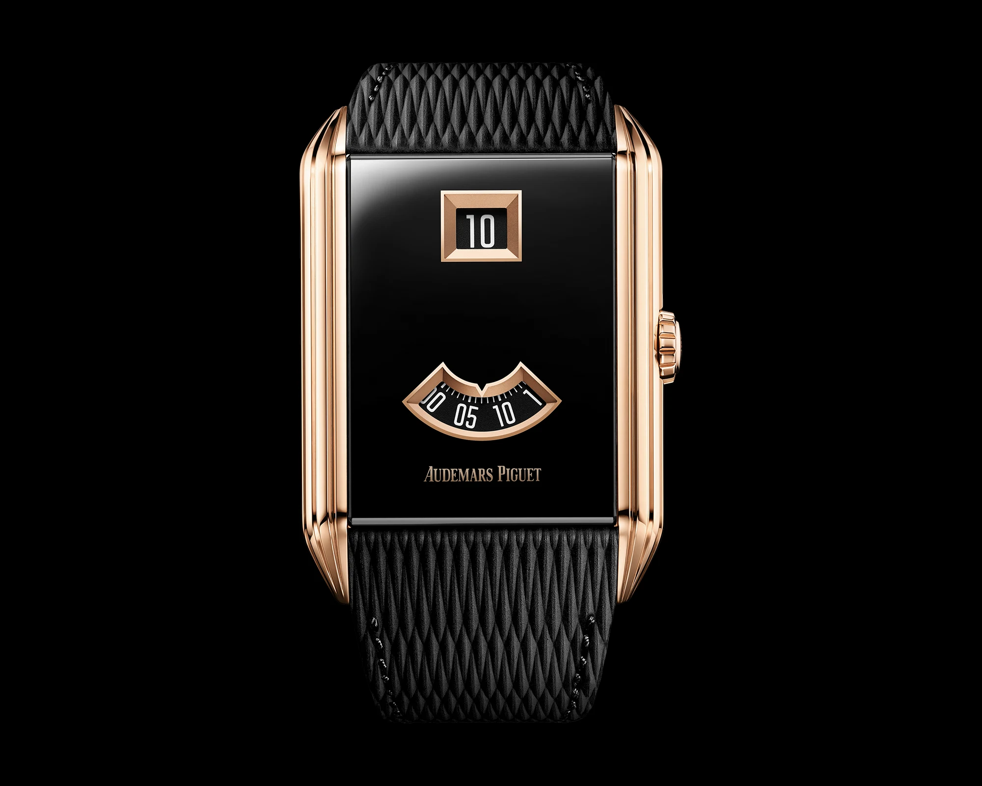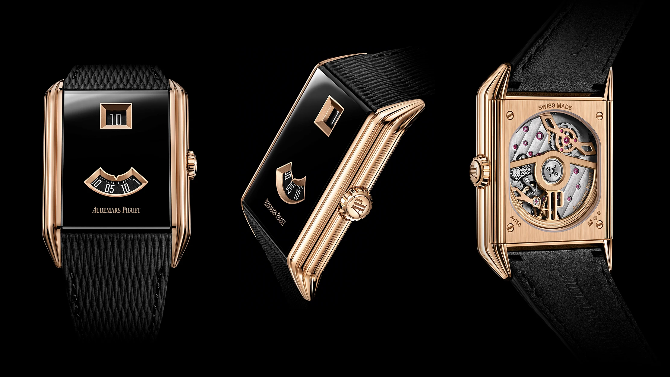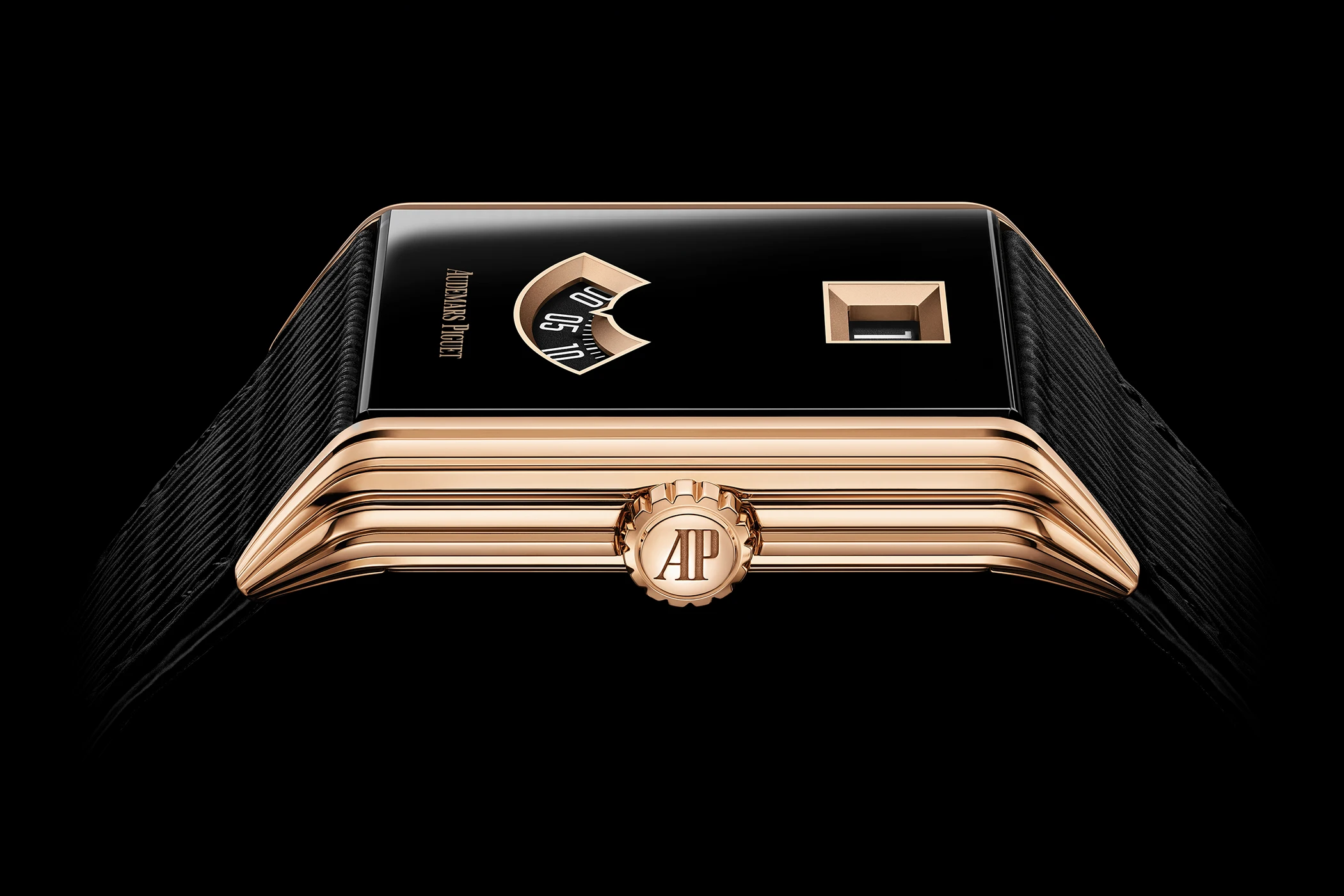 Rectangular timepieces were very popular back then – think of Cartier’s Tank from 1917 or Jaeger-LeCoultre’s Reverso, launched in 1931 – and this shape is currently enjoying a resurgence in popularity, from Patek Philippe’s Cubitus to Hublot’s Square Bang. However, Audemars Piguet’s ‘Jumping Hour’ takes a much more graceful approach, combining its classic look with the advantages of modern manufacturing: the 34-millimetre case, 8.8 millimetres high, with its Art Deco-style stepped sides, is made of rose gold, while the strap and face of the watch are black. The dial – or should we rather refer to it as the top of the case in this case? – is made of PVD-treated sapphire crystal. Whereas collectors of a Cartier Tank à Guichets from last year’s Privé collection have to worry about scratches on the gold case, future owners of an AP Jumping Hour can remain more relaxed.