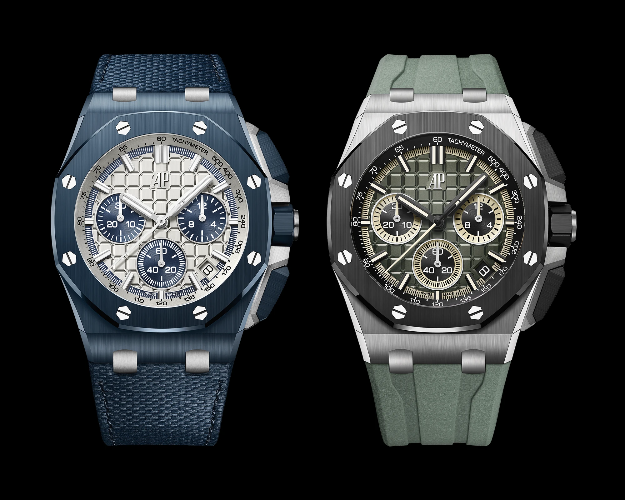 Meanwhile, Chrono No. 2 has a much more aggressive look with a titanium case, black ceramic bezel and green Méga Tapisserie dial with colour gradient and grey-green rubber strap (reference 26420IO.OO.A402CA.01). In this version, the Offshore is even more masculine. A watch for survival camp, while the blue and cream version feels more at home in the marina.