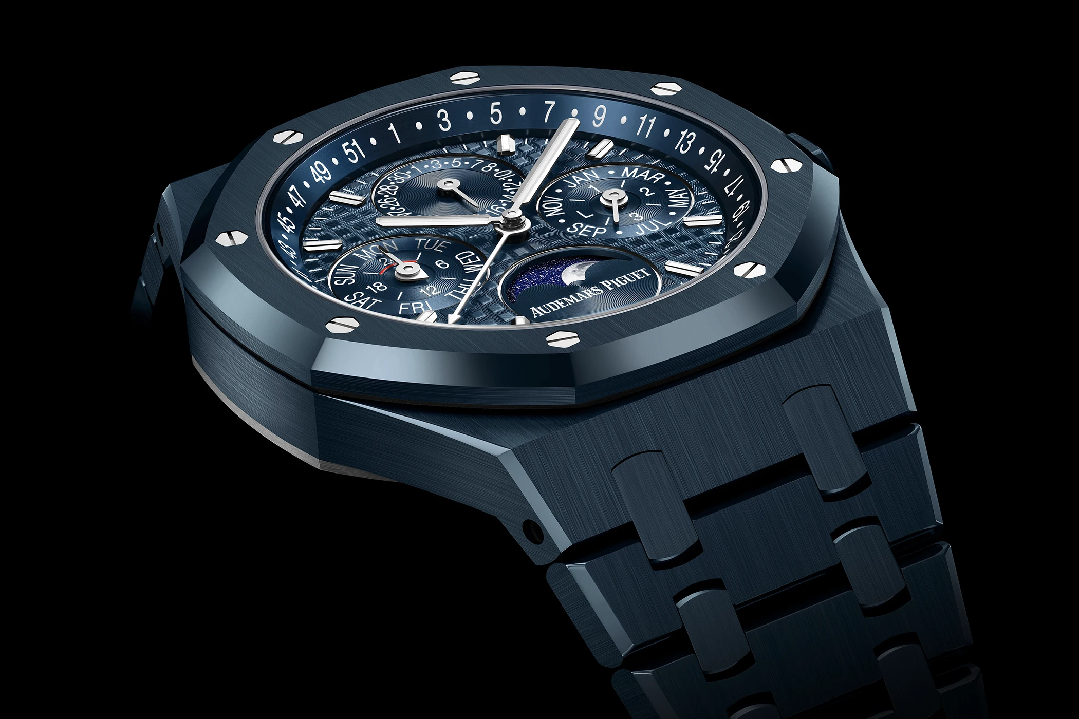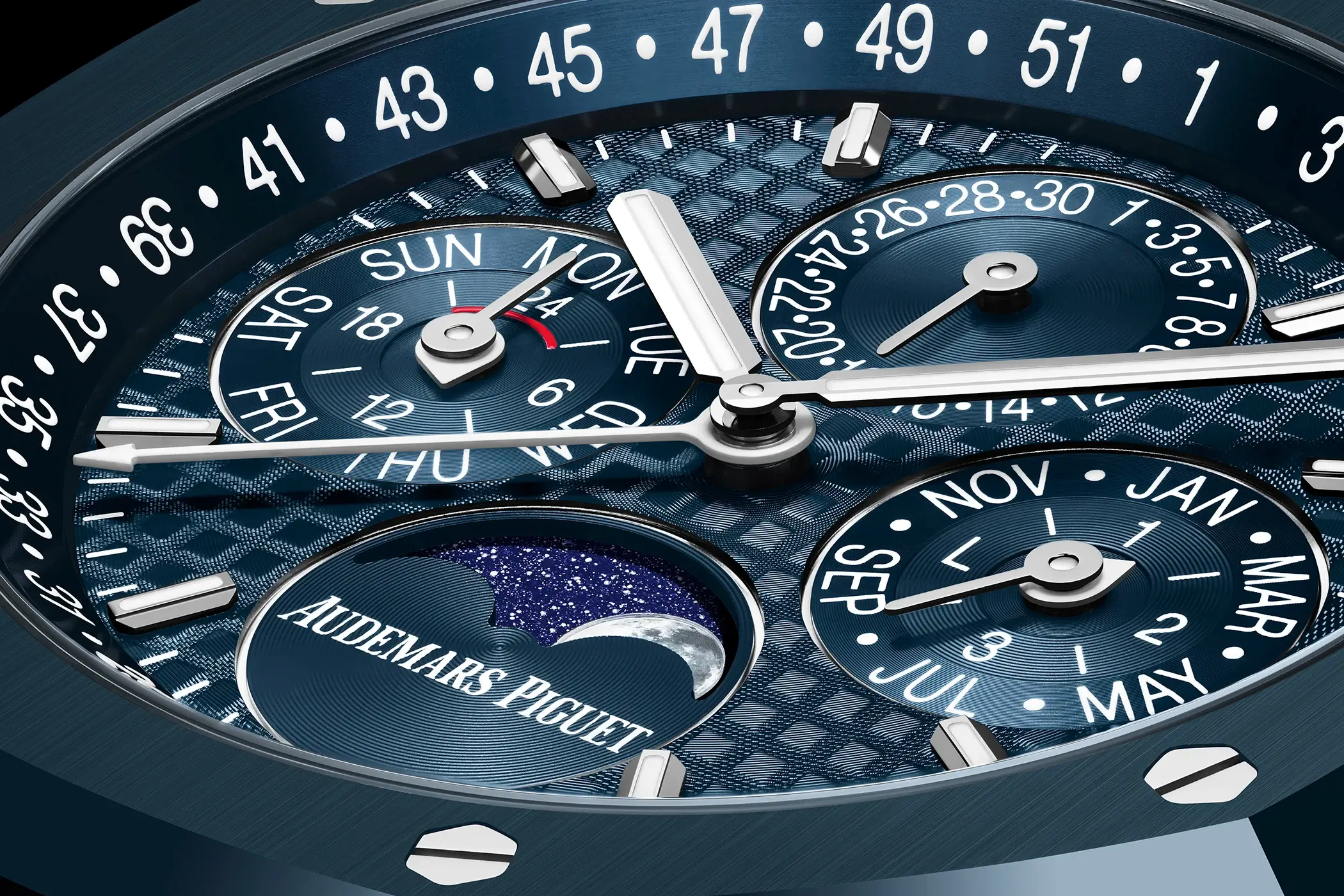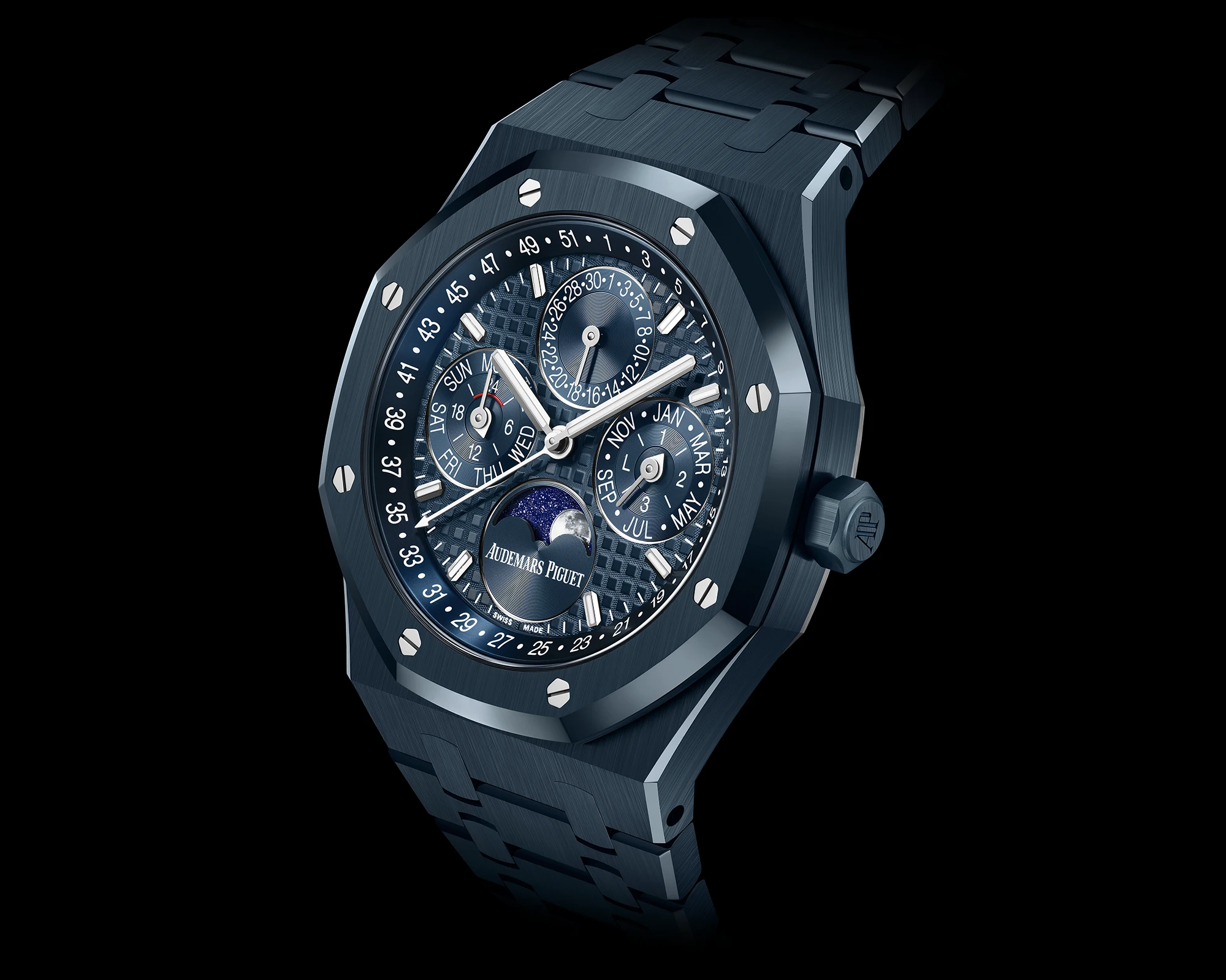 Four further innovations impressively demonstrate the remarkable balancing act achieved by Gerald Genta’s Royal Oak design. First, there is the perpetual calendar in deep dark blue ceramic (reference 26674CD.OO.1225CD.01), a shade known at Audemars Piguet as ‘Bleu Nuit, Nuage 50’, the dark blue shade introduced last year to mark the 150th anniversary, which has a completely different depth and elegance to its predecessor. Most recently, this colour attracted a lot of attention on Aryna Sabalenka’s wrist at the Australian Open. This new perpetual calendar is also equipped with the new, improved calibre, while the quality of the ceramic bracelet is considered the gold standard in the industry: the material makes the watch very light, while maintaining the value of the overall product. Where other ceramic bracelets can quickly appear somewhat flimsy and plain, the dark blue bracelet with its satin-finished surfaces is extremely impressive.