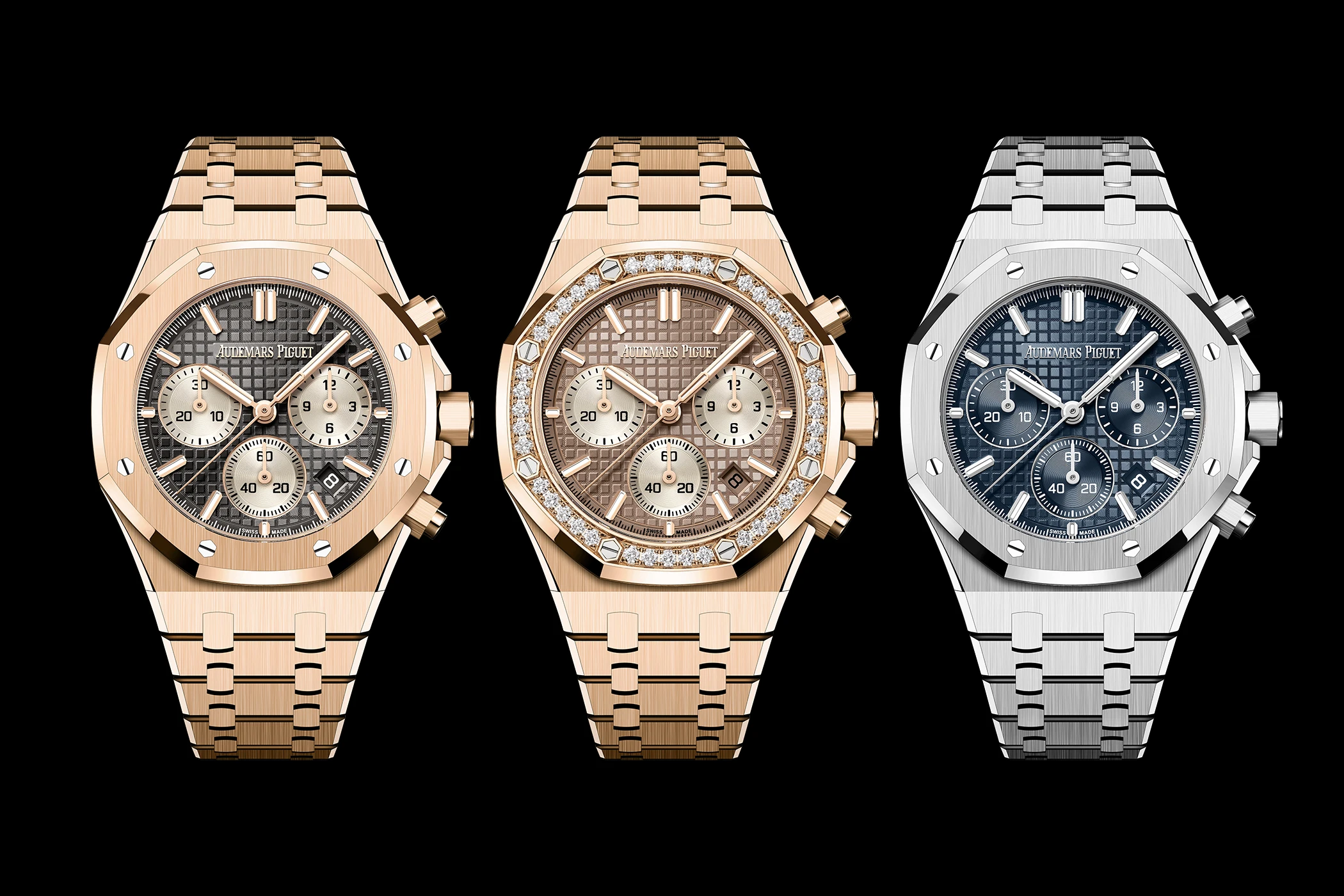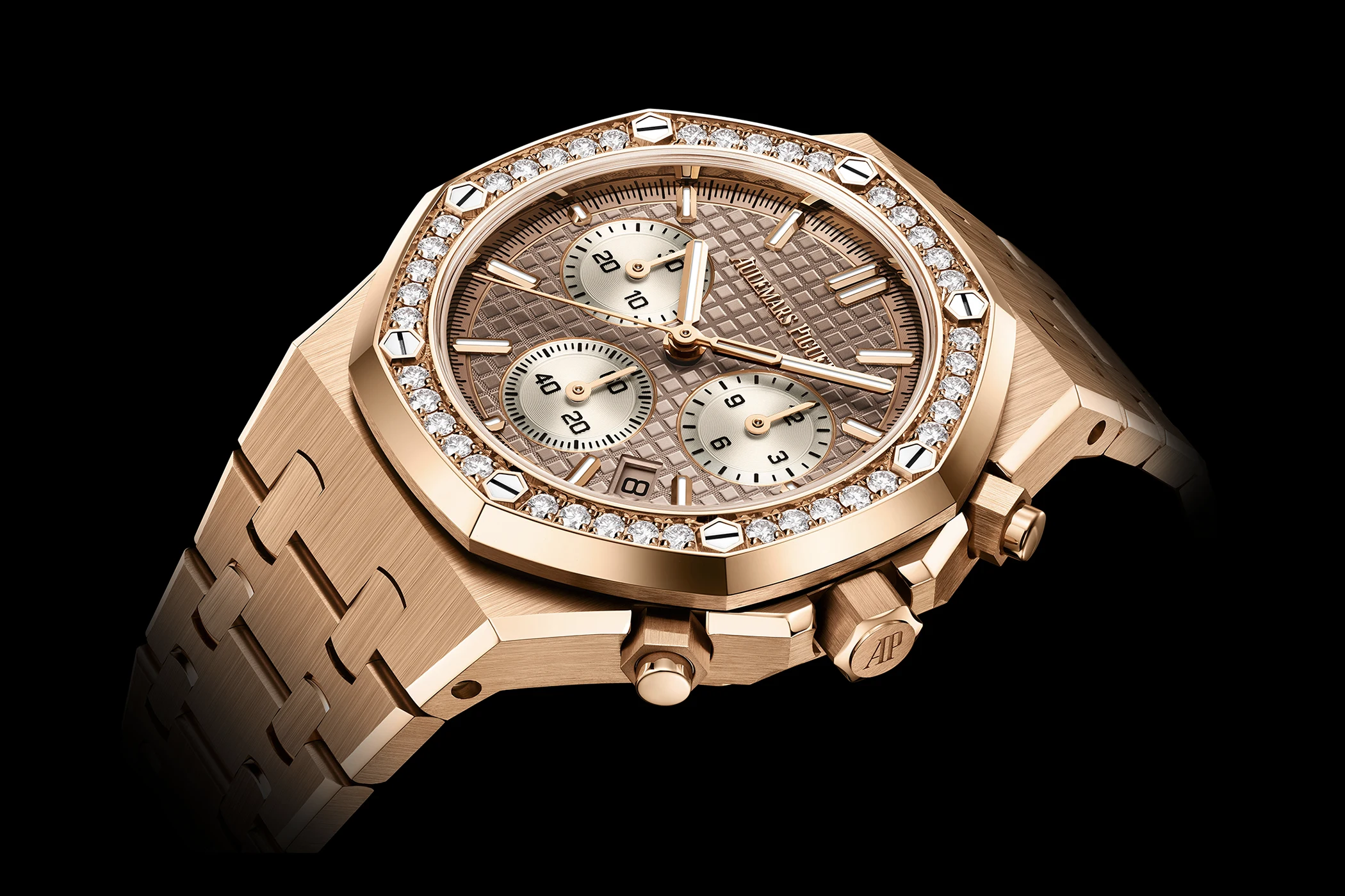 This new chronograph is initially available in three versions: stainless steel with a dark blue tapisserie dial for the sportiest interpretation (reference 26450ST.OO.1356ST.01), rose gold with a dark grey dial and silver subdials (reference 26450OR.OO.1356OR.01), and in another rose gold version with a ‘sand gold’ dial and beige subdials as well as a diamond bezel (reference 26450OR.ZZ.1356OR.01). As a fan of the steel Chronos with a grey dial, its demise is naturally regrettable from a personal point of view, but it is likely that the blue dial will find many fans, while the version with a gemstone bezel is an extremely elegant form of sporty jewellery watch.