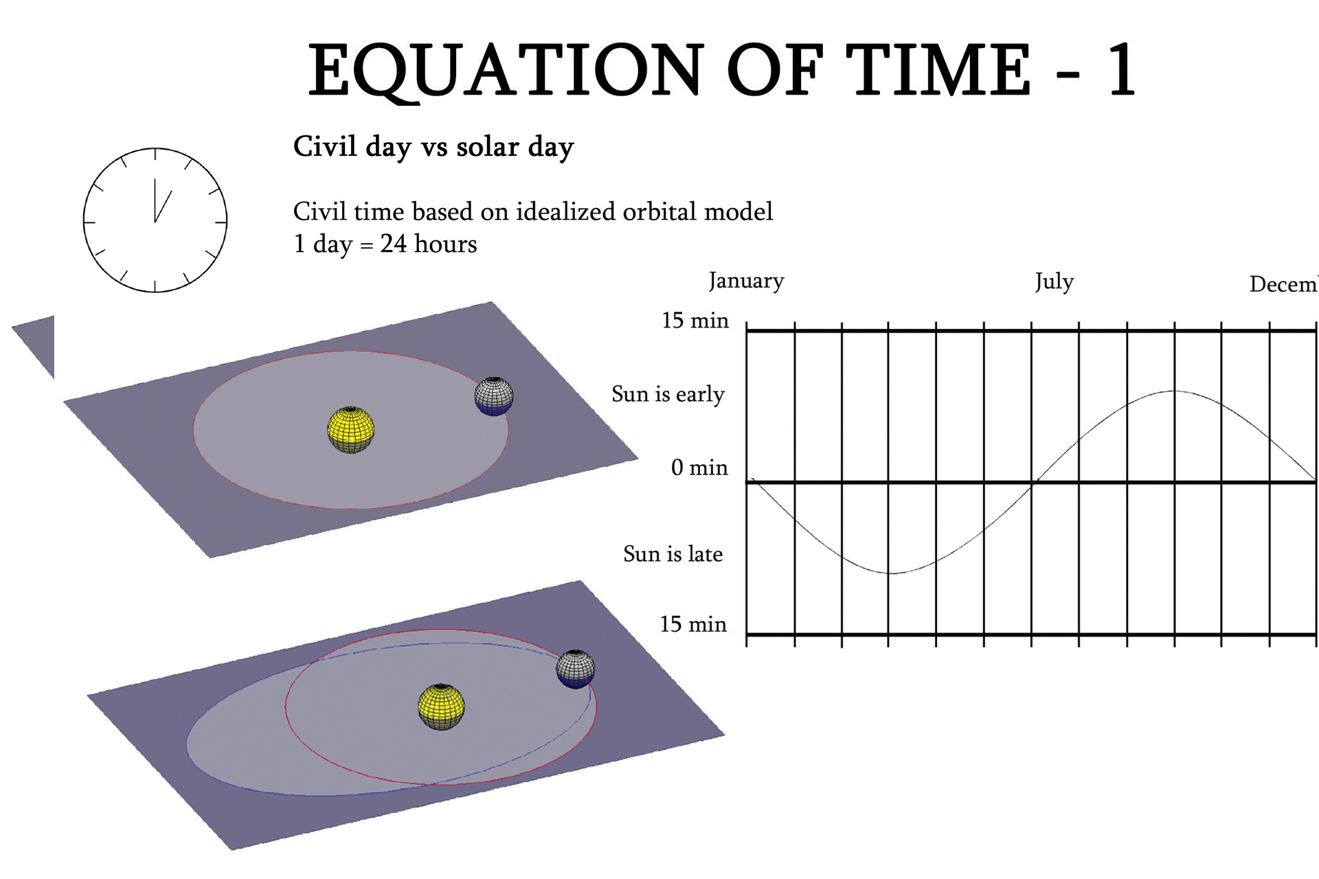 We distinguish between civil time (mean solar time) and true solar time. Our clocks, no matter if analogue or digital always display the time divided by 24 hours. As the Earth orbits around the sun in an elliptical rather than circular manner and due to the inclination of the Earth’s axis, it causes deviations of time throughout the year of as much as -16 minutes (November 3rd) and +14 minutes (February 11th). At the beginning of the year the Earth orbits around the sun at a speed of about 29 km/s, picks up some more speed during the year and reaches 30 km/s on June 21st. All these factors contribute to the equation of time.