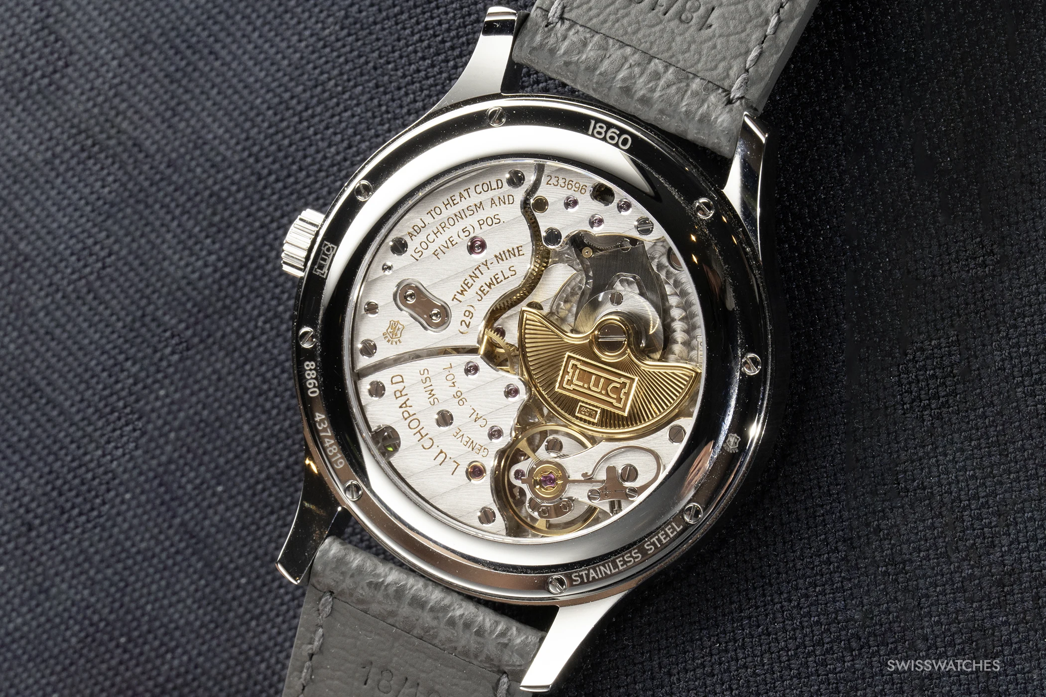 This in-house alloy was first introduced in 2019 with the Alpine Eagle collection and consists of 80 per cent recycled steel. On the new L.U.C 1860, it features a vertical satin finish on the sides and surfaces between the case lugs, whilst the bezel and case back—which features a sapphire crystal window—are polished.