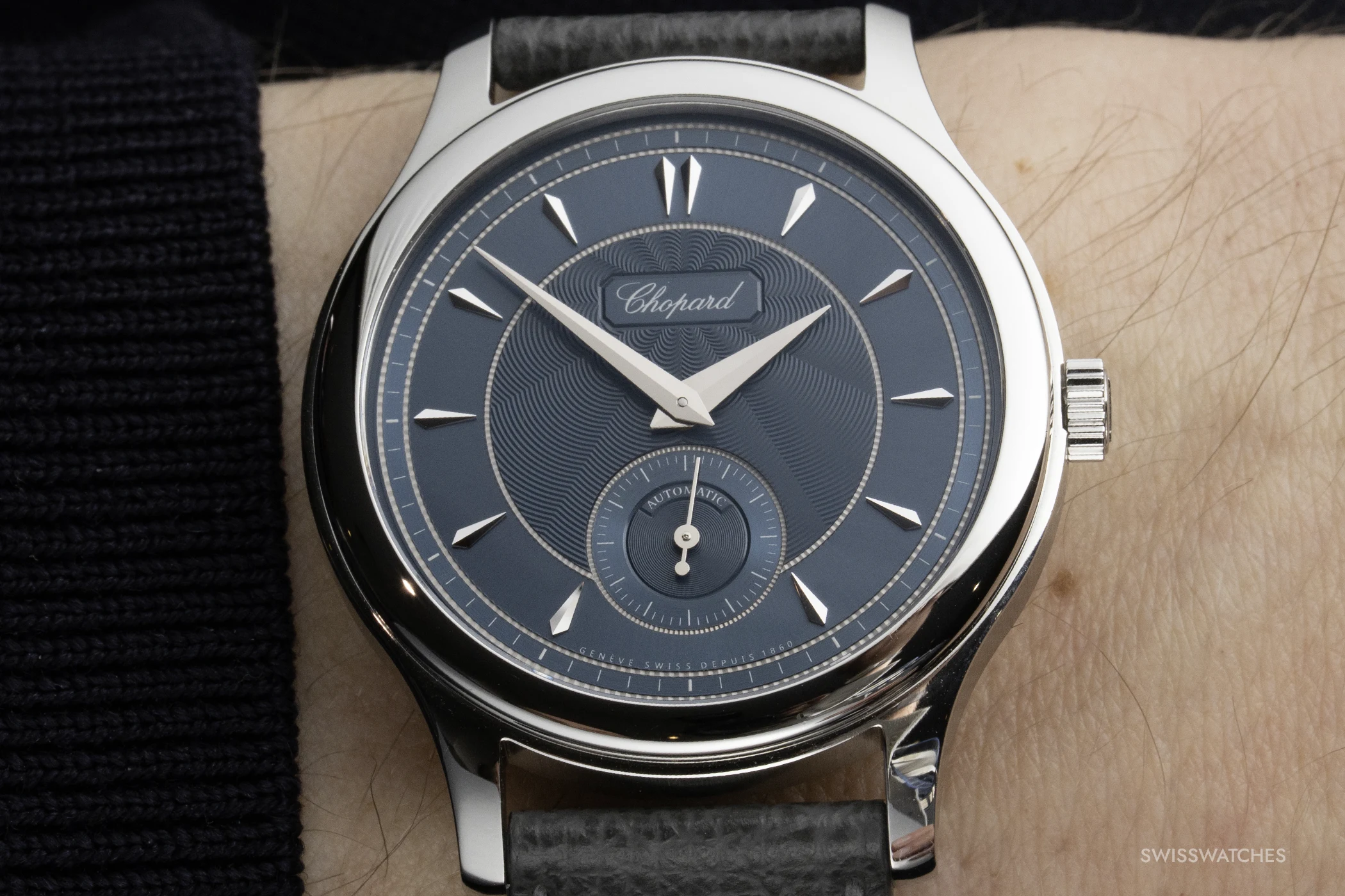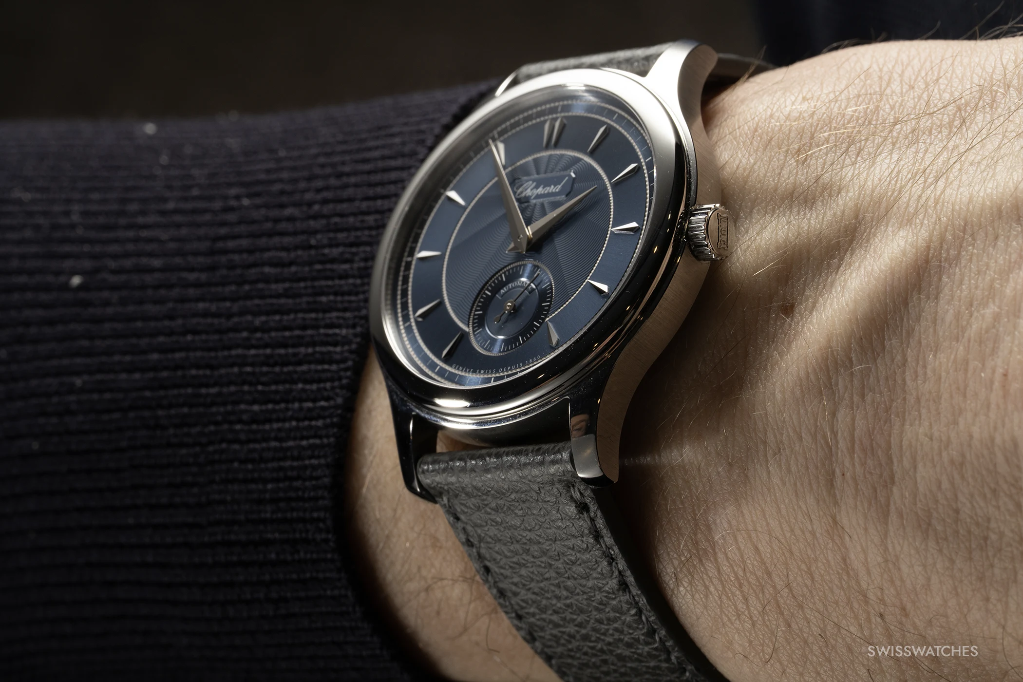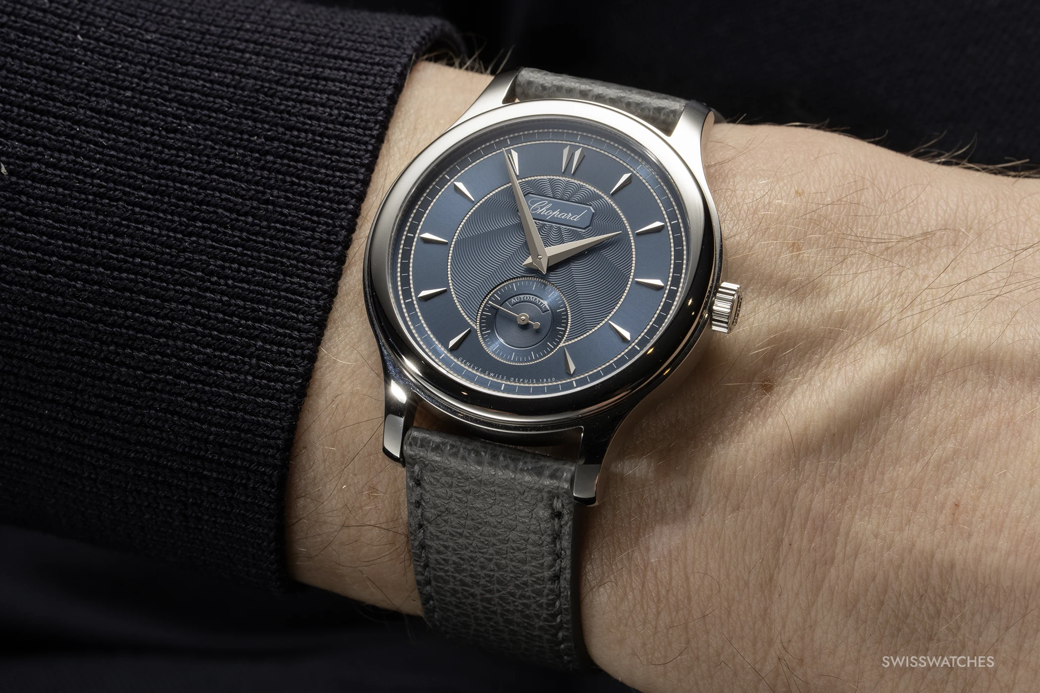 The colour of the dial, protected by sapphire crystal with anti-reflective coating on both sides, bears the evocative name ‘Areuse Blue’, inspired by the River Areuse in the Val-de-Travers near Fleurier. Its shifting shades of blue are reflected in the guilloché, sunburst pattern of the white gold dial. This is created in the workshops of dial specialist Metalem, which belongs to Chopard but also supplies other luxury watch brands.