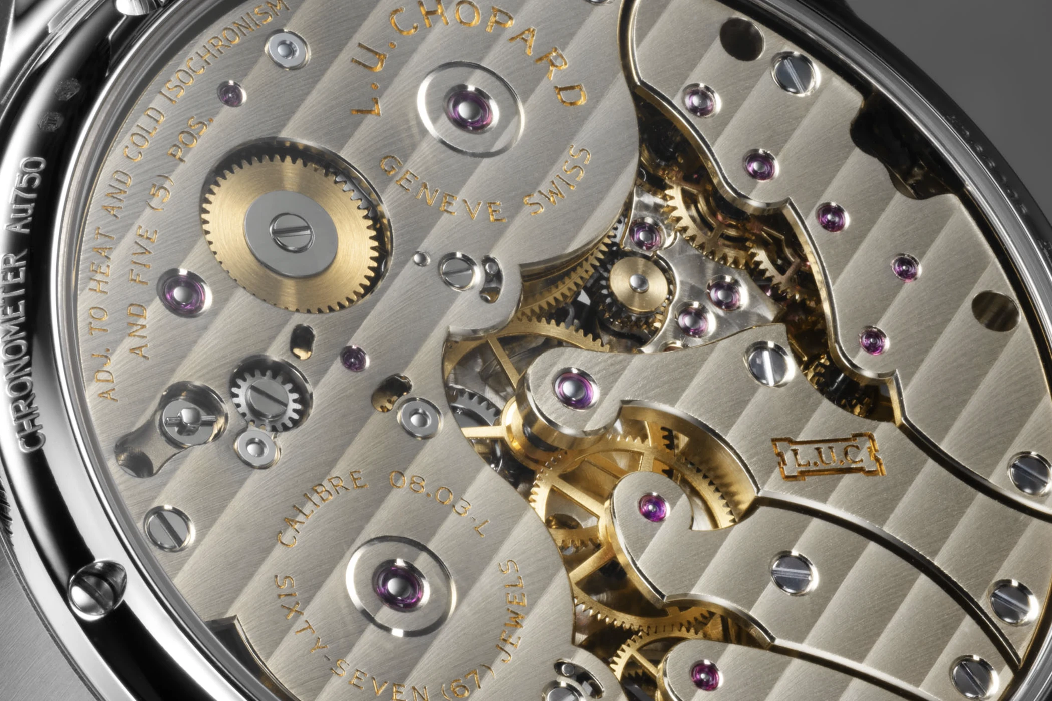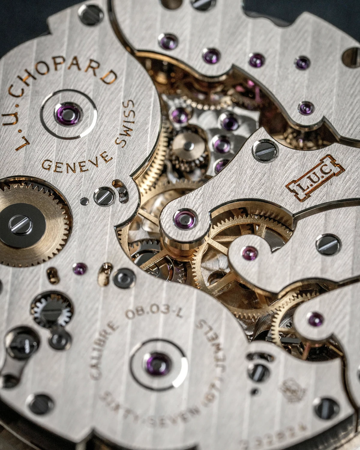 ● Calibre: L.U.C 08.03-L, hand-wound; 686 components; 67 jewels; 4 Hz; 70-hour power reserve for the timekeeping gear train; separate barrel for the striking mechanism (≥ 12 hours in grande sonnerie mode); stop-seconds function.