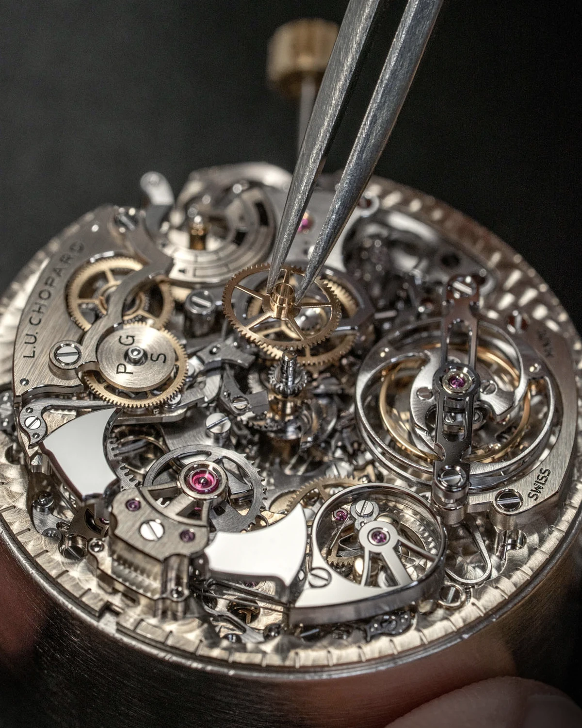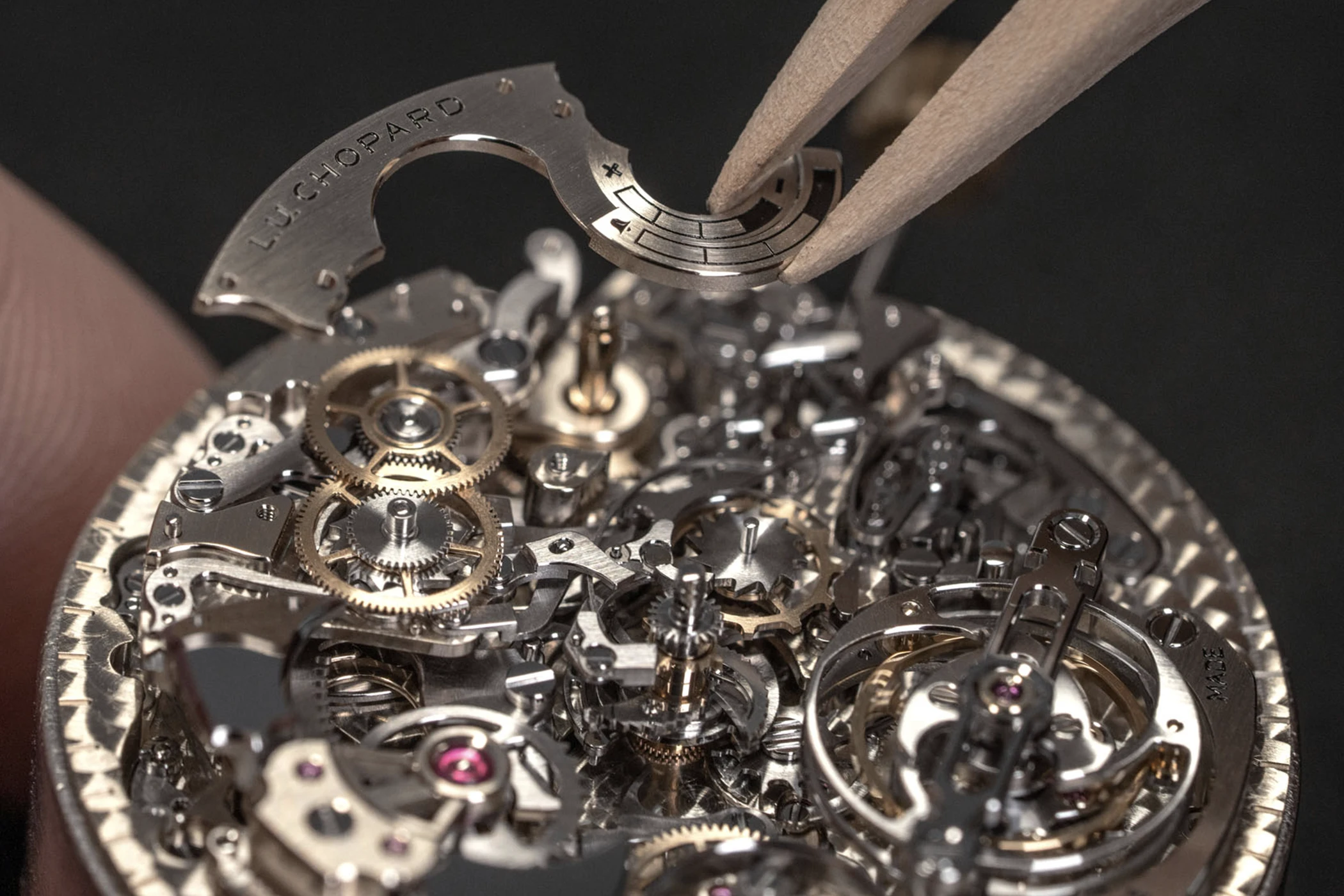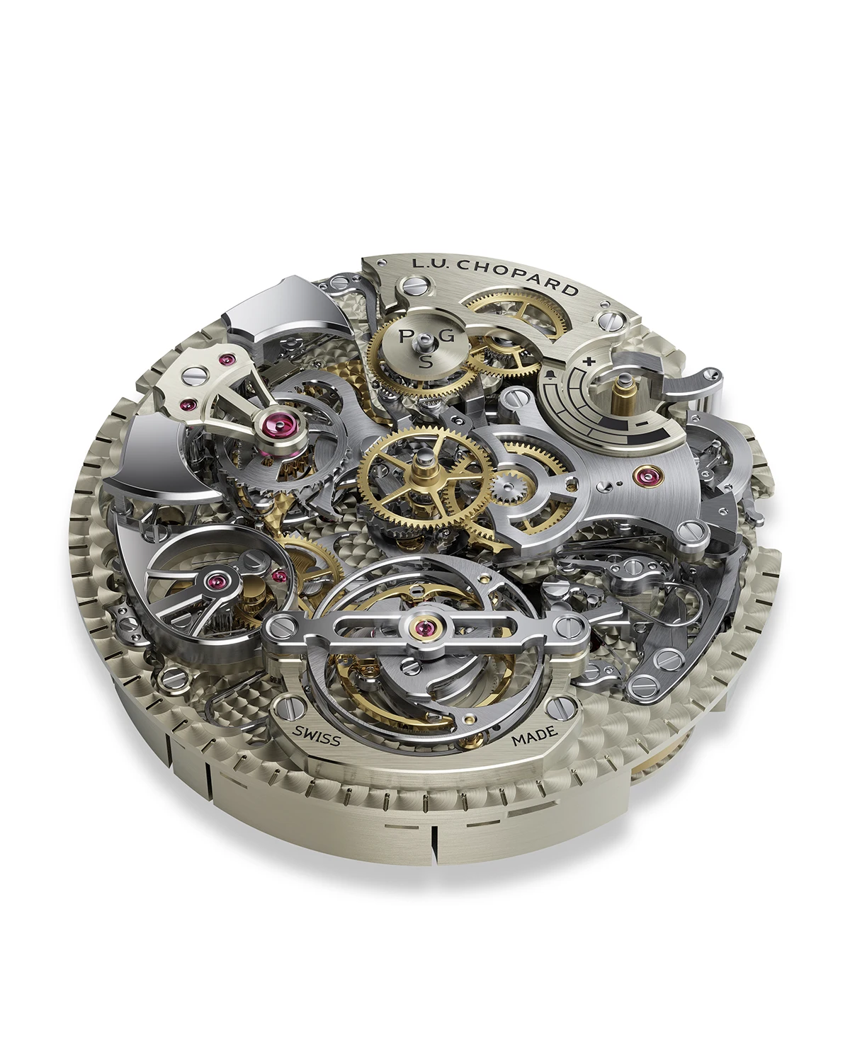Chopard’s distinctive monobloc sapphire system – in which the watch glass and the gongs are both cut from a single block of sapphire – has been a defining feature since the Full Strike and has earned the manufacture a dedicated following. The small metal hammers strike the sapphire gongs, producing a full, clear and pleasantly resonant sound that is carried directly forward through the crystal. As a result, the watch does not require an acoustic amplifying caseback or any other technical additions to prevent the sound from being absorbed by the wrist, or by the surroundings in a restaurant or elsewhere – wherever the few owners of such a watch may wish to hear it.