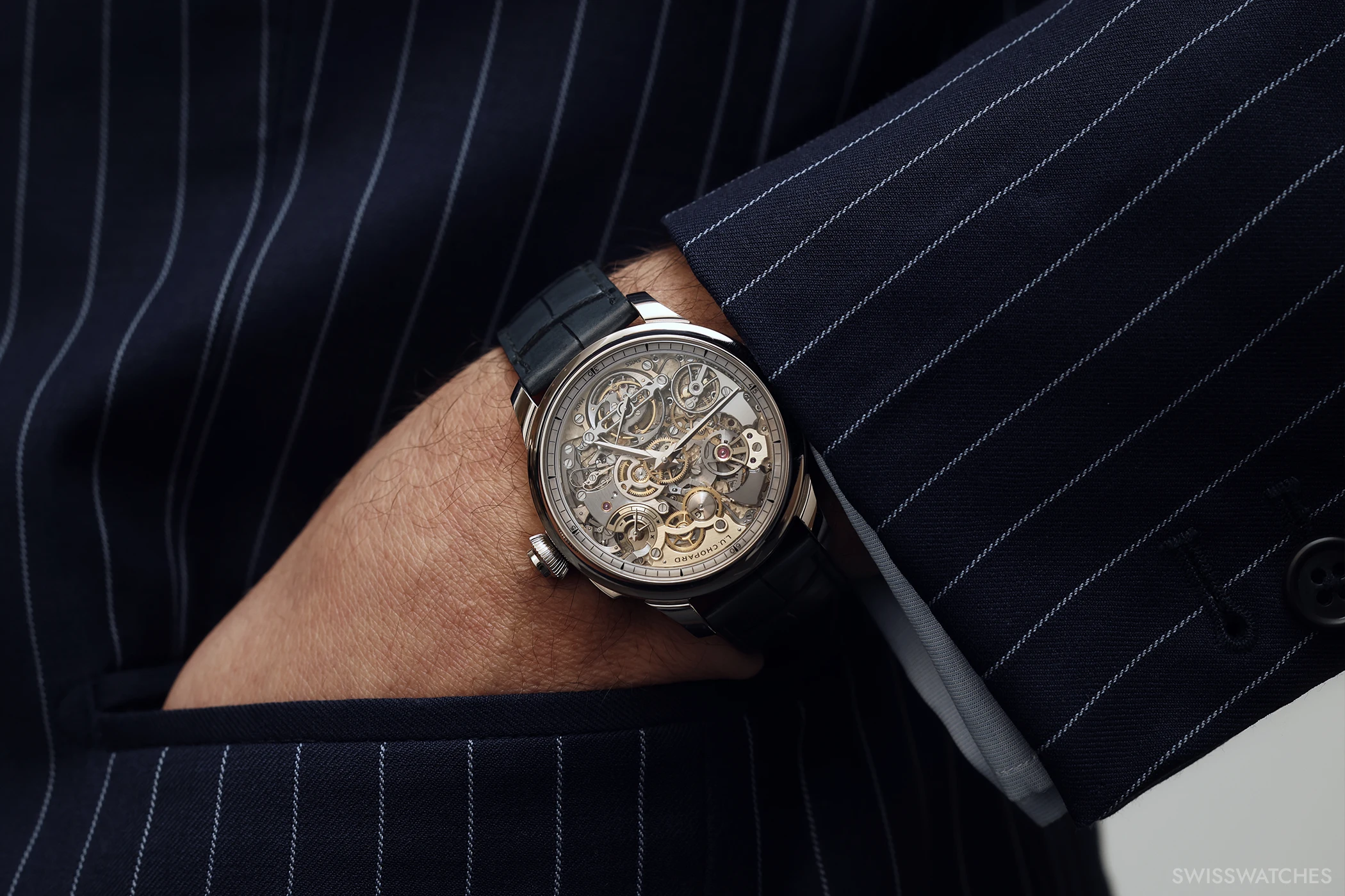 The open design reveals both hammers at 10 o’clock, the minute tourbillon with small seconds at 6 o’clock, and the twin power-reserve indicators for the timekeeping and striking mechanisms at 2 o’clock. The plates and bridges are made of German silver (maillechort), a sensitive material that increases the difficulty of assembly but develops a natural patina over time, much like many historical pocket watches.