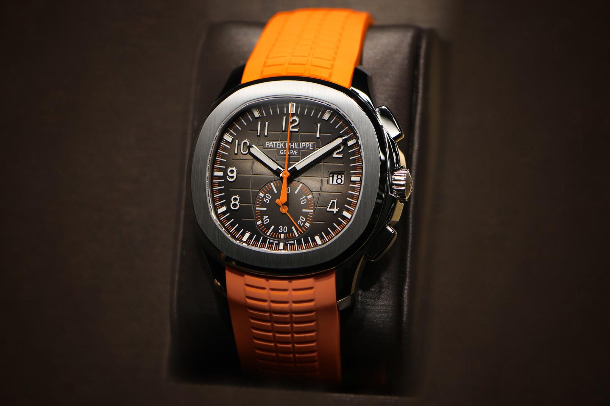 Well, I have the Patek Philippe Aquanaut Chronograph 5968A in stainless-steel with the orange strap. I wear that quite a lot, and I love the rubber on it. I only wear it on holiday actually, taking it swimming and into the ocean. It’s light and it feels sporty.
