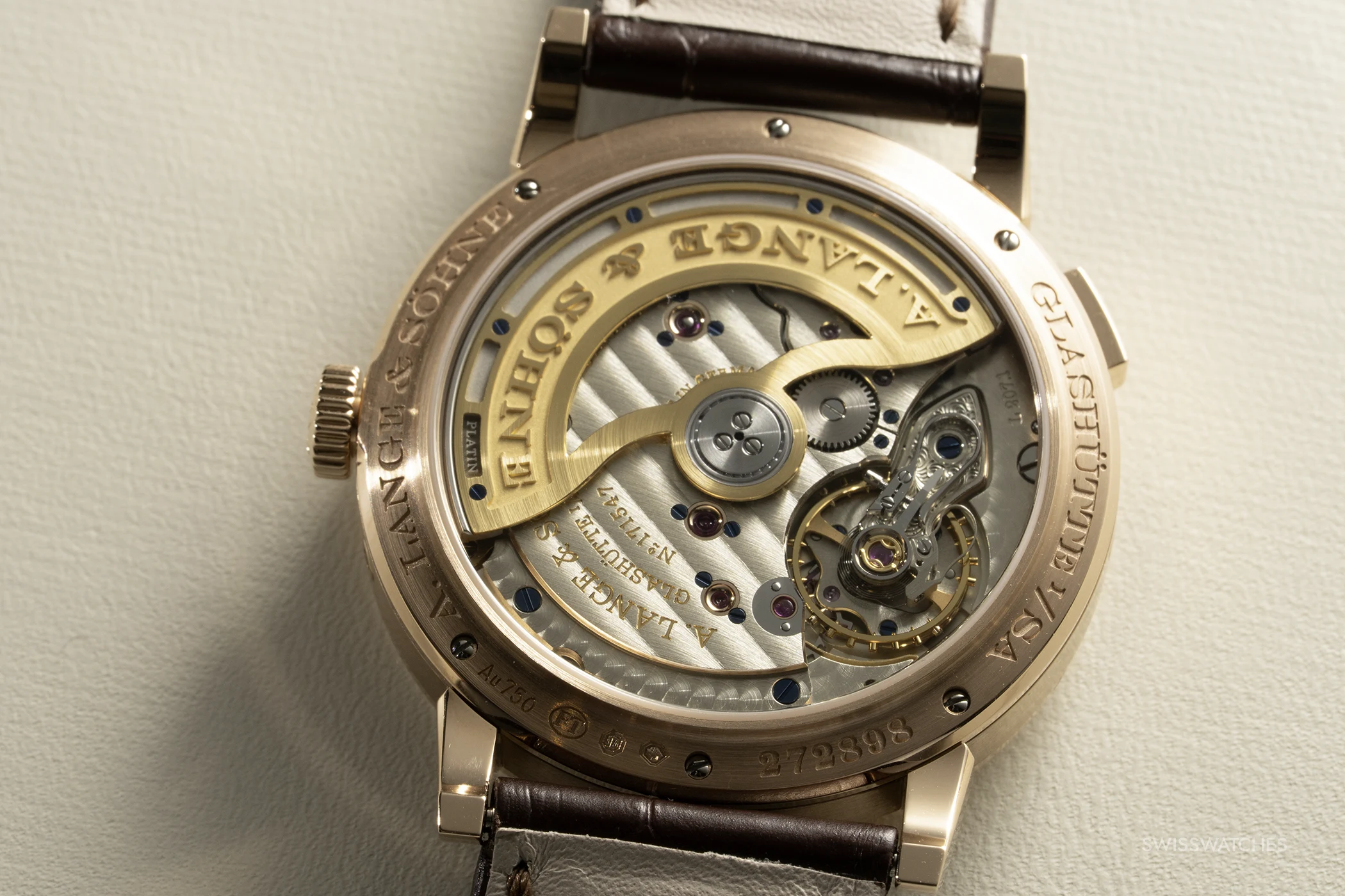 A. Lange & Söhne nutzt den Platinrotor nicht nur als automatischen Aufzug zur Erhöhung der Aufzugseffizienz, sondern auch Bildfläche für schöne handwerkliche Verzierungen. Die schwere Schwungmasse ist aufwendig skelettiert und trägt das Relief des A. Lange & Söhne-Schriftzugs.
