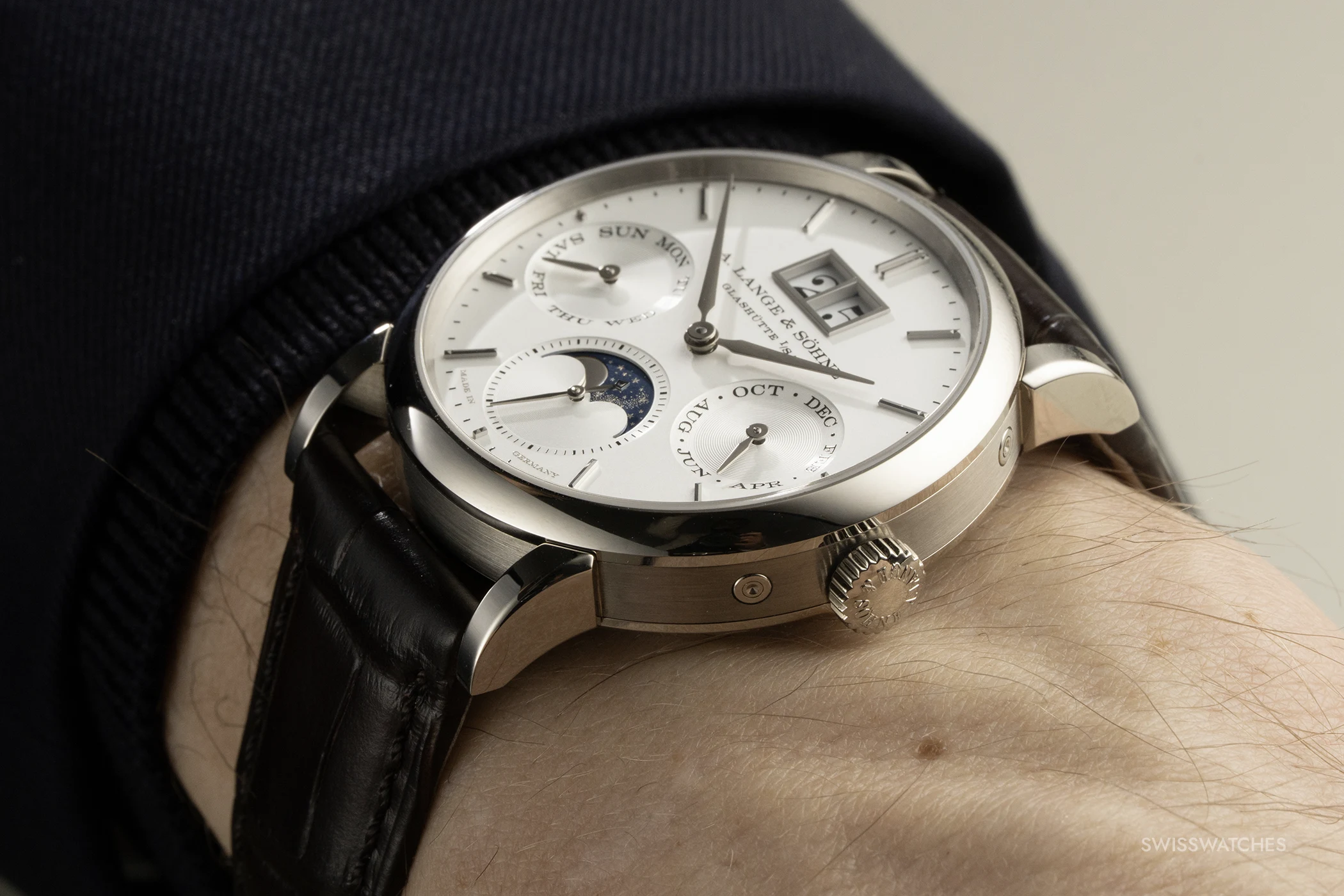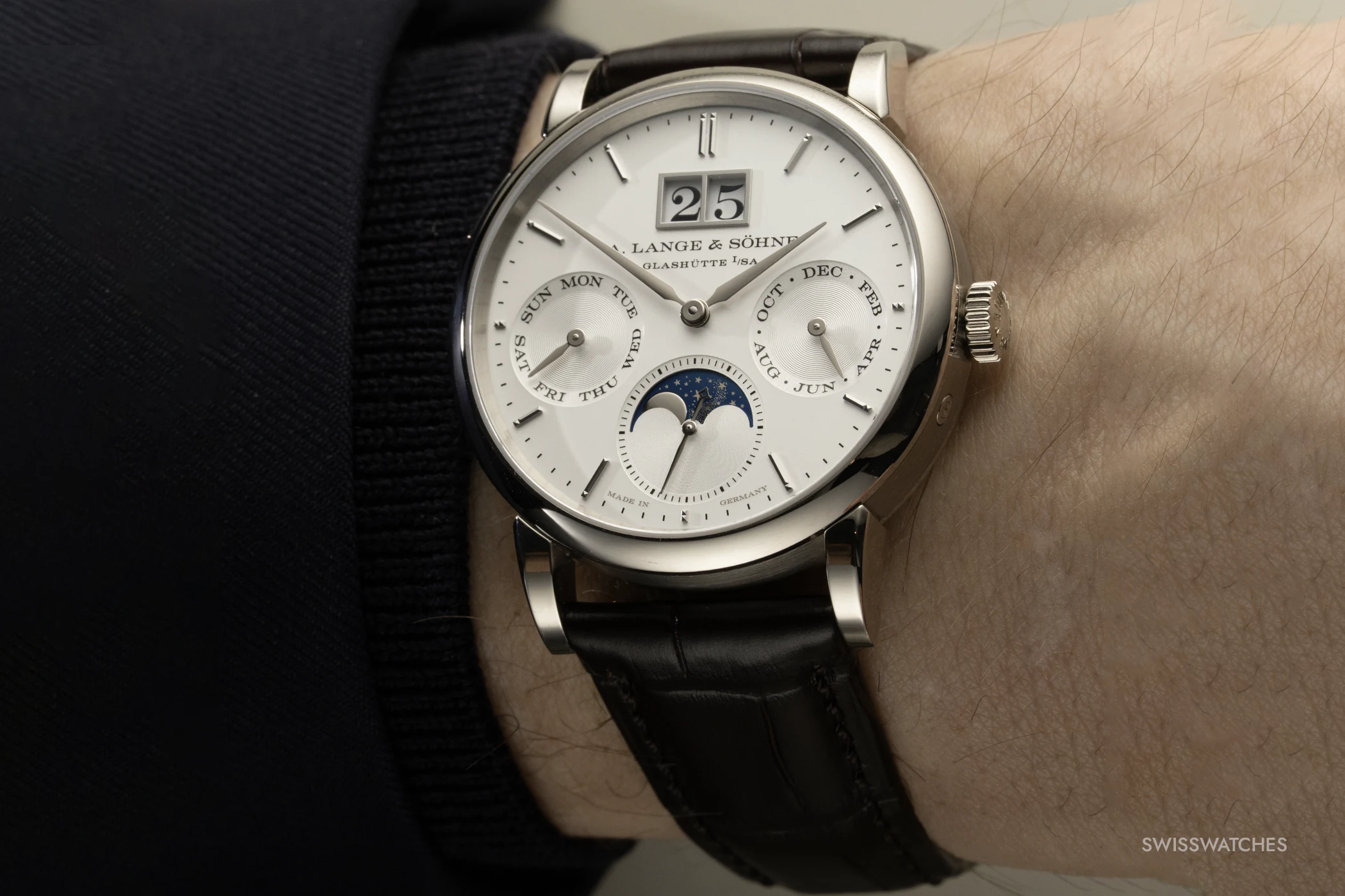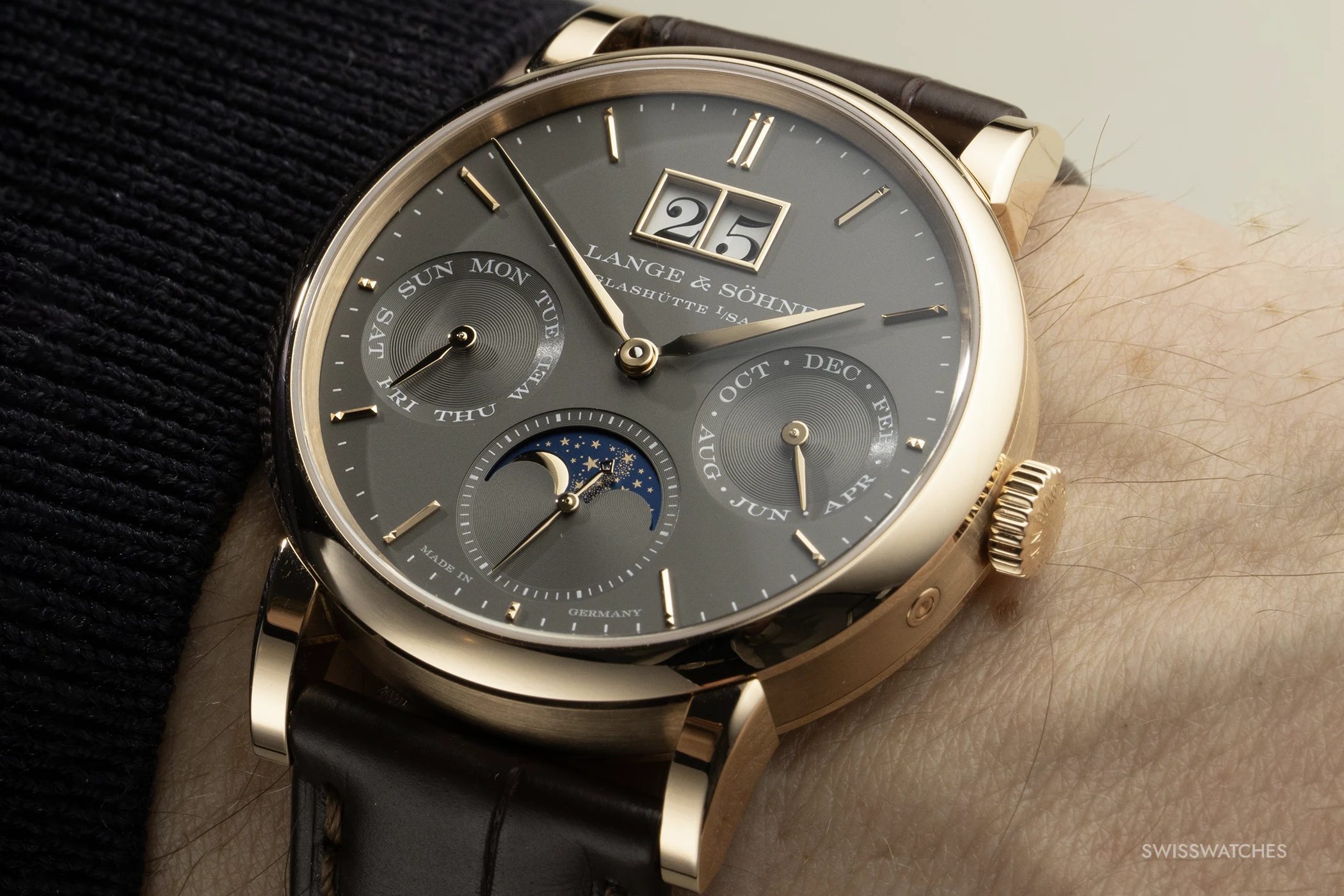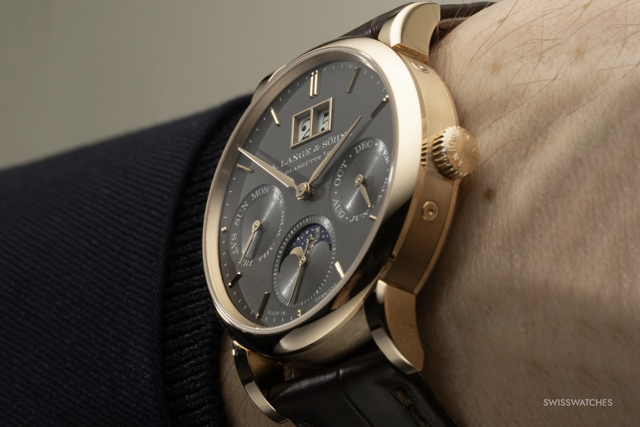 Die Hilfszifferblätter für den Wochentag (9 Uhr), den Monat (3 Uhr) und die kleine Sekunde (6 Uhr) sind leicht nach innen angeschrägt. Um eine plastische Tiefenwirkung zu erzielen, nutzt Lange unterschiedliche Stufen der Azurage – einer feinen, kreisförmigen Riffelung. Während die äußeren Ringe der Hilfszifferblätter eine sehr feine Azurage aufweisen, sind die Innenflächen mit einer markanteren Struktur versehen. Diese Differenzierung erzeugt Reflexionsflächen, die die Anzeigen optisch vom Hauptzifferblatt abheben. Eine Ausnahme bildet die kleine Sekunde bei 6 Uhr: Hier trägt auch das innere Segment die feinere Azurage, um einen ruhigen Hintergrund für die detailreiche Mondphasenanzeige zu bilden.