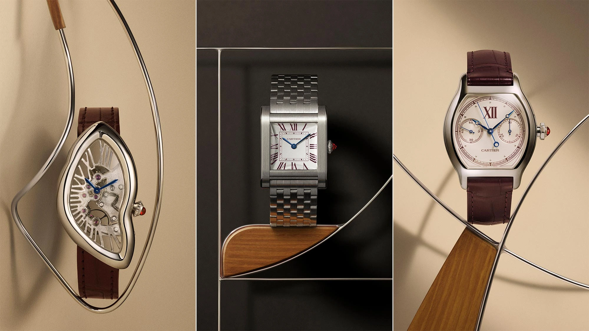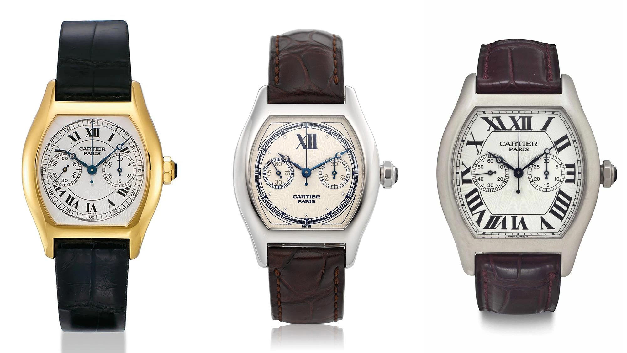 Auch wenn sich diese drei Zeitmesser in Form und Design kaum stärker voneinander unterscheiden könnten, haben sie doch einen gemeinsamen Nenner: Platin. Und Platin, das Cartier seit jeher für seine edelsten Stücke bevorzugt, genießt in Sammlerkreisen oft hohes Ansehen – nicht nur wegen seiner Langlebigkeit, sondern auch, weil es als Inbegriff von Luxus und Prestige gilt. Kühler als Weißgold, seltener und in seinem Luxus unendlich viel dezenter – es ist die ultimative Materialwahl für Kenner: die perfekte Wahl für den typischen Cartier-Sammler. Schließlich liegt die Schönheit eines Cartier-Uhrendesigns meist in seiner zurückhaltenden Optik.