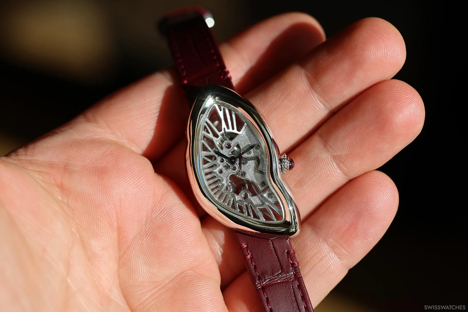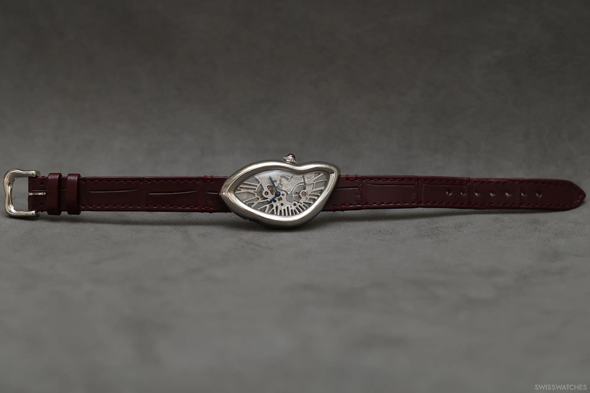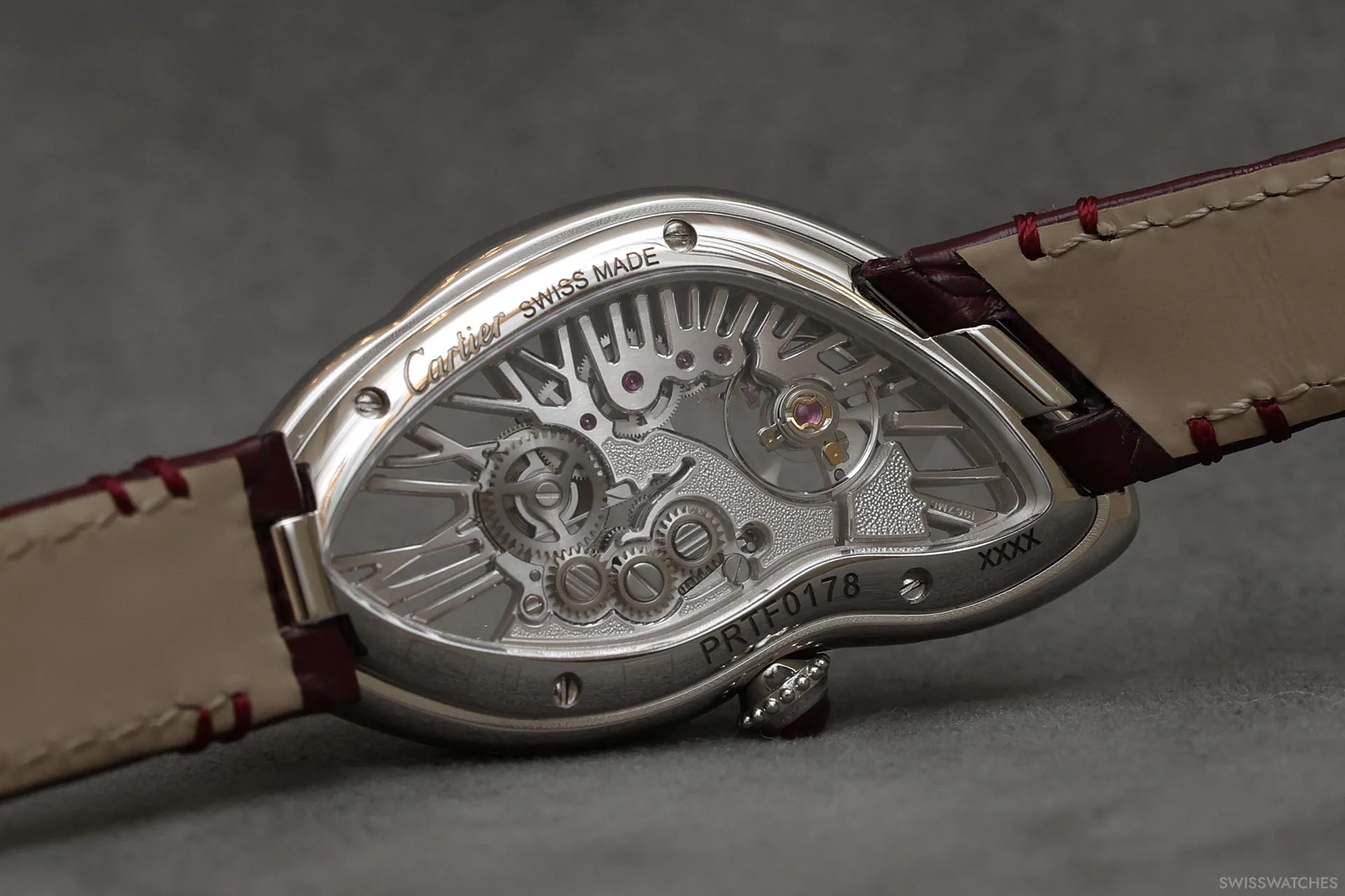 Als Neuinterpretation des Modells „Collection Privée Cartier Paris“ aus dem Jahr 1998 ist die Uhr mit einem halbmatten burgunderroten Alligatorlederarmband ausgestattet, das bei bestimmten Lichtverhältnissen fast braun wirkt und mit farblich abgestimmten Nähten sowie einer Ardillon-Schließe aus Platin versehen ist. Mit Abmessungen von 43,7 × 34,8 mm bleibt sie den Proportionen ihres Vorgängers aus den späten 1990er Jahren treu und greift gleichzeitig zahlreiche seiner charakteristischen Designmerkmale auf.