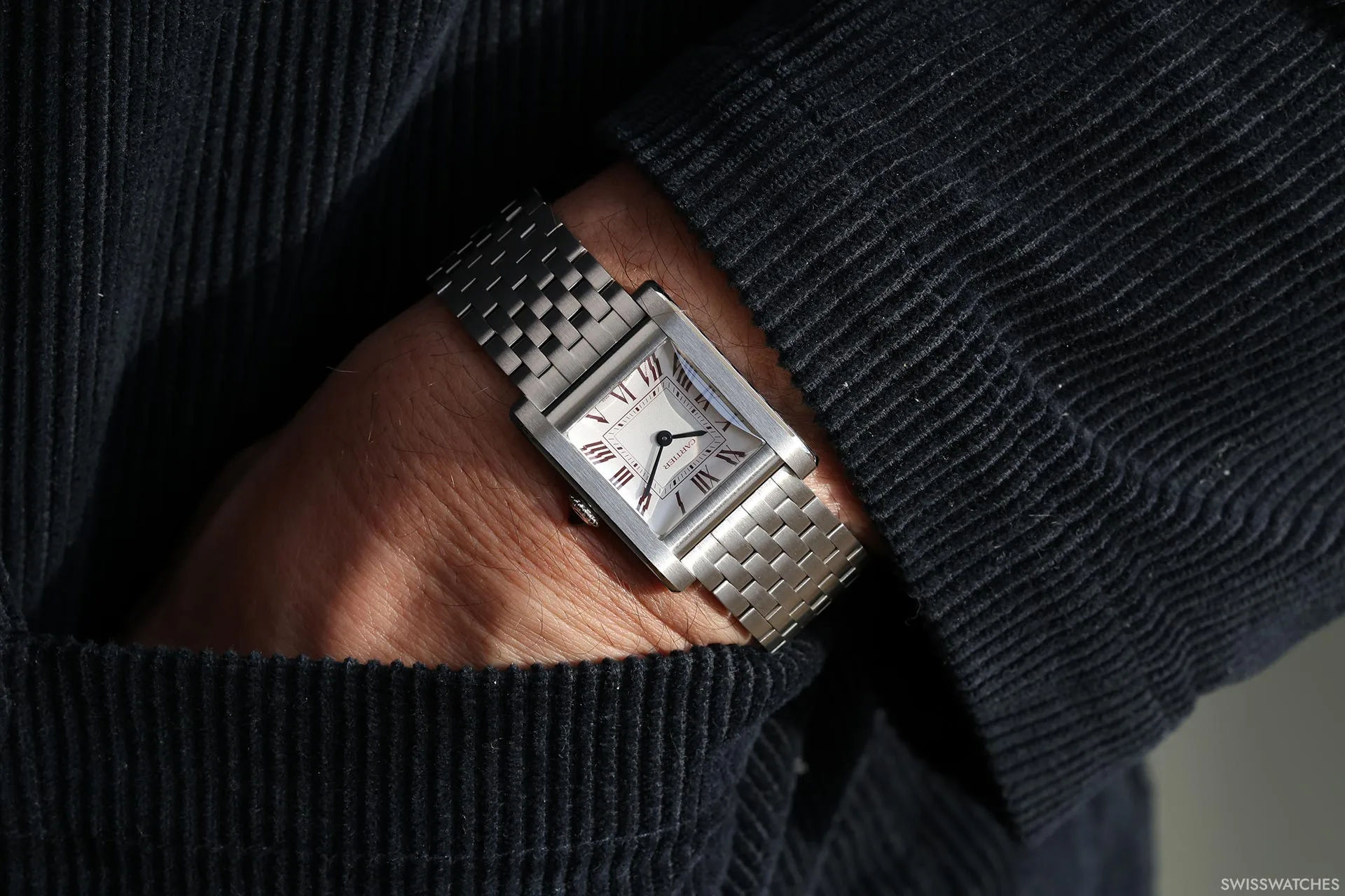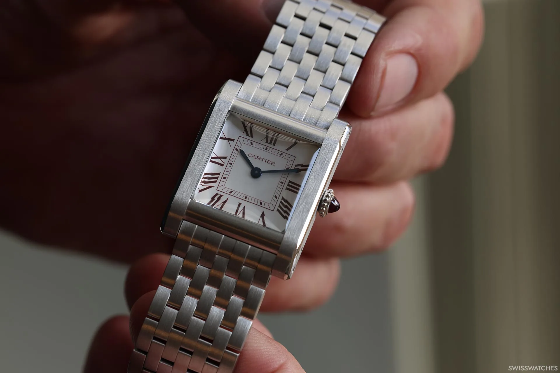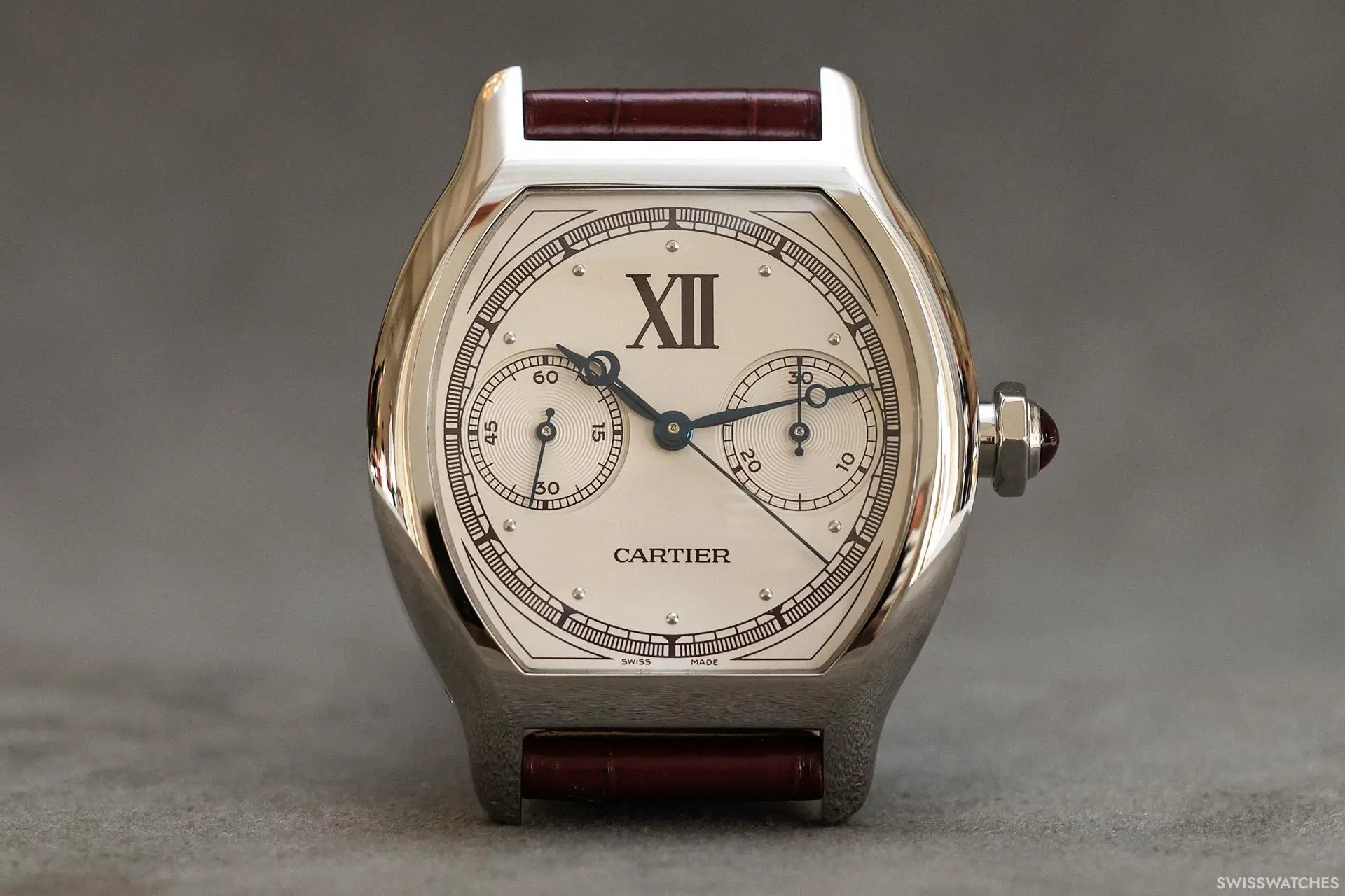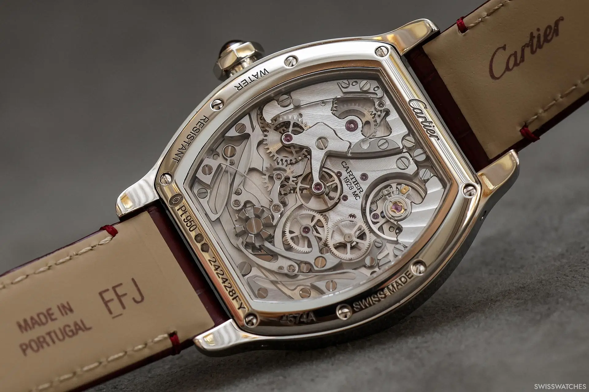 Als Neuinterpretation des Modells „Collection Privée Cartier Paris“ aus dem Jahr 1998 ist die Uhr mit einem halbmatten burgunderroten Alligatorlederarmband ausgestattet, das bei bestimmten Lichtverhältnissen fast braun wirkt und mit farblich abgestimmten Nähten sowie einer Ardillon-Schließe aus Platin versehen ist. Mit Abmessungen von 43,7 × 34,8 mm bleibt sie den Proportionen ihres Vorgängers aus den späten 1990er Jahren treu und greift gleichzeitig zahlreiche seiner charakteristischen Designmerkmale auf.