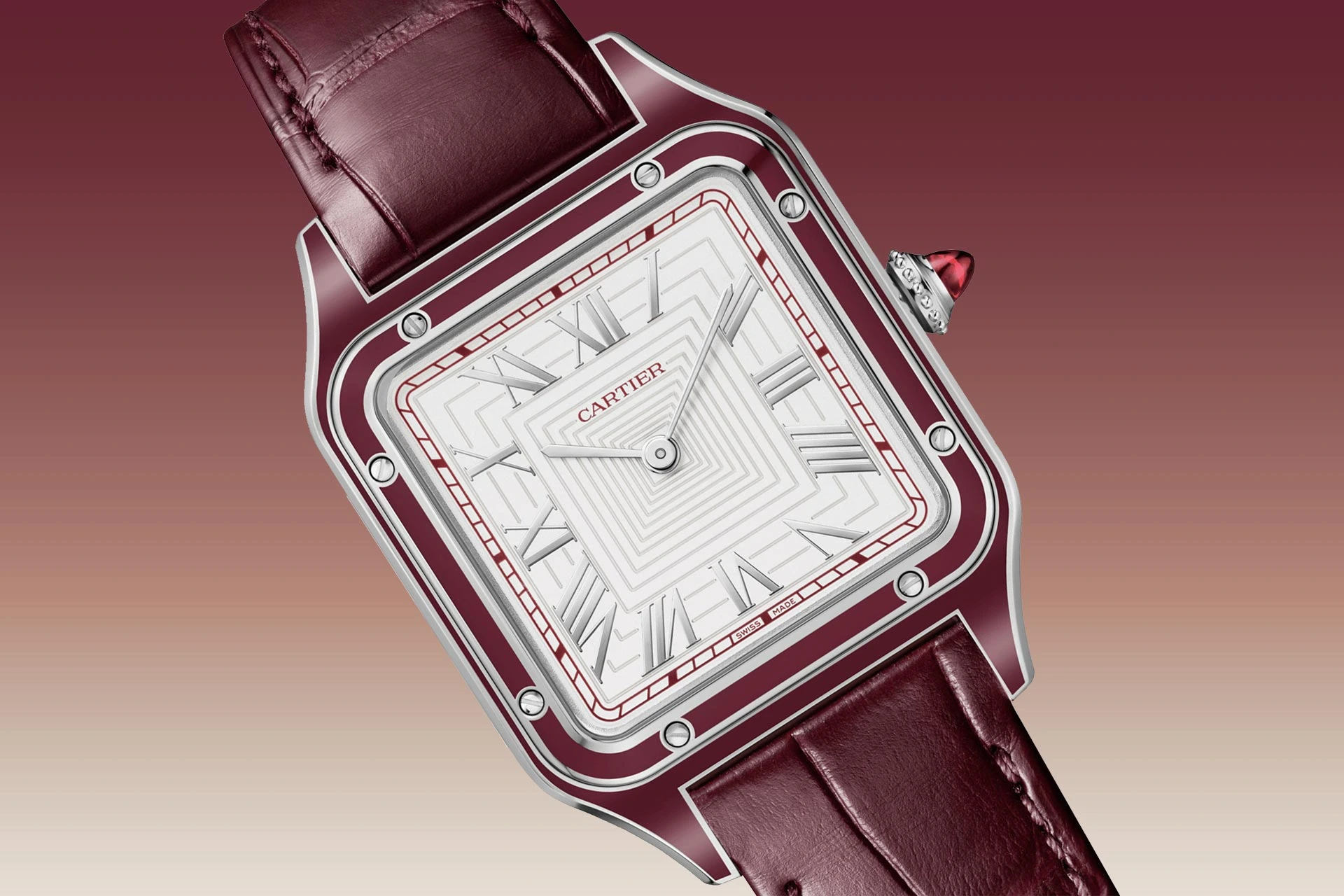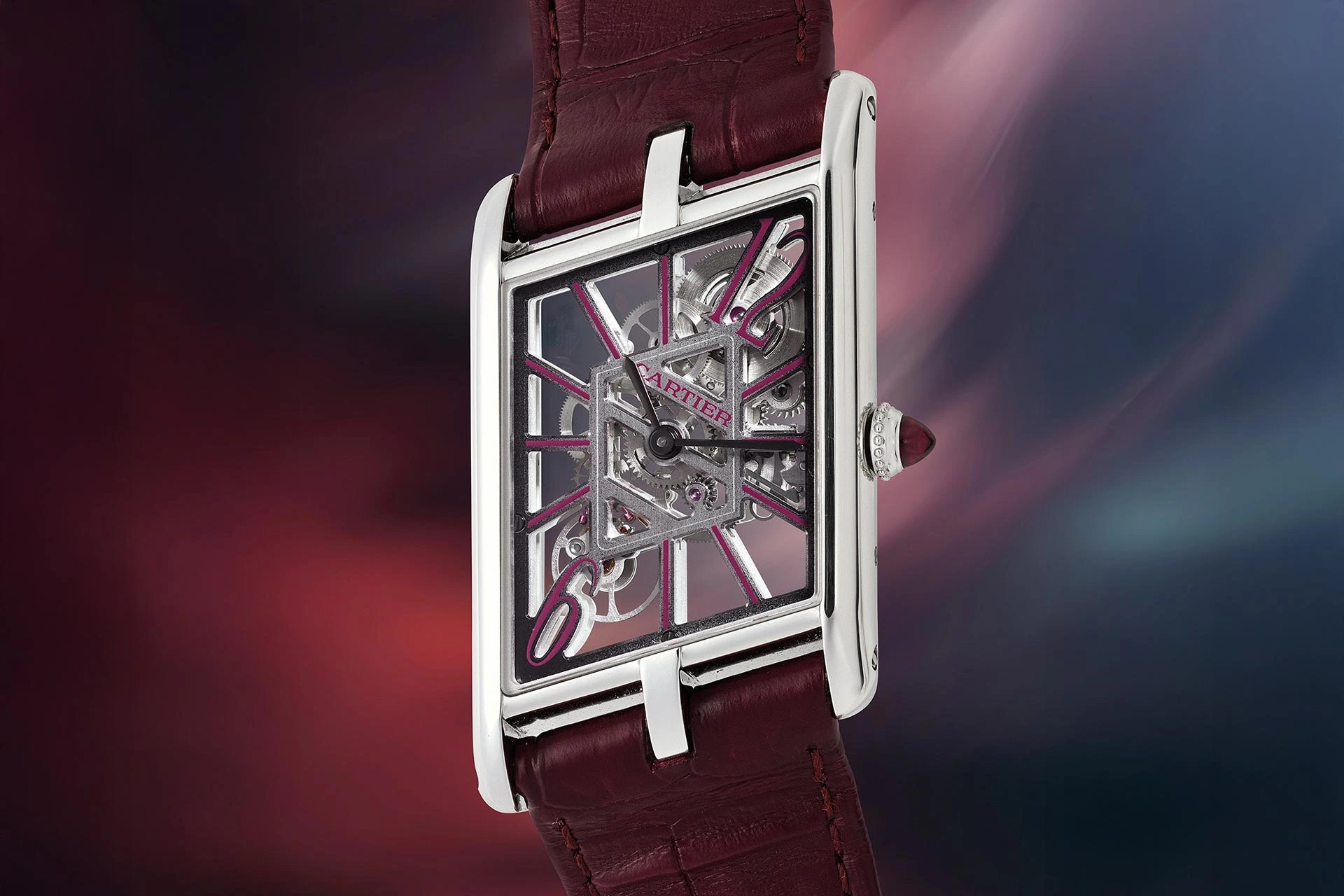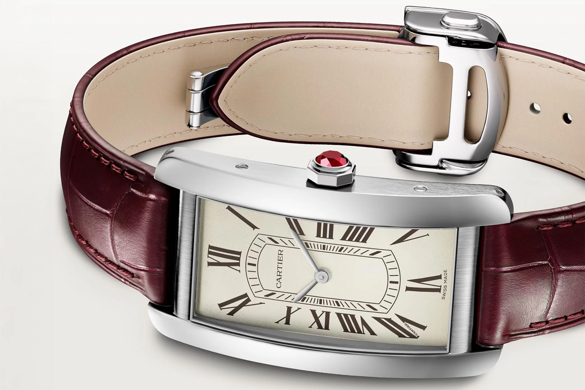 Wie erkennt der Laie, ob eine Cartier-Uhr aus Platin oder Weißgold gefertigt ist? Nur Cartier-Kenner wissen, dass der Hinweis im Rubin-Cabochon in der Krone liegt, der den für alle anderen Cartier-Uhren typischen blauen Cabochon ersetzt. Neben den burgunderrot bedruckten Zifferblättern sind die neuen „Privé“-Uhren der Kollektion 2026 mit Lederarmbändern in einem passenden tiefen Weinrot ausgestattet.