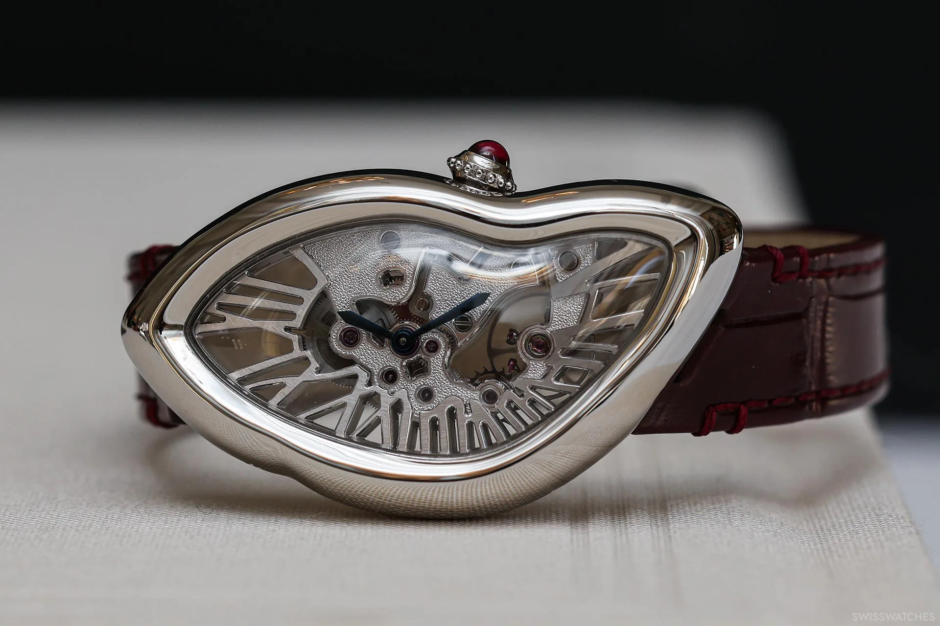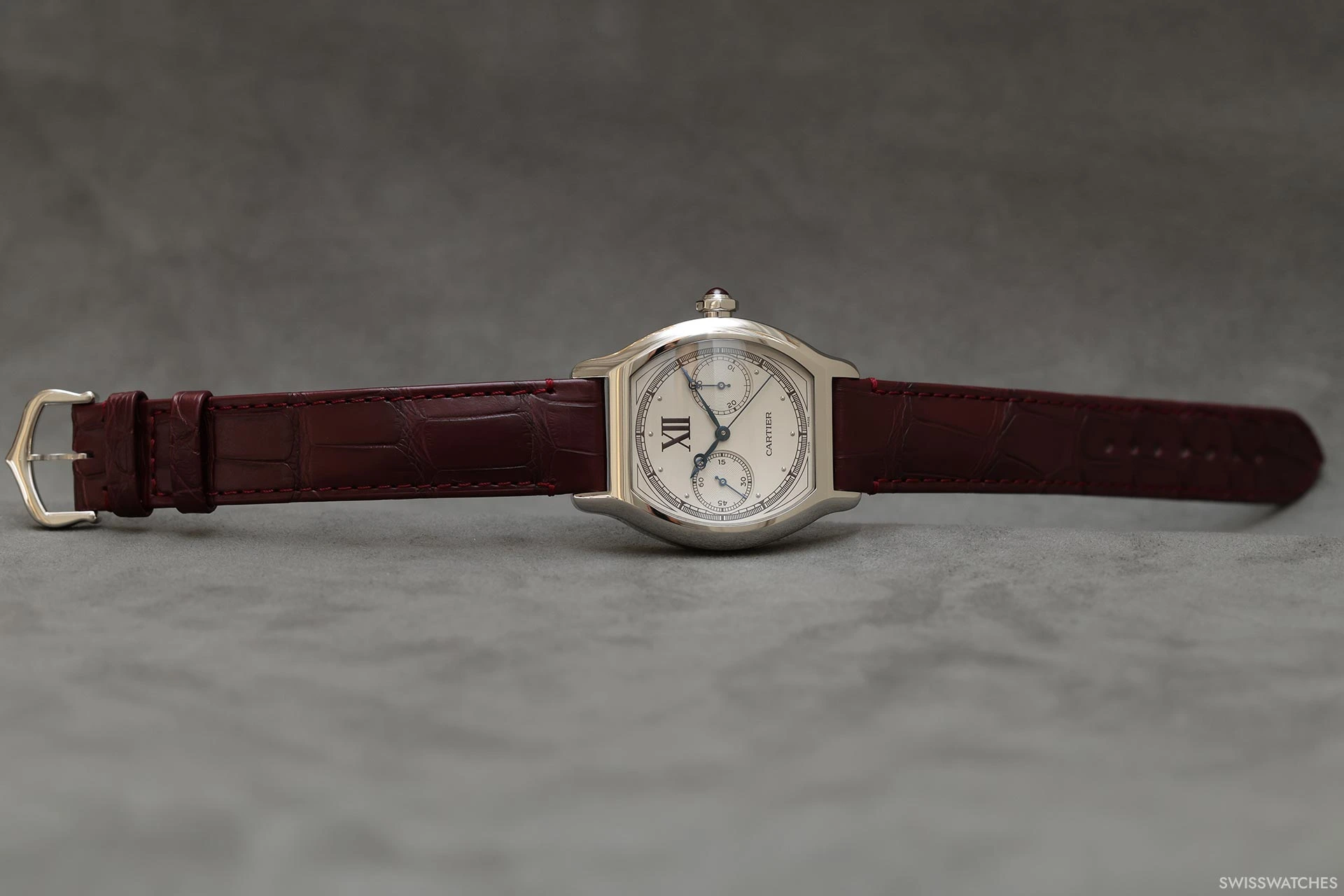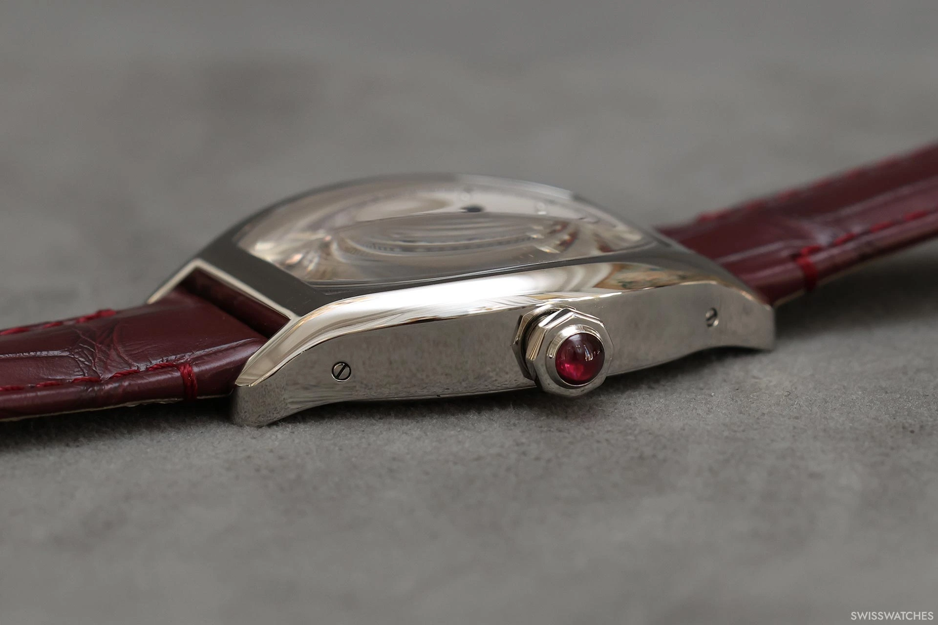 Wie erkennt der Laie, ob eine Cartier-Uhr aus Platin oder Weißgold gefertigt ist? Nur Cartier-Kenner wissen, dass der Hinweis im Rubin-Cabochon in der Krone liegt, der den für alle anderen Cartier-Uhren typischen blauen Cabochon ersetzt. Neben den burgunderrot bedruckten Zifferblättern sind die neuen „Privé“-Uhren der Kollektion 2026 mit Lederarmbändern in einem passenden tiefen Weinrot ausgestattet.