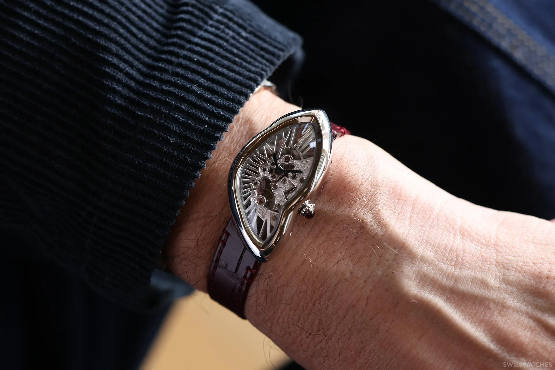 Die Crash Squelette führt diese Tradition noch einen entscheidenden Schritt weiter. Ihr neu entwickeltes Manufakturwerk wurde so konstruiert, dass es sich der verzerrten Geometrie des Gehäuses perfekt anpasst, wobei alle 142 Bauteile in die unregelmäßige Silhouette eingefügt wurden. Die Brücken, die in Form römischer Ziffern gestaltet sind, wirken beinahe so, als würden sie zur Krone hin gezogen – ganz so, als wäre die Uhr selbst geschmolzen.
