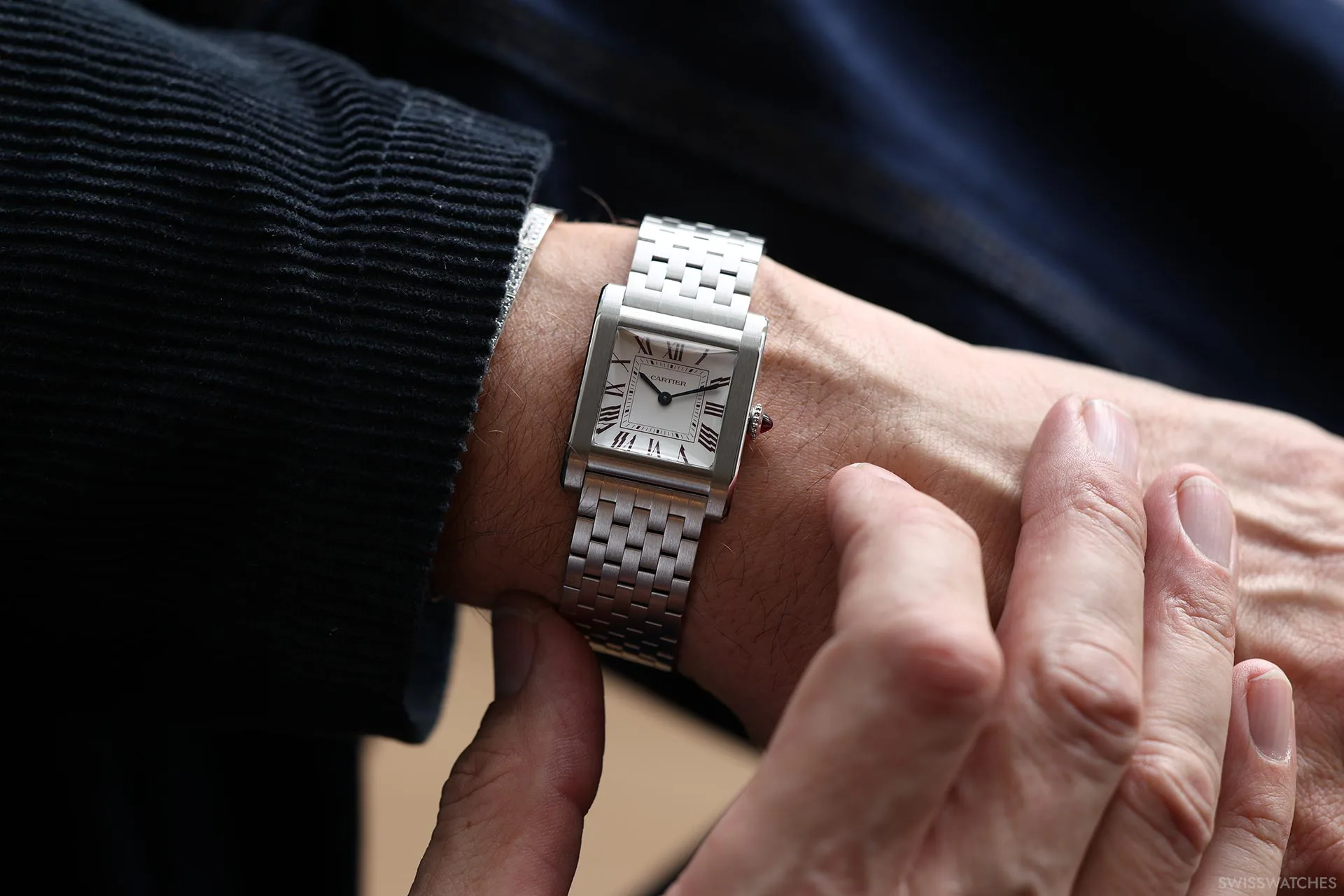 Wer mit Cartiers jüngsten Veröffentlichungen vertraut ist, wird diese Konfiguration zweifellos wiedererkennen. Das scheinbar identische Gehäuse sowie das siebengliedrige Armband wurden bereits als Teil der Privé-Kollektion auf der Watches & Wonders 2023 vorgestellt; die Proportionen bleiben mit 32,6 × 25,7 mm unverändert. Vielmehr unterstreicht diese Kontinuität den Gedanken, dass die Tank Normale natürlich keine Uhr ist, die neu erfunden werden muss, sondern vielmehr in behutsamen Schritten verfeinert wird.