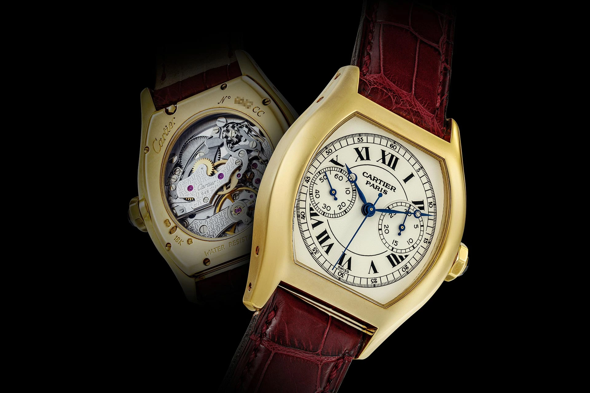 Dazu gehörte die Unterstützung von Renaud & Papi, die an der Wiederbelebung von Tourbillons und Minutenrepetitionen arbeiteten, sowie von den „Techniques Horlogères Appliquées“ unter der Leitung der unabhängigen Uhrmachermeister François-Paul Journe – ja, genau, der geschätzte F.P. Journe höchstpersönlich –, Vianney Halter und Denis Flageollet. Mit der Unterstützung dieser Einrichtung entstanden ab 1999 mehrere Varianten als Teil der Collection Privée Cartier Paris. Diese Uhren zeichneten sich durch ein größeres Gehäuse mit den Maßen 34 mm × 43 mm sowie einen offenen Gehäuseboden aus. Angetrieben wurden die Modelle vom Kaliber 045MC von Techniques Horlogères Appliquées. Dieses Kaliber verwendet ein selten anzutreffendes Kupplungssystem – das Schwingritzel – anstelle der horizontalen Kupplung, die typischerweise in vielen Vintage-Chronographen mit Handaufzug zu finden ist. Es ist natürlich auch als Monopusher konfiguriert, wobei alle Funktionen über einen einzigen, in die Krone integrierten Drücker gesteuert werden, im Gegensatz zur konventionelleren Anordnung bei 2 Uhr.