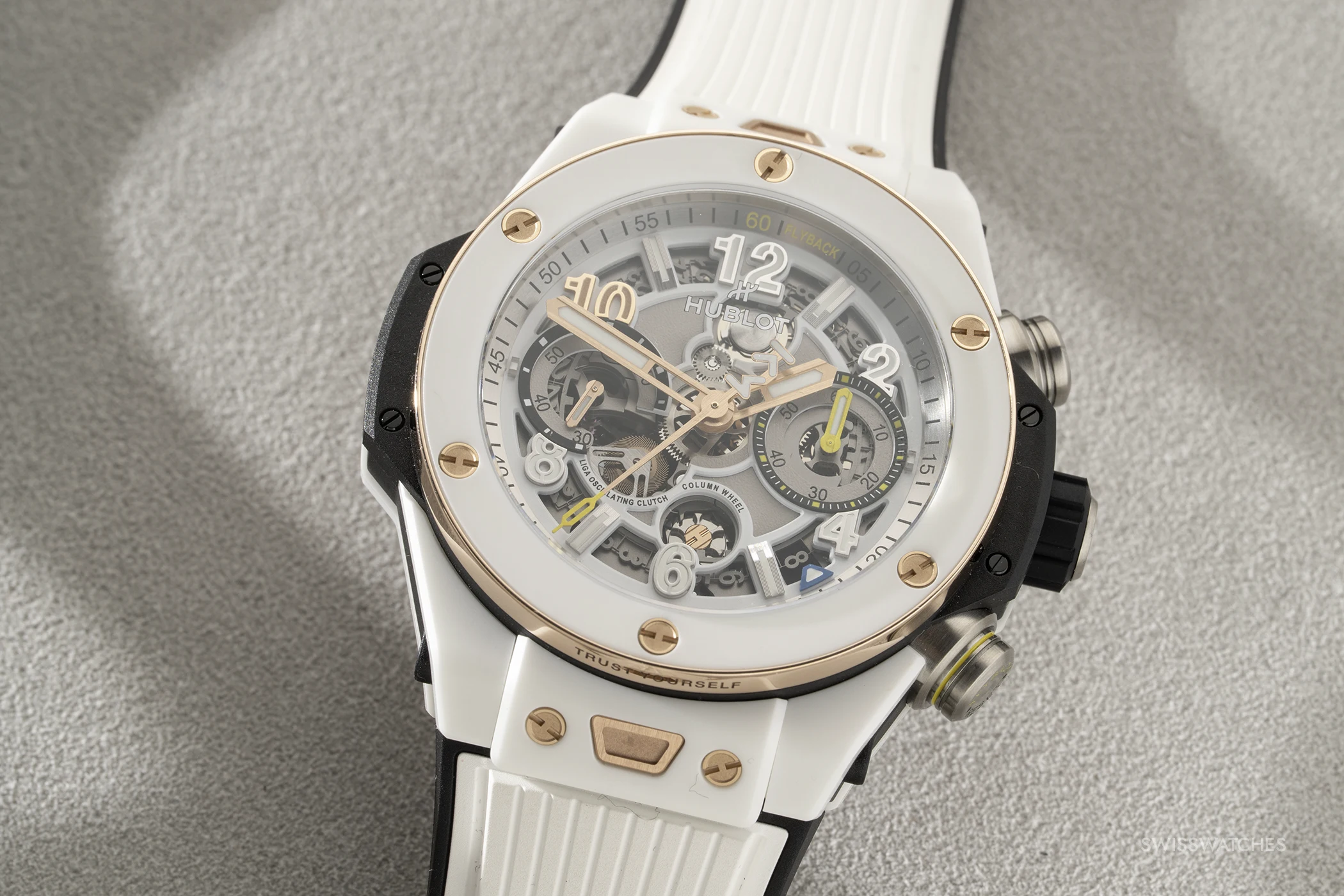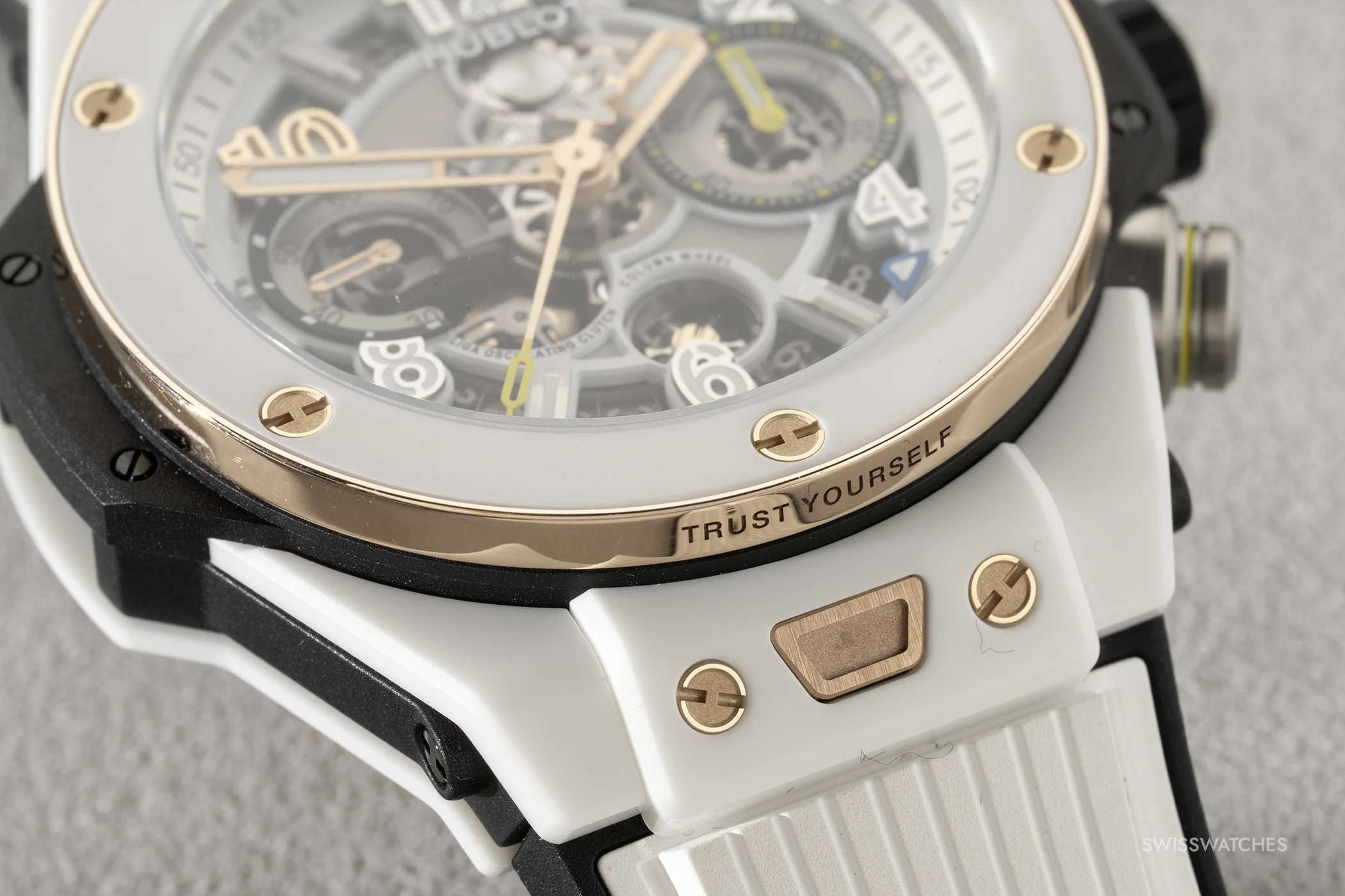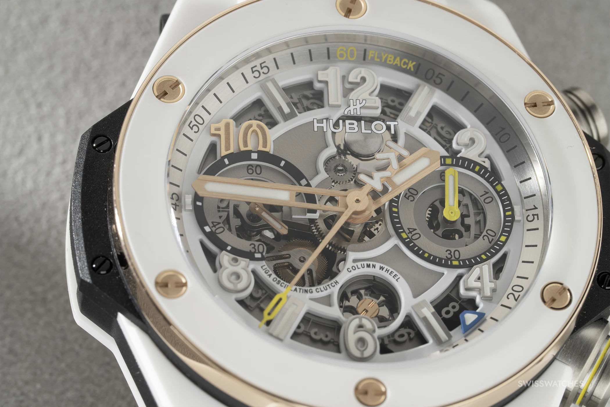 Die Big Bang Reloaded Kylian Mbappé verfolgt einen ganz anderen Ansatz. Auch sie hat einen Durchmesser von 44 Millimetern, doch die Materialauswahl – polierte weiße Keramik und 18-karätiges King Gold – vermittelt einen völlig anderen Eindruck: Die Uhr wirkt heller, markanter und moderner. Während das Bolt-Modell eine Geschichte von Tradition und Rekorden erzählt, konzentriert sich das Mbappé-Modell auf den mentalen Aspekt. Dementsprechend trägt die Lünette bei 6 Uhr die Gravur „Trust Yourself“ – die Maxime, die Hublot als Kern seiner sportlichen und öffentlichen Identität präsentiert. Hinzu kommt die goldfarbene Zahl 10, die gleichzeitig auf seine Rückennummer, seine Identität und seine Glückszahl verweist. Das skelettierte Zifferblatt aus anthrazitfarbenem Ruthenium mit weißen Akzenten verleiht der Uhr einen klaren, technischen Look.