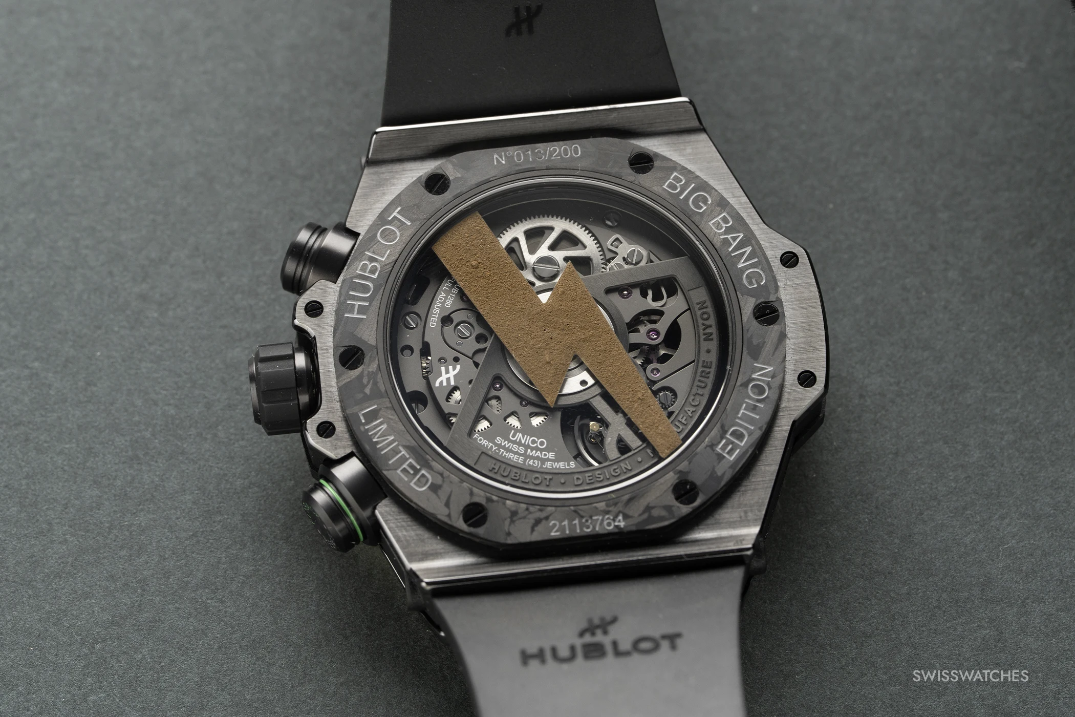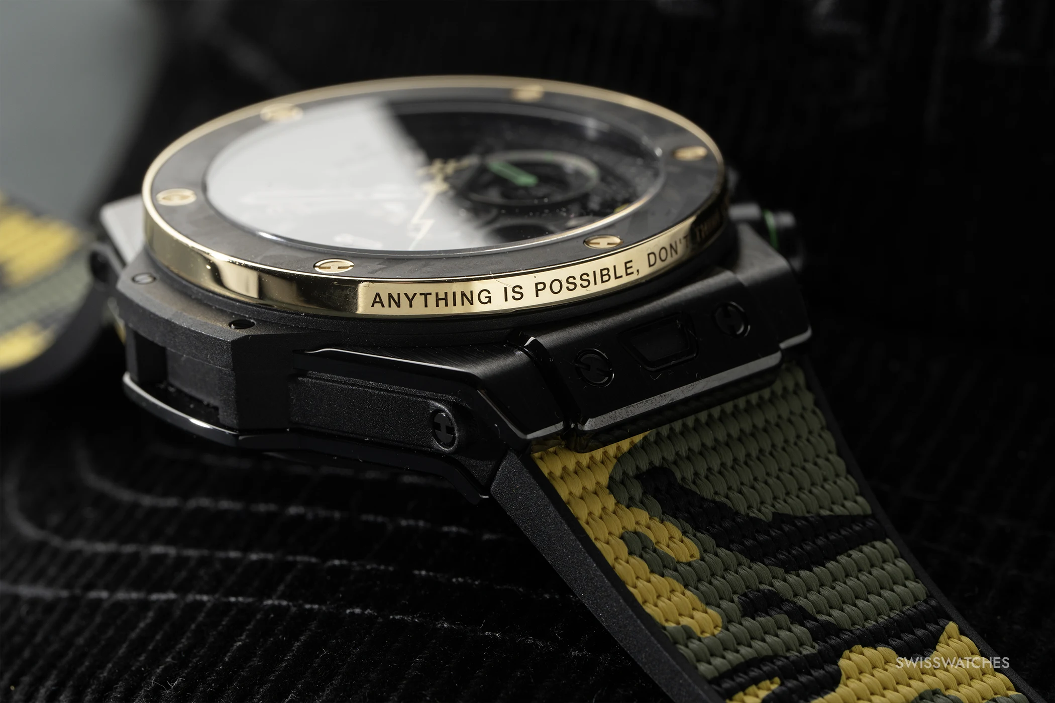 Die Big Bang Reloaded Usain Bolt ist ganz auf die Symbolik des schnellsten Mannes der Welt zugeschnitten: Das 44-Millimeter-Gehäuse aus schwarzer Keramik und Carbon wird durch Akzente aus Gelbgold hervorgehoben, während grüne und gelbe Details bewusst auf die Farben der jamaikanischen Flagge verweisen. Die Big Bang Reloaded wird besonders interessant, wenn Hublot die Personalisierung bis ins kleinste Detail treibt: Dreht man die Uhr gedanklich, bilden die Ziffern zwischen 6 und 8 Uhr eine „958“ – ein direkter Verweis auf Bolts Weltrekordzeit von 9,58 Sekunden über 100 Meter aus dem Jahr 2009. Passend zu diesem Thema ist der Chronographenzeiger wie ein Blitz geformt, und auf dem Gehäuseboden ist sogar originale Erde von seinem Trainingsplatz in Jamaika sichtbar integriert. Hinzu kommt die Gravur seines Mottos „Anything is Possible, Don’t Think Limits“ auf der Lünette.