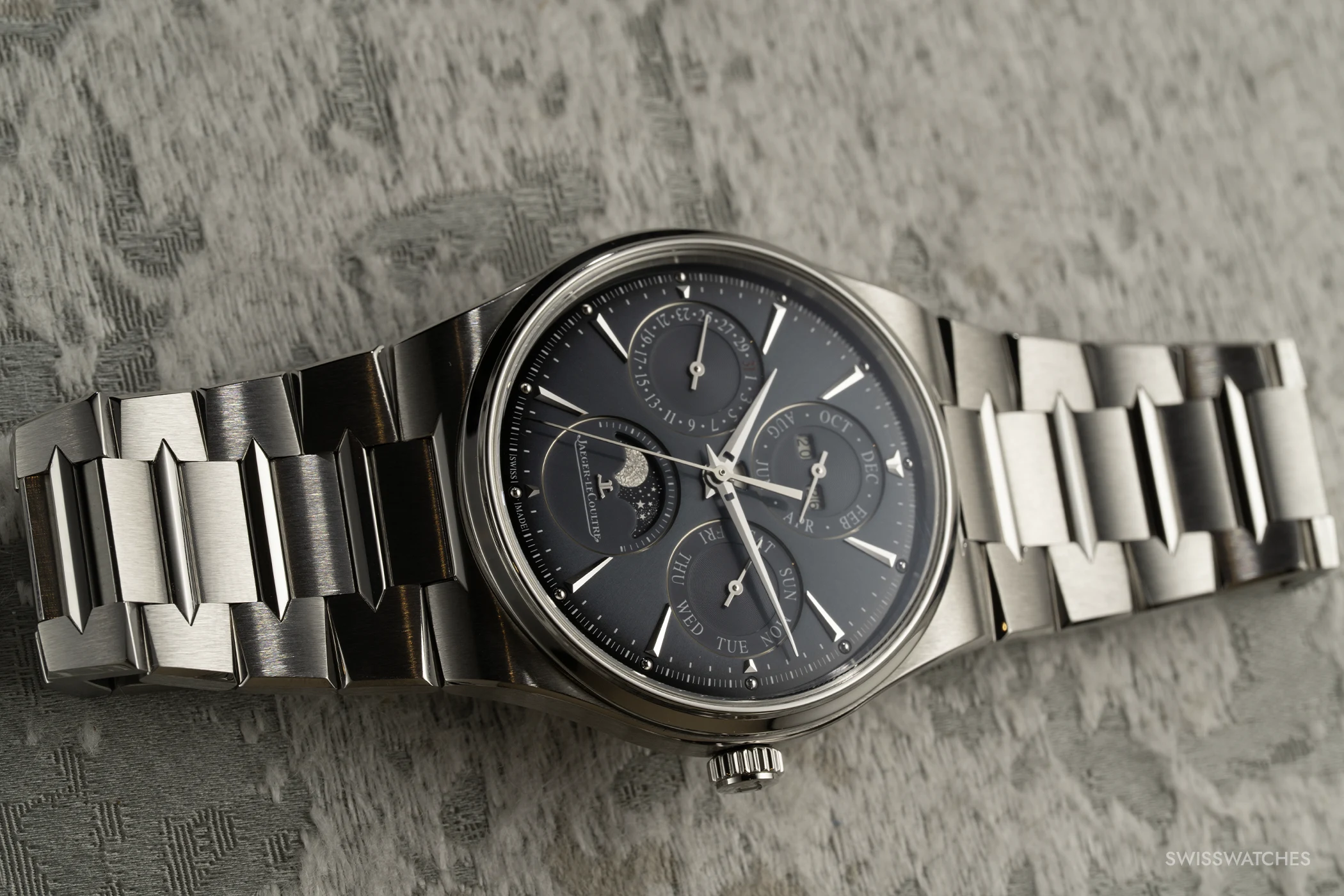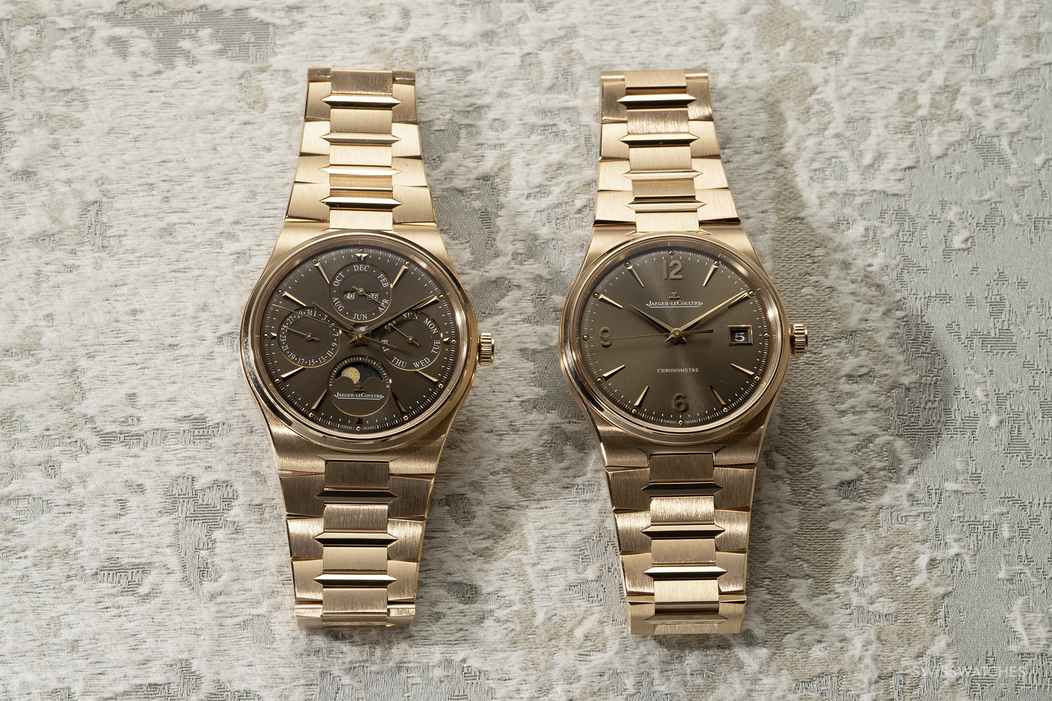 Die Master Control Chronometre Perpetual Calendar ist dagegen sowohl in Edelstahl als auch in 18 Karat Roségold erhältlich. Das 39-Millimeter-Gehäuse ist 9,2 Millimeter hoch und beherbergt ein Zifferblatt mit vier Totalisatoren für den vollständigen Kalender. Zur Wahl stehen ein blau-grauer Farbverlauf oder ein warmer Bronzeton. Die Hilfszifferblätter kombinieren opaline Außenringe mit azurierten Zentren. Die Mondphase selbst ist in gehämmertem 24-Karat-Gold ausgeführt. Getragen wird die Uhr an dem neuen integrierten Armband aus Stahl oder Roségold.
