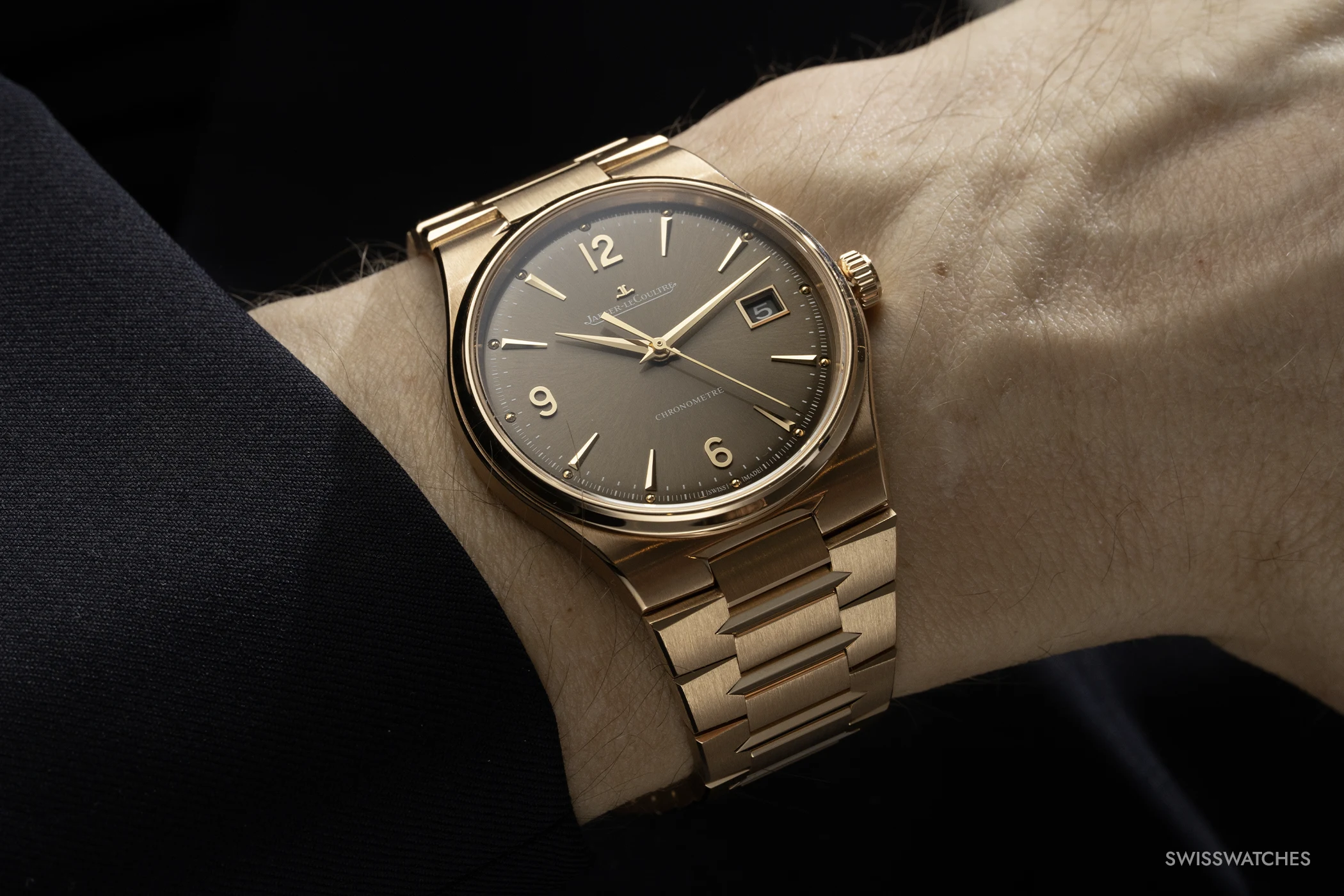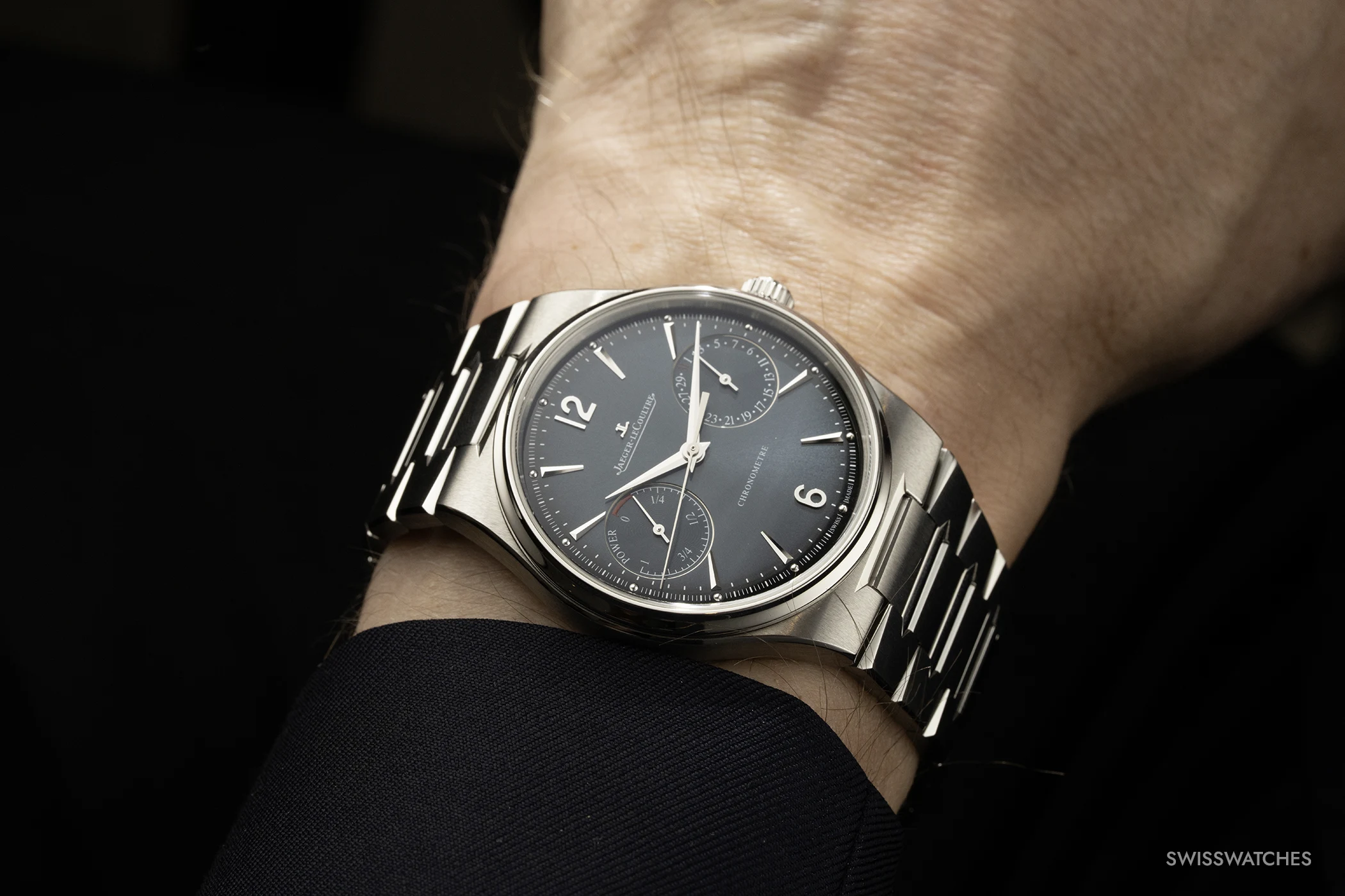 Die Master Control Chronometre Date schließlich wird in einem 38-Millimeter-Gehäuse mit nur 7,9 Millimetern Höhe angeboten und eignet sich damit für viele Handgelenkgrößen. Sie ist in Edelstahl oder Roségold erhältlich, besitzt ein blau-graues oder bronzefarbenes Zifferblatt mit Sonnenschliff und eine schlichte Datumsanzeige. Wie die beiden anderen Modelle verfügt auch sie über ein integriertes Armband und eine Gangreserve von 70 Stunden.