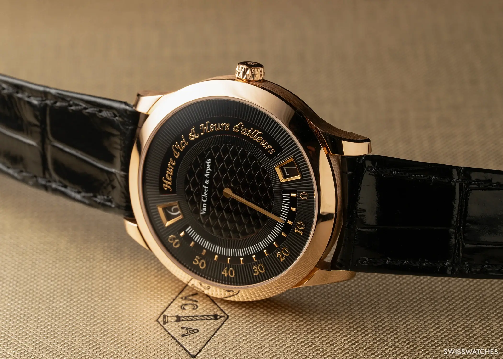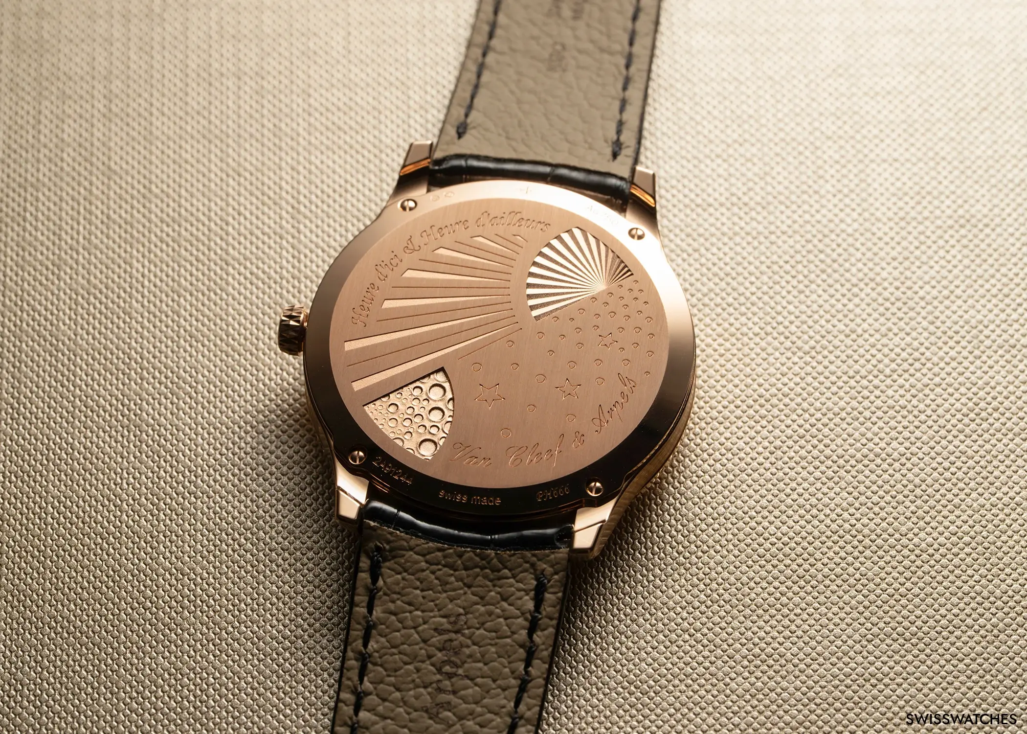 Das Gehäuse der Midnight Heure d’ici & Heure d’ailleurs hat einen Durchmesser von 38 mm und ist aus Roségold gefertigt. Mit seiner warmen Farbgebung harmoniert das polierte und satinierte Metall mit dem glänzenden, braunen Zifferblatt und den darauf befindlichen roségoldenen Details. Auch die Krone stellt mit ihrem Rautenmuster eine visuelle Verbindung zum Piqué-Muster auf dem Zifferblatt her. Gemäß der für die Van Cleef & Arpels’ typische „Poesie der Zeit”-Philosophie ziert eine verträumte Gravur den geschlossenen Gehäuseboden. Diagonal verlaufend sind auf der oberen Seite des Gehäusebodens eine guillochierte Sonne und in kursiver Schrift der Modellname zu sehen. Darunter befindet sich eine Darstellung des Mondes samt Sternenhimmel und dem Namen der Maison.
