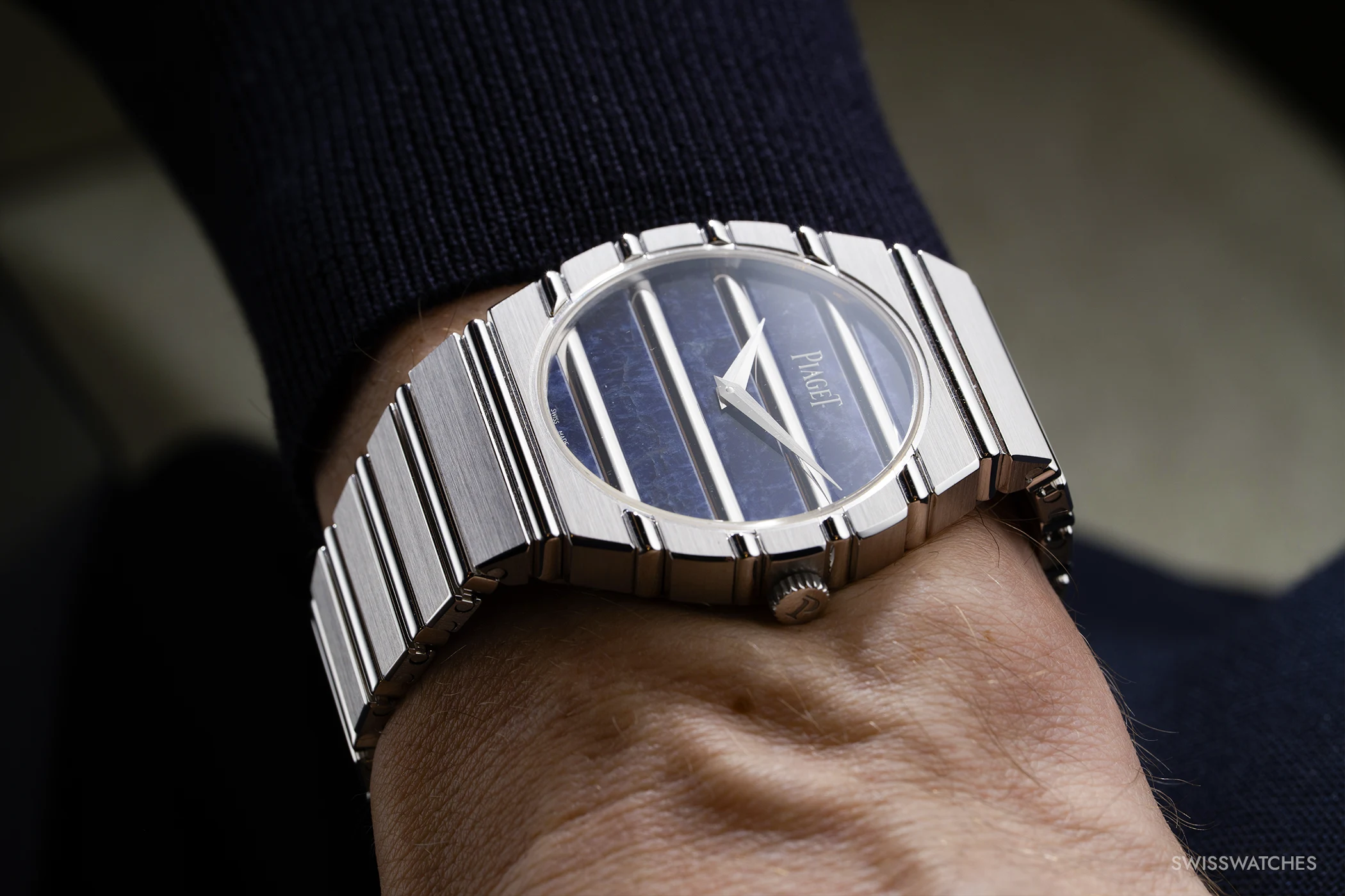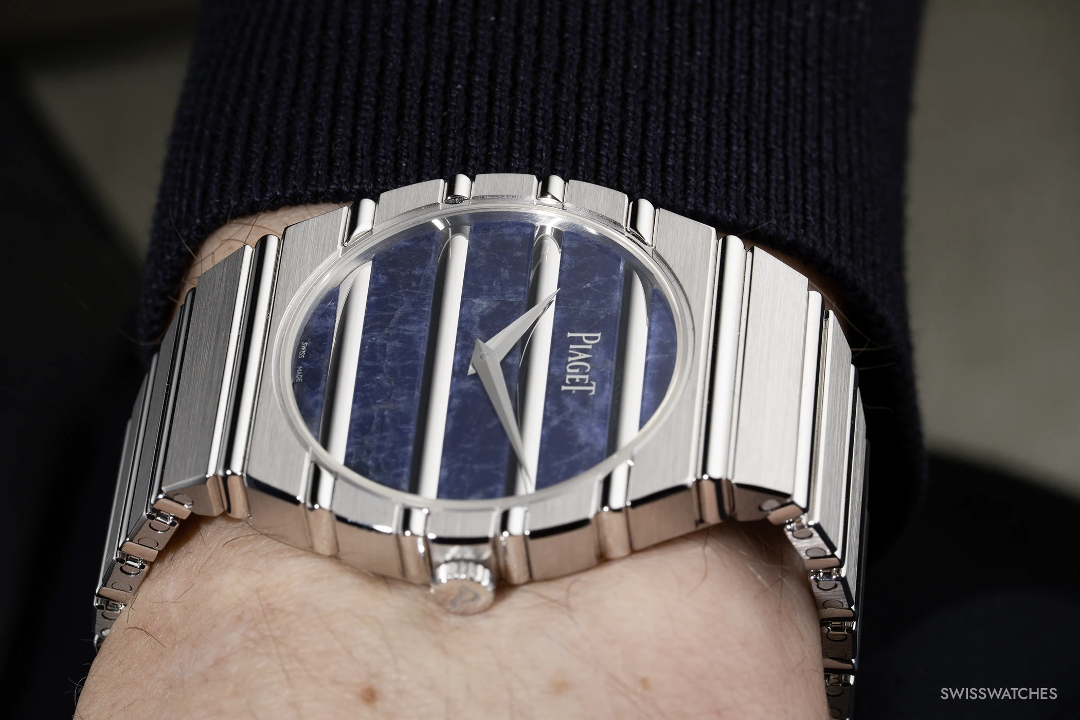 Anlässlich ihres 150-jährigen Bestehens im Jahr 2024 kehrte Piaget mit der Lancierung der Polo 79 zum ursprünglichen Design seines Klassikers zurück. Während dieses Modell in warmem Gelbgold erstrahlte, präsentiert sich die neueste Variante nun in einer edlen Kombination aus Weißgoldgehäuse und einem dunkelblauen Sodalith-Zifferblatt.
