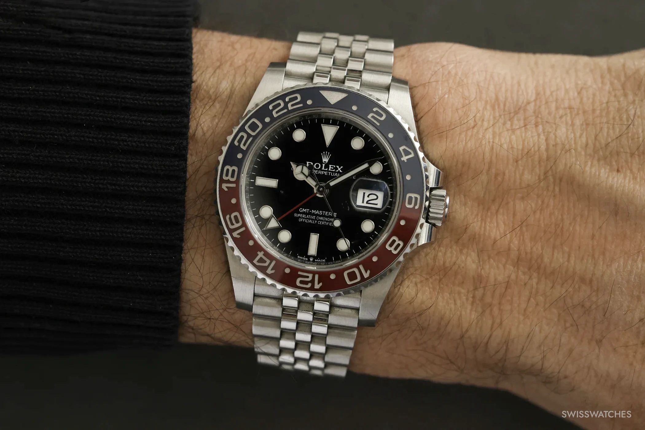 Im Inneren der aktuellen Pepsi arbeitet das Kaliber 3285. Rolex beschreibt es als vollständig intern entwickeltes und gefertigtes Automatikwerk mit Chronergy-Hemmung, blauer Parachrom-Spirale, Paraflex-Stoßsicherungen und rund 70 Stunden Gangreserve. Hinzu kommen jene Funktionen, auf die es bei einer GMT-Master II im Alltag tatsächlich ankommt: Der unabhängig verstellbare Stundenzeiger, die 24-Stunden-Anzeige für die Referenzzeit, das springende Datum und der Sekundenstopp. Die Präzision gibt Rolex mit –2/+2 Sekunden pro Tag nach dem Einschalen an – im Rahmen des Standards „Chronometer der Superlative“. Dazu passt auch, dass Rolex die GMT-Master II nicht nur als Uhr für zwei Zeitzonen beschreibt, sondern sie zugleich in den eigenen Rahmen aus Präzision, Robustheit und Alltagstauglichkeit einordnet.