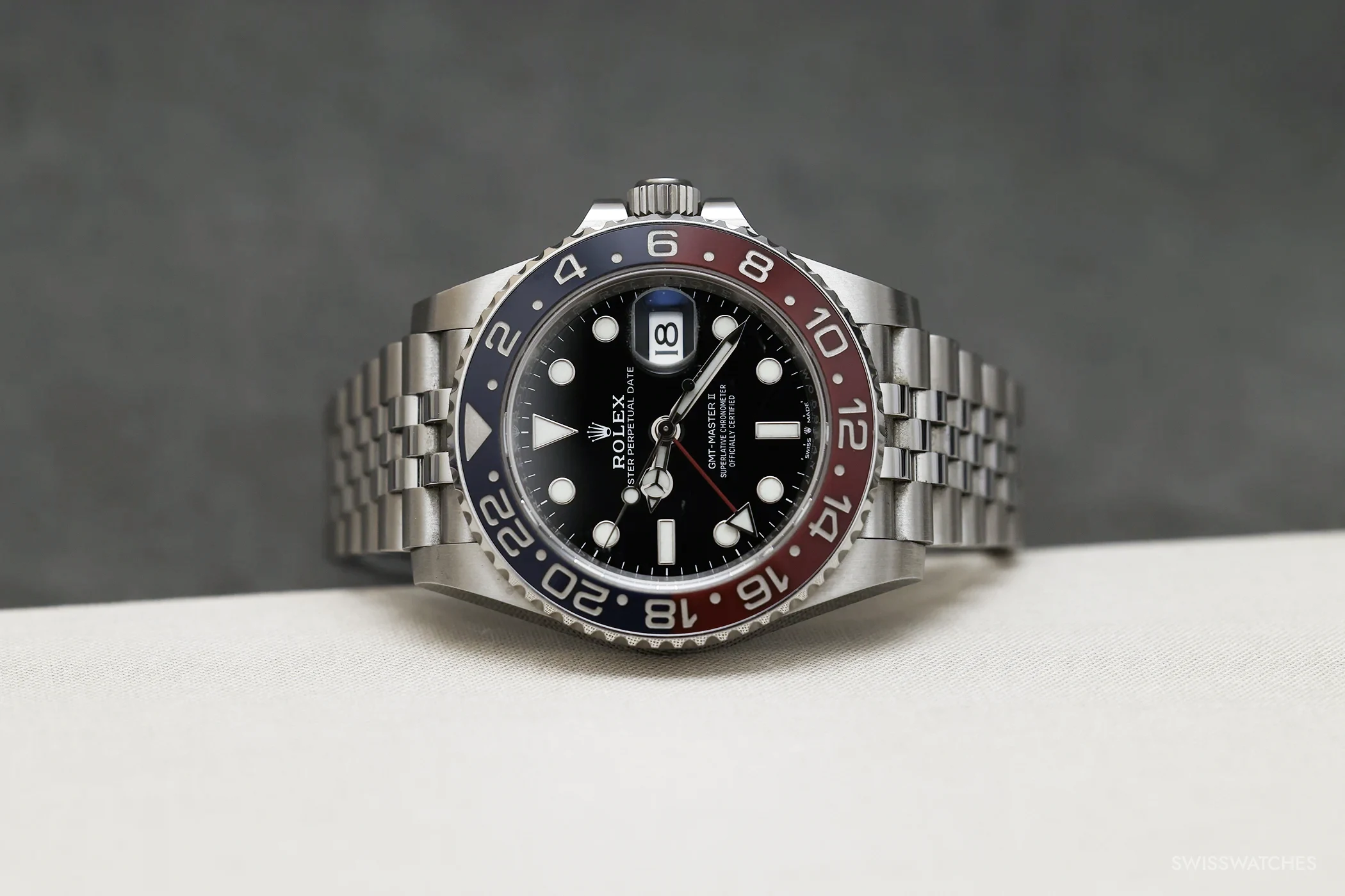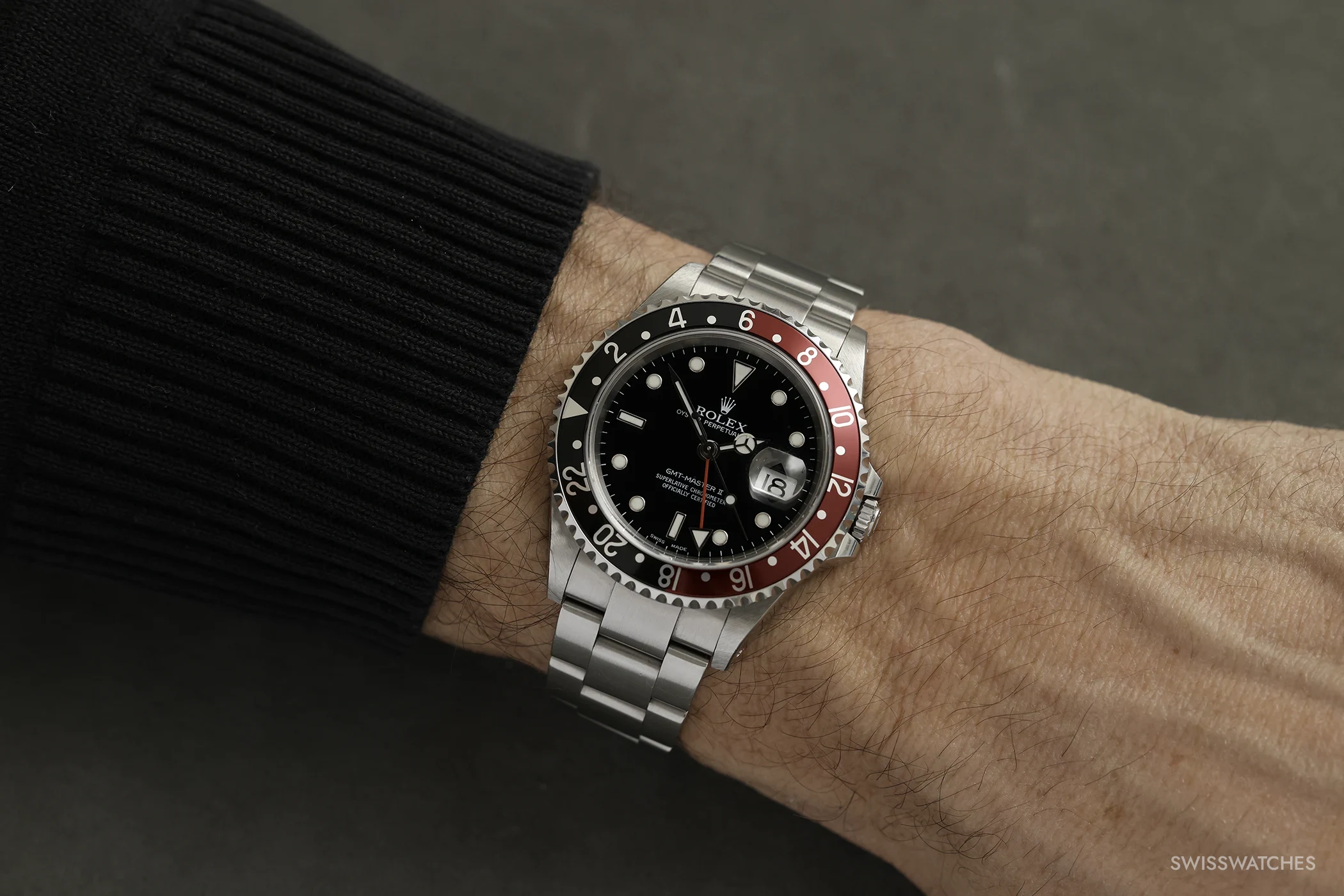 Damit verändert sich die Bedienung der Uhr spürbar. Auch die klassische GMT-Master konnte bereits zwei Zeitzonen anzeigen; mit der GMT-Master II lassen sich Referenzzeit und Lokalzeit jedoch erstmals unabhängig voneinander handhaben. Der 24-Stunden-Zeiger behält die Referenzzeit bei, während sich die Lokalzeit über den Stundenzeiger in Einstundenschritten verstellen lässt; das Datum ist an diese Lokalzeit gekoppelt und springt beim Überschreiten von Mitternacht mit. Gerade auf Reisen ist das der entscheidende praktische Unterschied: Nach einem Zeitzonenwechsel muss nicht mehr die gesamte Anzeige neu eingestellt werden, sondern nur noch die lokale Stunde.