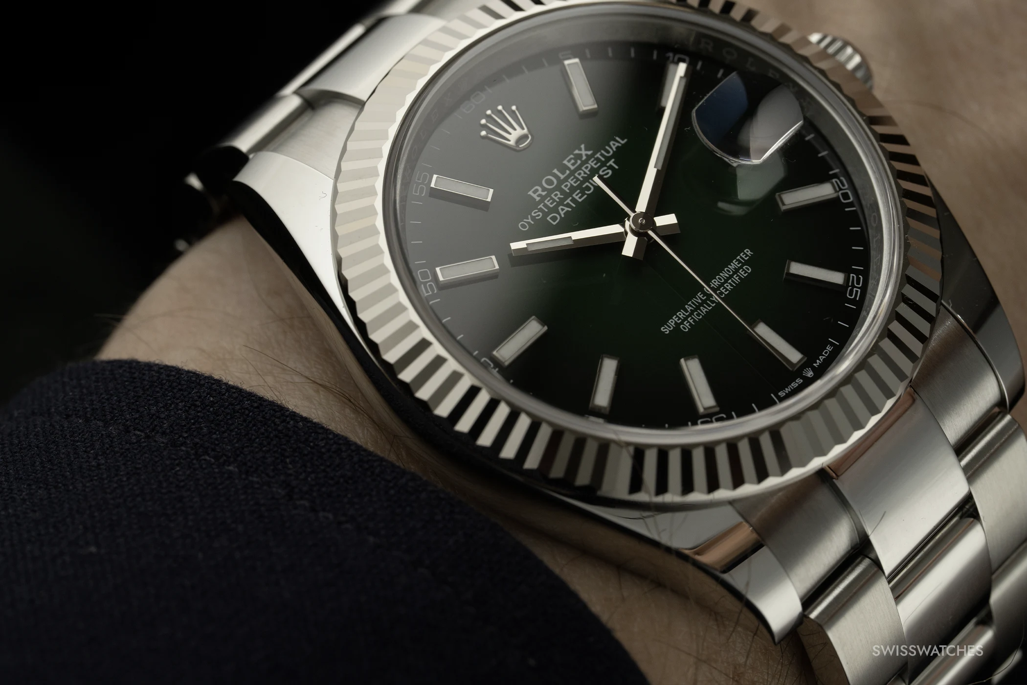 Wenn man beim Thema Rolex über Farbe spricht, landet man früher oder später bei Grün. Genau deshalb wirkt die neue Datejust 41 mit grün lackiertem Ombré-Zifferblatt so folgerichtig. Die Uhr erscheint in Rolesor weiß, also Edelstahl Oystersteel mit Weißgoldlünette, und verbindet damit eine sehr vertraut wirkende Designsprache mit einem Modell, das für den Design-Code dieses Zifferblatts völlig neu ist. Besonders interessant: Das Ombré-Zifferblatt wird hier vollständig per Lackierung hergestellt. Seit Rückkehr der Ombré-Zifferblätter im Jahre 2019 ist das laut Rolex eine Premiere. Erst wird grüner Lack aufgetragen, anschließend der dunkle Verlauf durch konzentrisch aufgesprühten schwarzen Lack erzeugt.