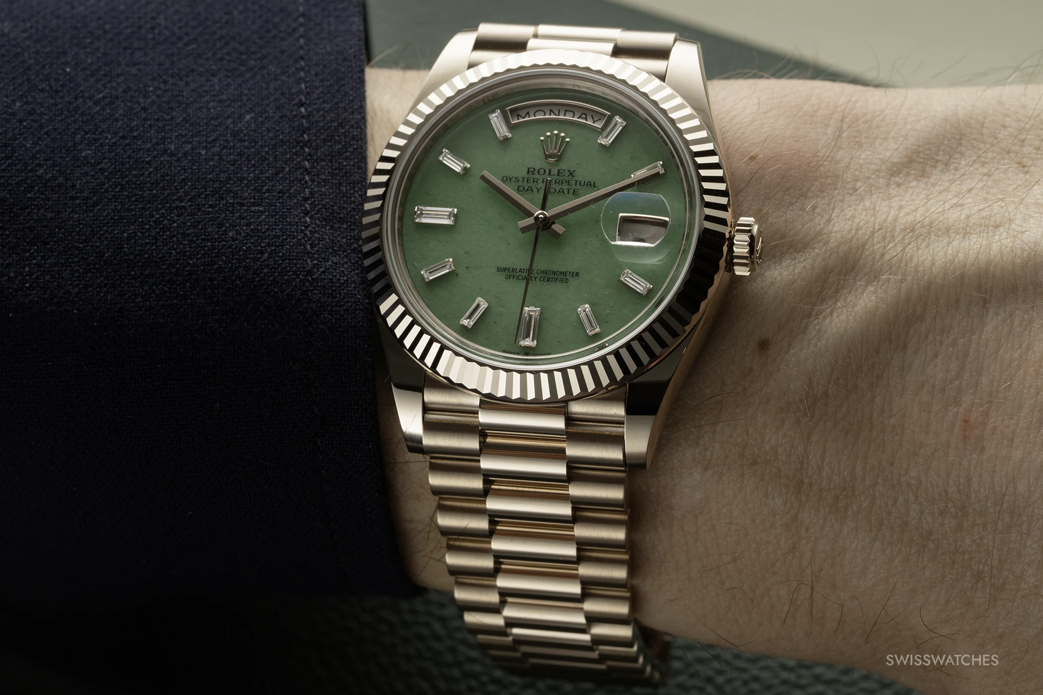 Passend dazu kombiniert Rolex das neue Material mit einem hellgrünen Aventurin-Zifferblatt aus Naturstein und einem Stundenring aus zehn Diamanten im Baguetteschliff. Hinzu kommen die geriffelte Lünette und das berühmt berüchtigte President-Band mit verdeckter Crownclasp. Technisch bleibt die Uhr auf vertrautem Terrain: Im Inneren arbeitet das Kaliber 3255 mit Tages- und Datumsanzeige sowie rund 70 Stunden Gangreserve.