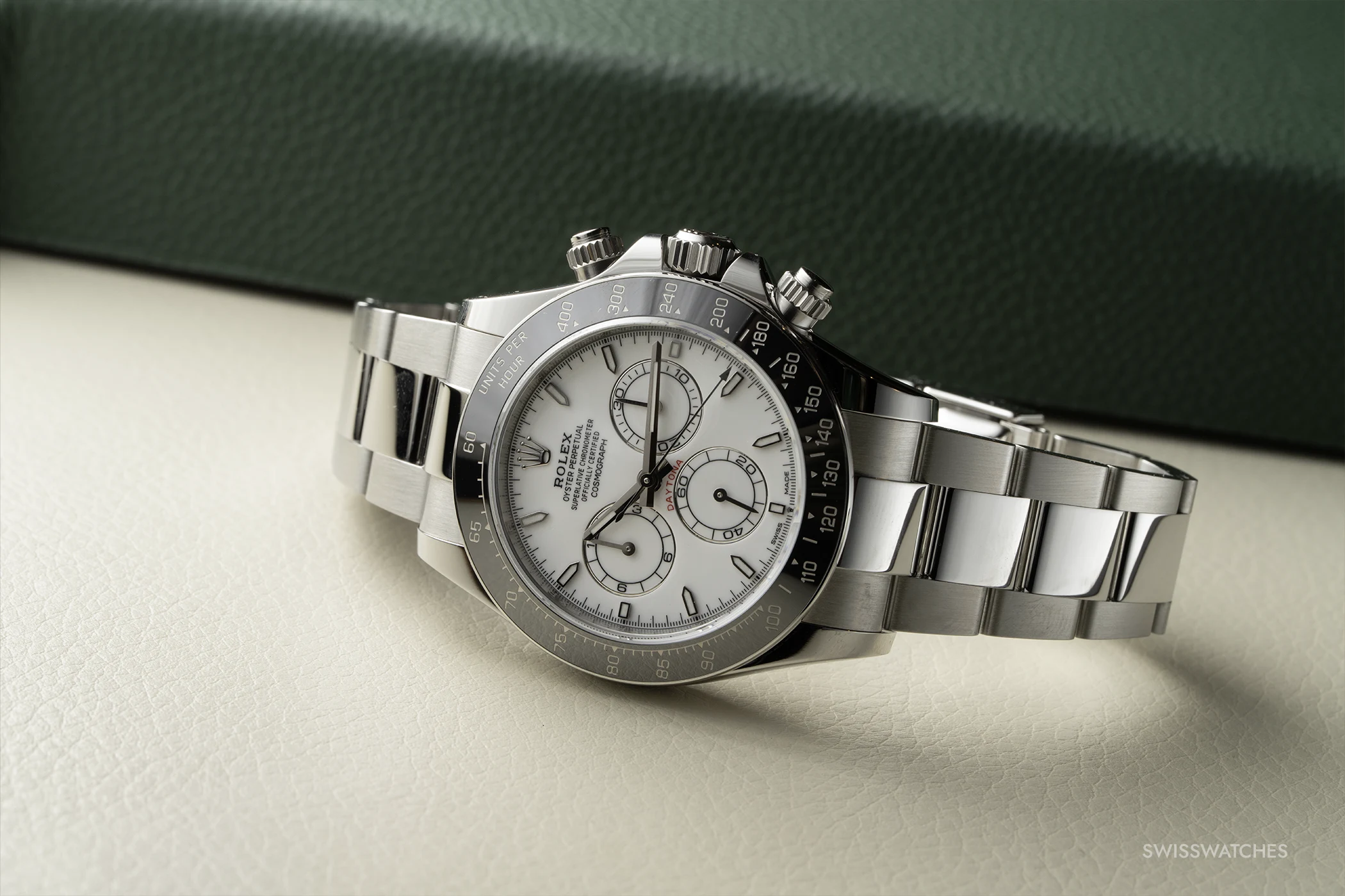 Auffällig ist dabei, wie breit Rolex das Jubiläum interpretiert. Die Oyster Perpetual wird zum zentralen Schauplatz des Jubiläums, die Datejust 41 greift mit einem grün lackierten Ombré-Zifferblatt tief ins Markenerbe, die Yacht-Master II kehrt technisch und ergonomisch neu aufgestellt zurück, die Day-Date 40 führt mit Jubilee Gold eine neue hauseigene Legierung ein und der Cosmograph Daytona erscheint erstmals als Rolesium-Variante mit weiß emailliertem Zifferblatt und neuartiger anthrazitfarbener Cerachrom-Lünette. Es ist also ein Jahr der gezielten Weiterentwicklung – und eines, in dem Rolex seine bekanntesten Modelle mit ungewöhnlich viel inhaltlichem Input auflädt.
