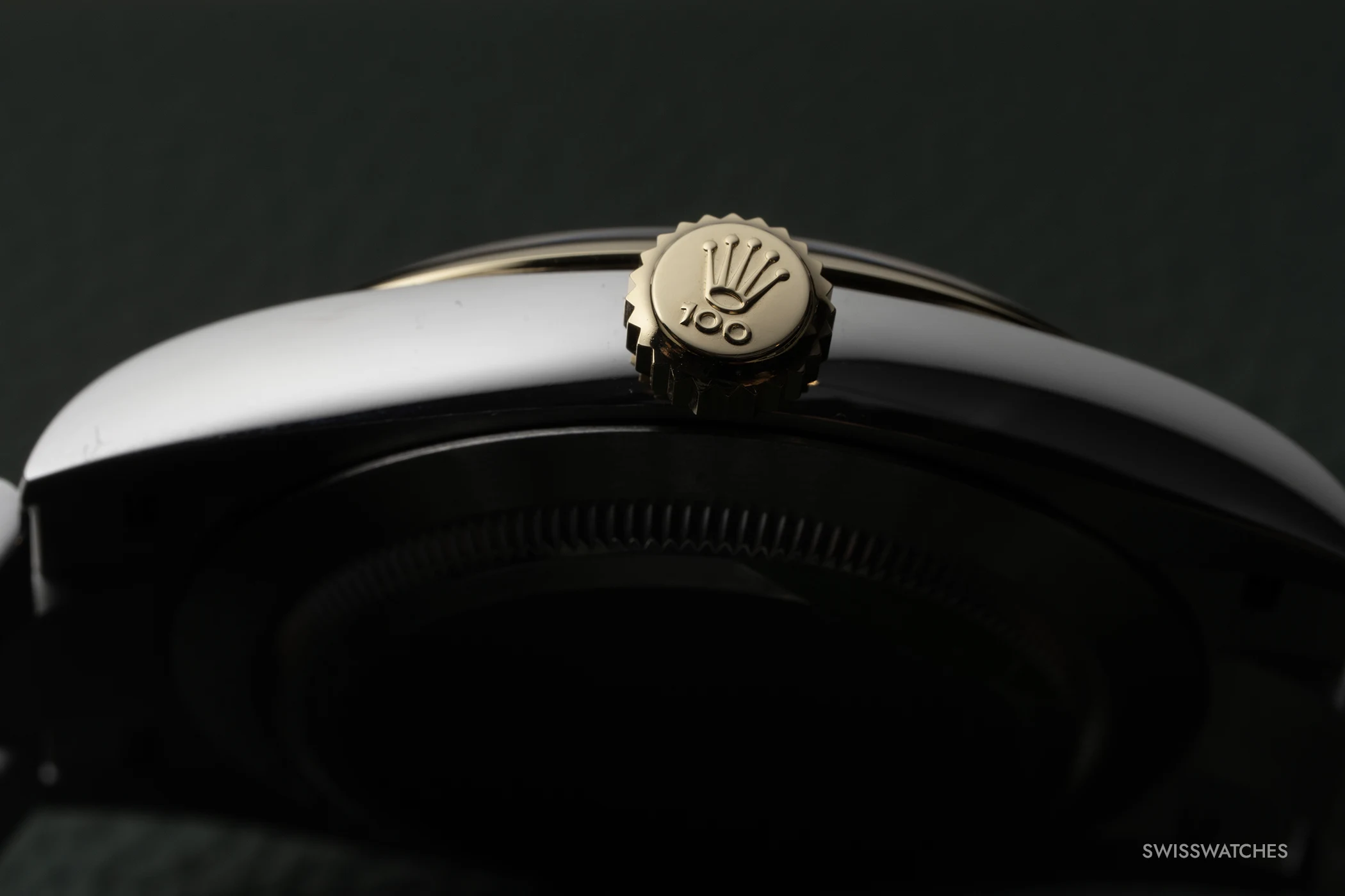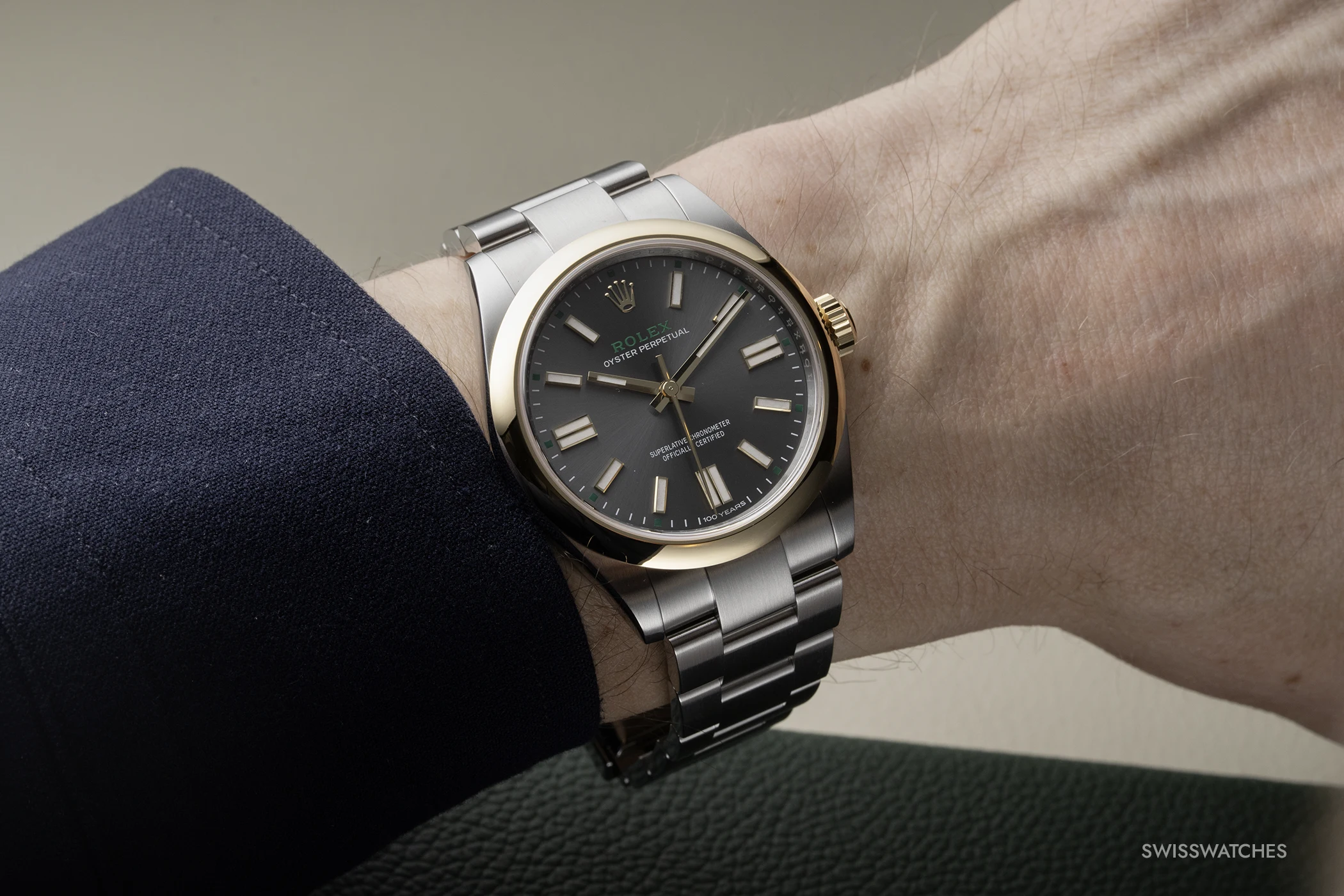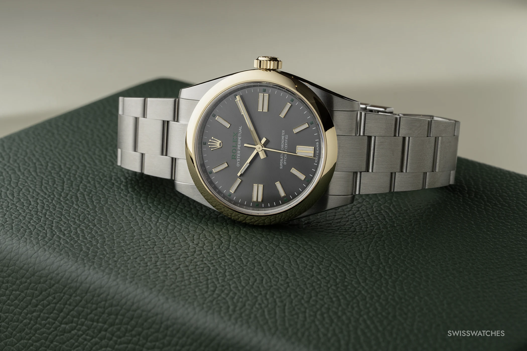 Die vielleicht wichtigste Version innerhalb dieser Familie ist die neue Oyster Perpetual 41 in Rolesor gelb. Allein das ist schon ziemlich außergewöhnlich, denn die Kombination aus Edelstahl Oystersteel und Gelbgold hielt bislang in dieser Form keinen Einzug in die aktuelle Oyster-Perpetual-Linie. Rolex kombiniert hier eine Lünette und Aufzugskrone in Gelbgold mit einem ansonsten vollkommen stählernen Aufbau. Richtig gelesen, auch die Mittelelemente des Armbands bestehen bei diesem Modell komplett aus Oystersteel. Das schiefergraue Zifferblatt verweist zugleich direkt auf das Jubiläum: Die Krone trägt die Reliefzahl „100“, auf sechs Uhr steht statt „Swiss Made“ nun „100 years“, und auch der grüne Rolex-Schriftzug sowie die grünen Quadrate der Minuterie spielen mit den klassischen Farbcodes der Marke. Es ist eine Uhr, die historisches Pathos erstaunlich kontrolliert in eine für heutige Verhältnisse, angemessene Designsprache übersetzt.