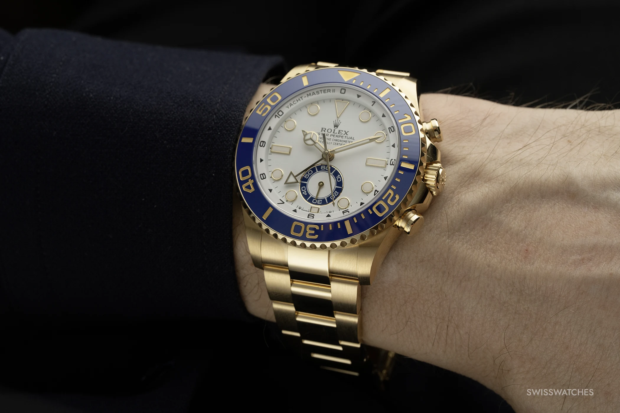 Auch gestalterisch hat Rolex spürbar nachgeschärft. Das matt weiß lackierte Zifferblatt reduziert Reflexionen, große Professional-Indizes verbessern die Ablesbarkeit, und die blau keramisierte Cerachrom-Lünette sorgt für einen klaren maritimen Akzent. Besonders spannend ist, dass sich Countdown-Minuten- und Countdownsekundenzeiger gegen den Uhrzeigersinn drehen – eine Premiere im Hause Rolex. Das ist kein Gimmick, sondern eine echte Funktionsverbesserung, weil die ablaufende Zeit so unmittelbar lesbarer wird. Zugleich hilft die Lünette in der Ausgangsstellung dabei, die letzten 30 Sekunden der letzten Countdown-Minute präziser zu erfassen. Man merkt der neuen Yacht-Master II an, dass Rolex hier nicht nur obligatorische Modellpflege betreibt, sondern ein tatsächliches Instrument und dessen Funktion verbessern wollte.
