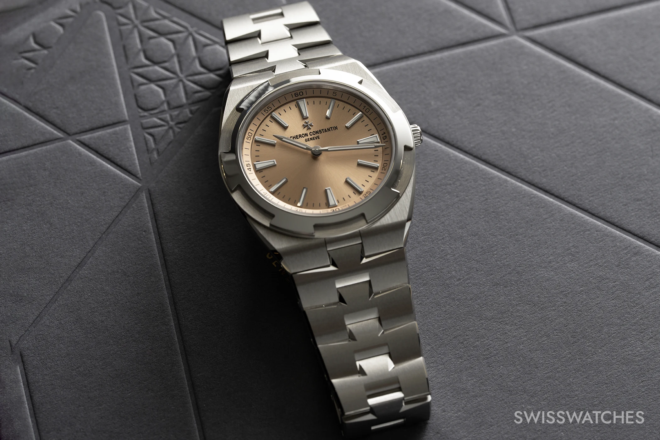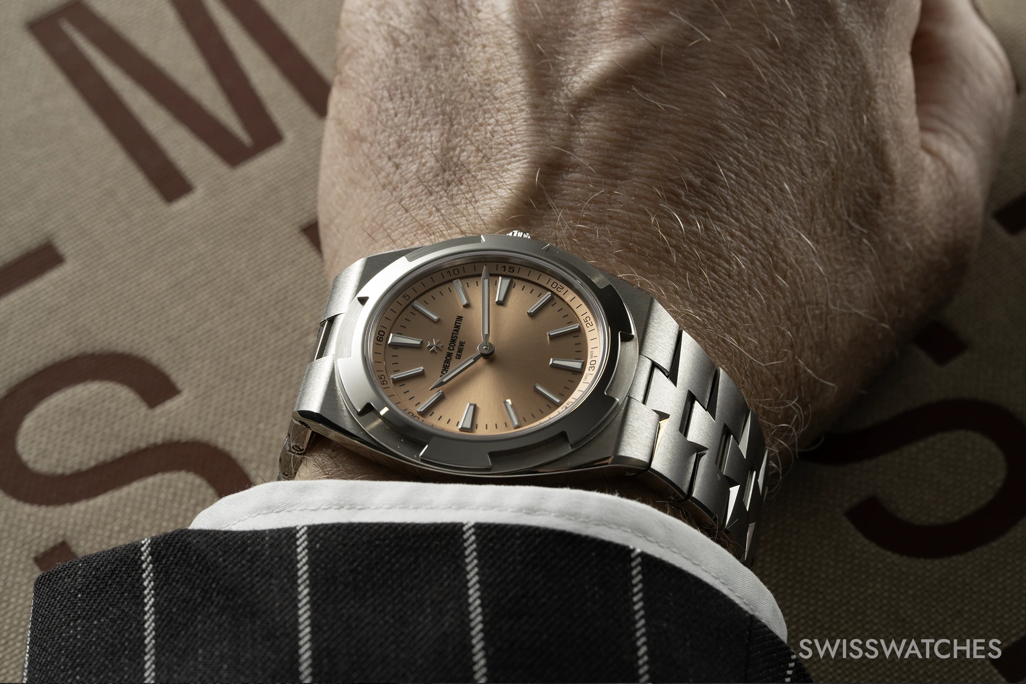 Das neu entwickelte Werk erlaubt eine Gesamthöhe der Uhr von lediglich 7,35 Millimetern. Damit ist sie die flachste Overseas aller Zeiten. Mit einem Durchmesser von 39,5 Millimetern liegt das Modell für eine Uhr mit integriertem Metallarmband im mittleren Bereich. Zum ersten Mal setzt Vacheron Constantin bei der Overseas auf ein Gehäuse aus Platin. Die seltene 950er-Platin-Legierung besteht aus 95 % Platin und 5 % Kupfer und Gallium. Durch diese Zusätze entsteht ein Material, das 2,7-mal härter ist als gängige 950er-Platin-Legierungen. Das sorgt für weniger Kratzer auf dem sonst recht weichen Edelmetall.