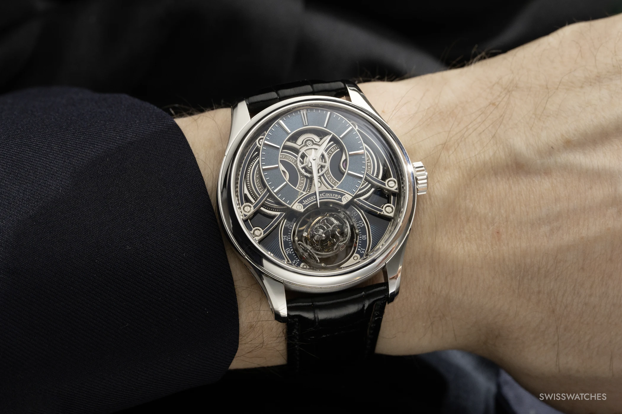 Das Werk ist in einem 42 Millimeter großen Platingehäuse untergebracht, das 16,15 Millimeter hoch ist. Auch das Gehäuse selbst zeigt einen durchdachten Finissierungsansatz mit polierten, satinierten und mikrogestrahlten Flächen, die das visuelle Spiel des Kalibers aufnehmen. Dazu kommt ein blaues Alligatorlederband mit einer Faltschließe aus 18 Karat Weißgold. Die Uhr ist auf 20 Exemplare limitiert und kostet 715.000 Euro.