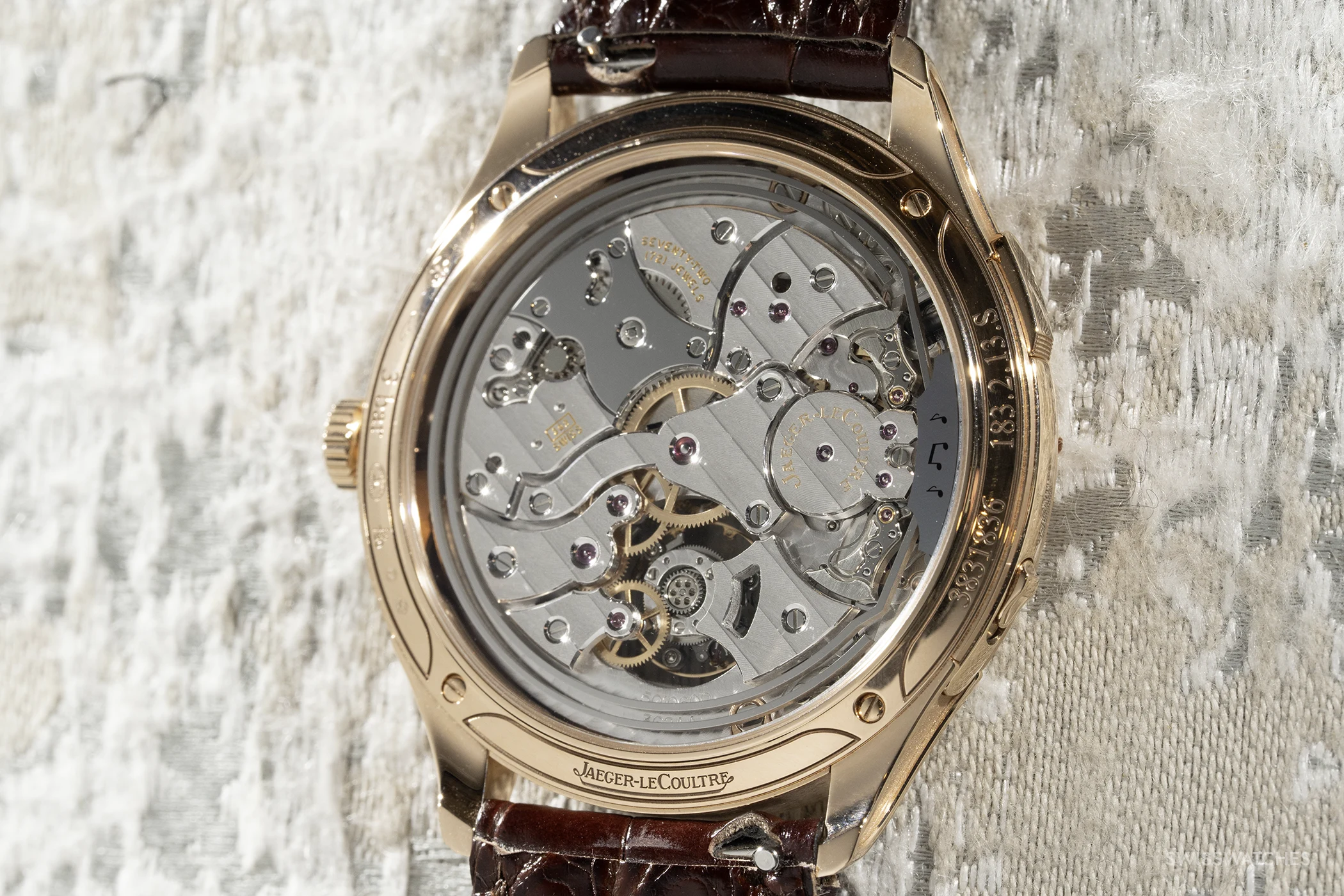 Ein solches System verlangt dem Werk enorme Energiemengen ab, insbesondere bei einer Frequenz von 4 Hertz. Eine stabile Amplitude über mehrere rotierende Käfige hinweg zu halten, erfordert eine exakte Abstimmung von Gewicht, Reibung und Energieübertragung. Jaeger-LeCoultre begegnet dem mit einem konsequenten Einsatz leichter Materialien, darunter Titan für die Käfige sowie Keramikkugellager zur Reibungsreduktion an den Drehpunkten. So entsteht ein Werk, das hohe Frequenz und große mechanische Komplexität miteinander vereint und dennoch 72 Stunden Gangreserve bietet.