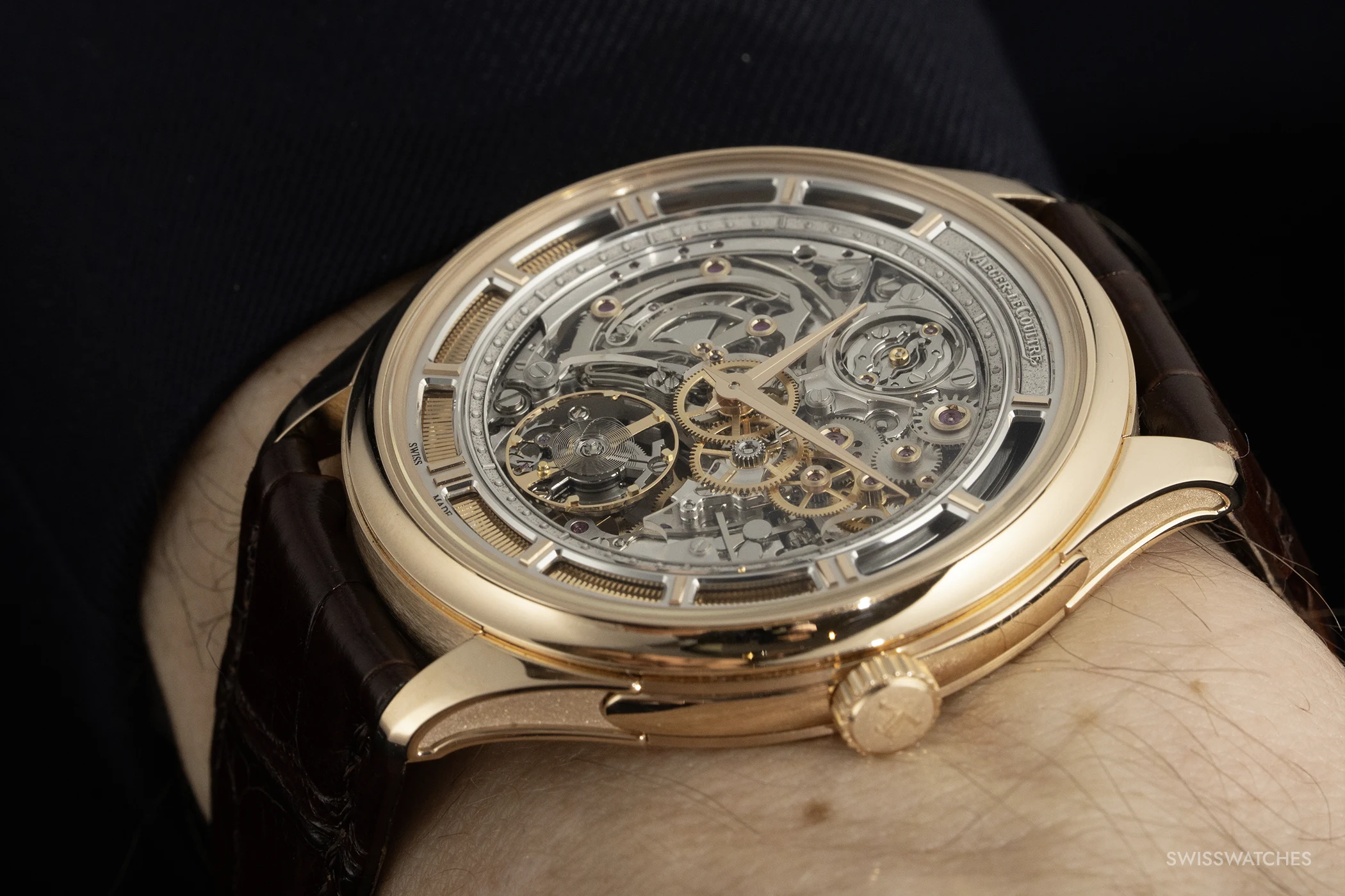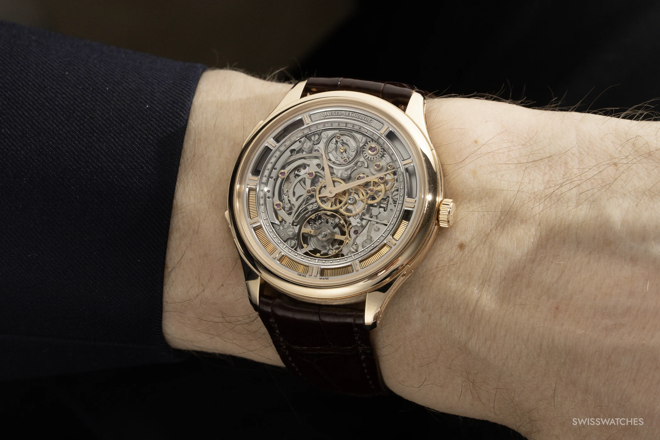 Flache Minutenrepetitionen stehen vor einem grundsätzlichen Problem: Je geringer das Volumen von Gehäuse und Werk, desto schwächer fällt in der Regel die Resonanz aus. Der Klang verliert an Kraft und Reichweite. Jaeger-LeCoultre begegnet dem mit einer Kombination aus konstruktiven und akustischen Innovationen, darunter Tonfedern mit quadratischem Querschnitt, die steifer sind und den Klang besser übertragen, sowie Trebuchet-Hämmer, die eine gleichmäßigere Schlagkraft liefern. Ein patentierter Mechanismus verkürzt zudem die Stille zwischen den Tonfolgen, wodurch die akustische Sequenz flüssiger und geschlossener wirkt.
