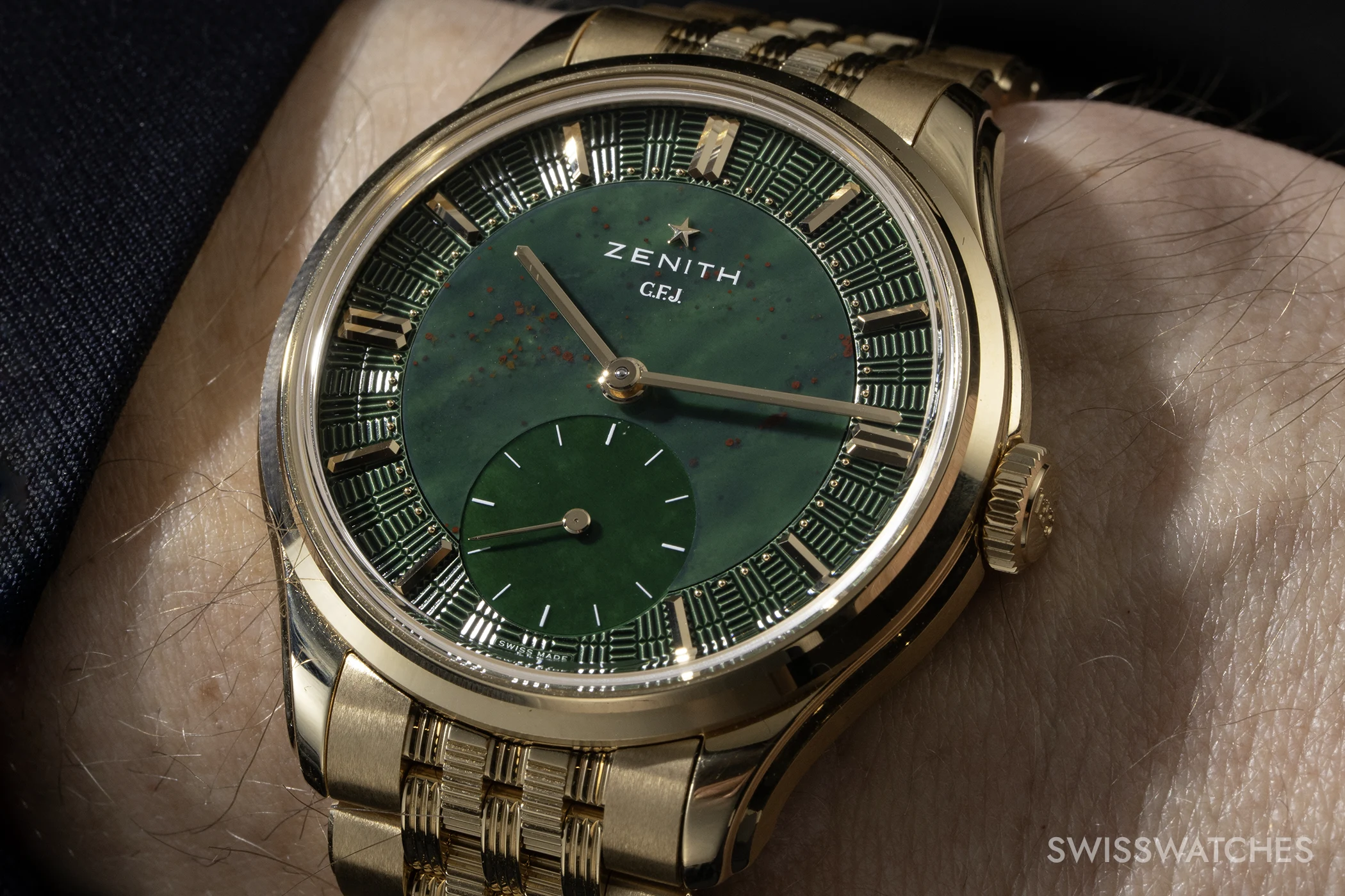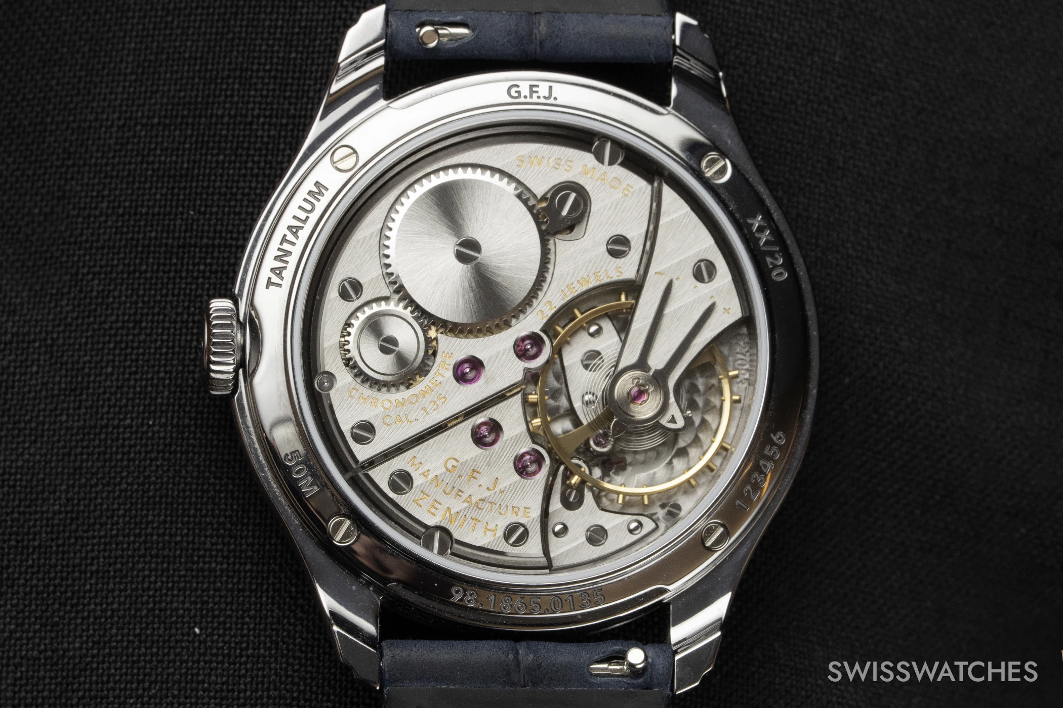 Als Zenith mit der G.F.J. eine neue Kollektion vorstellte, ging es deshalb nicht einfach um eine hübsch verpackte Neuauflage des 135er Kalibers. Eigentlich stand von Anfang an nur das Werk im Mittelpunkt. Die Uhr an sich diente eigentlich lediglich als Rahmen dafür. Nun kommen zwei weitere Versionen hinzu, die beide auf derselben Grundlage beruhen, aber in völlig unterschiedliche Richtungen gehen: Eine G.F.J. aus Tantal in einer Auflage von 20 Stück und eine auf 161 Exemplare limitierte Ausführung in Gelbgold mit Bloodstone-Zifferblatt.