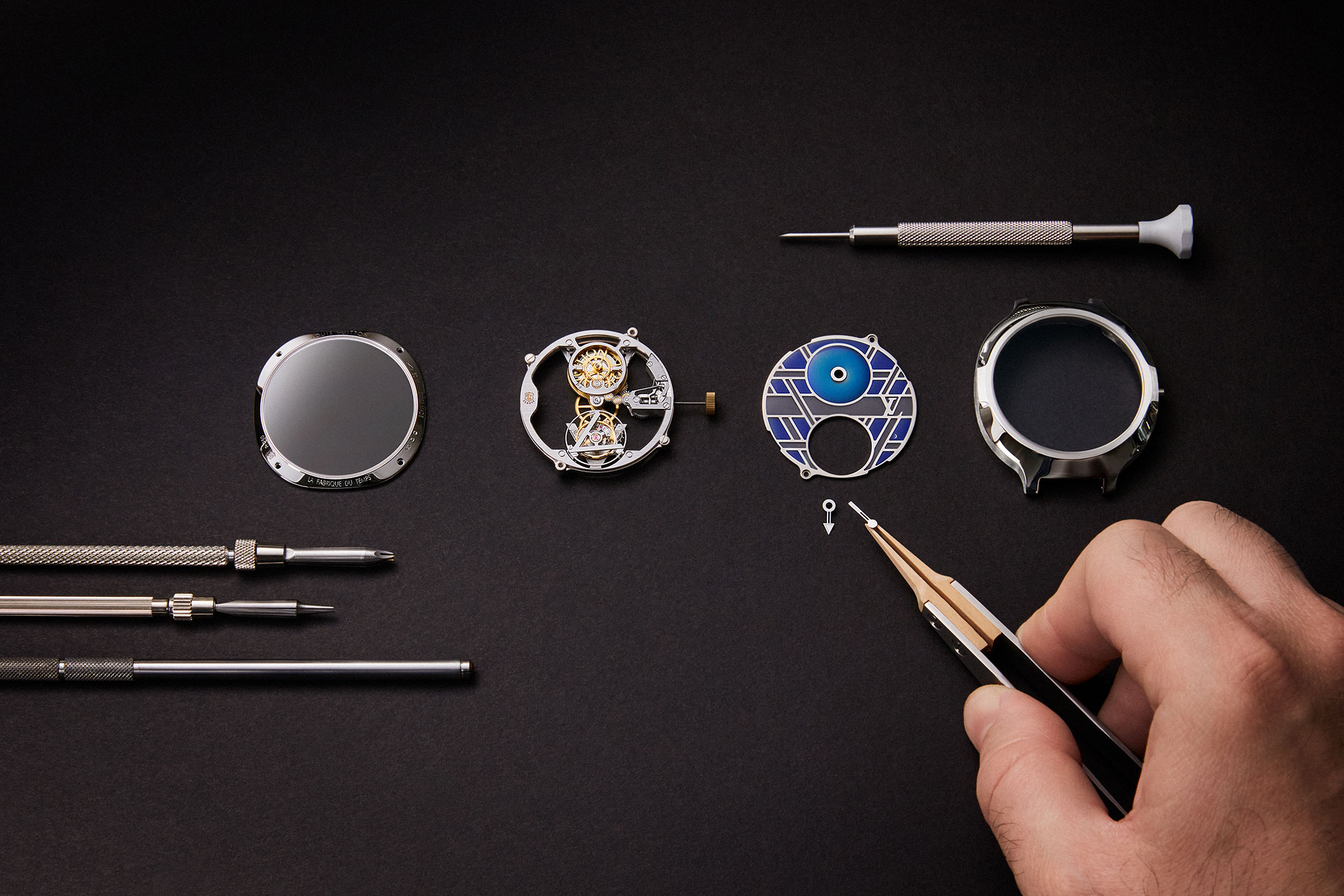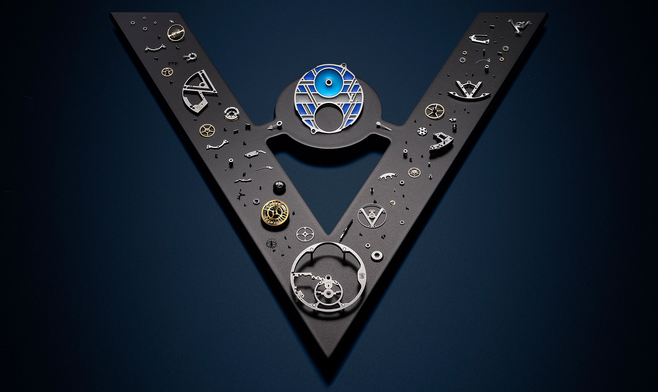 Together with its master enamellers, Louis Vuitton chose the ‘percé’ technique, which is considered the most sophisticated of the various plique-à-jour methods. Enamel is applied to the sections without any backing. Using traditional ‘capillary action fill’, the enameller applies the paint to each piece with a brush. As the paint is not applied to the back of a dial, but into the open sections, the challenge is that the enameller must work very quickly and precisely and distribute the paint evenly and without air pockets. The V-shaped pieces (here again the nod to Vuitton) are made of white gold.