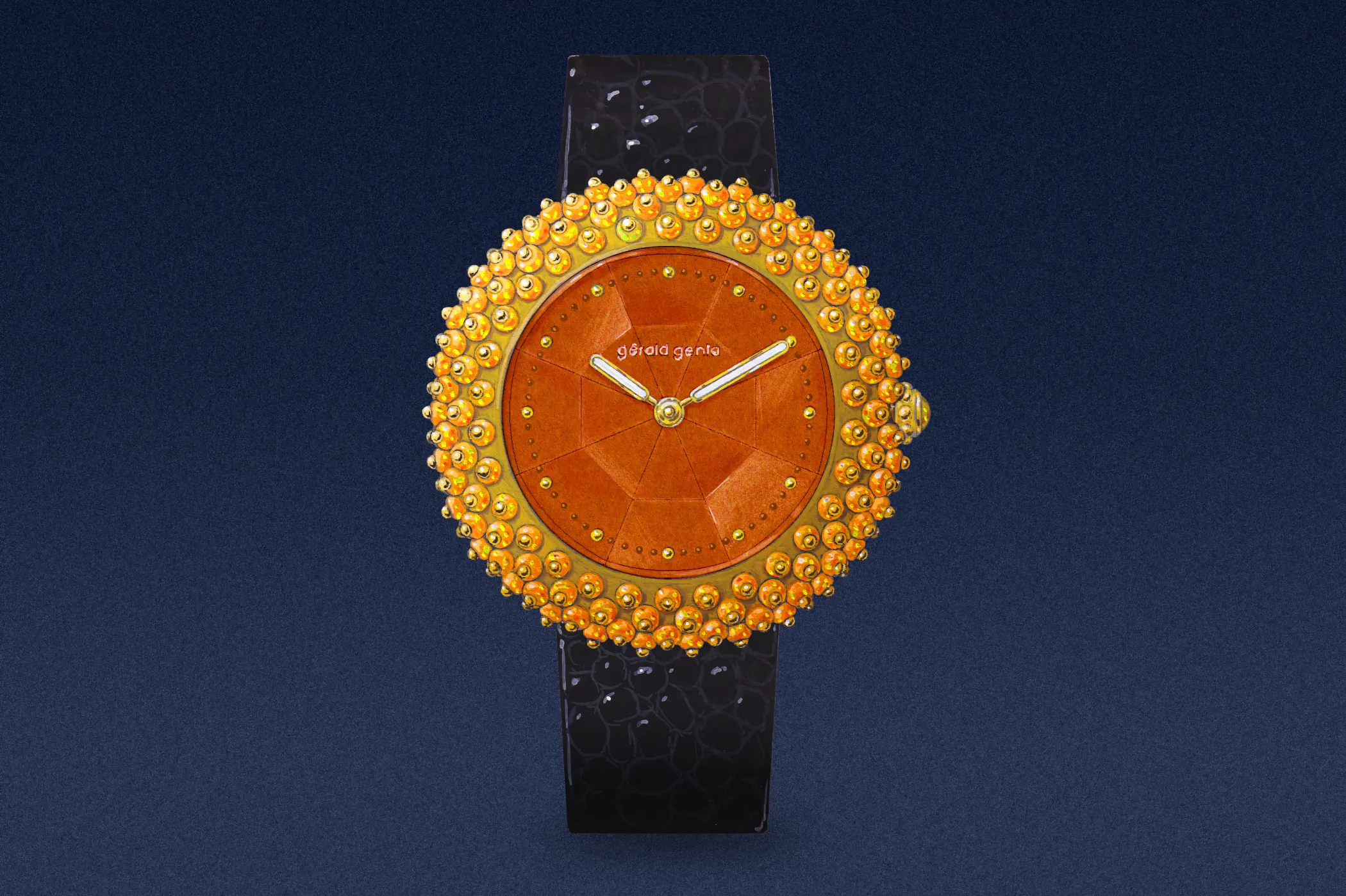 The dial of the Gentissima Oursin Fire Opal is made of vibrant orange carnelian. It features yellow gold dots for the 5-minute markers and gold hands with luminescent inlays. The warm tones of the carnelian complement the fire opals on the bezel and enhance the overall aesthetic of the watch. The flat dial is contrasted by the faceted sapphire crystal, which adds depth and dimension to the time display. The combination of materials and colours reflects Gérald Genta’s artistic vision and attention to detail.